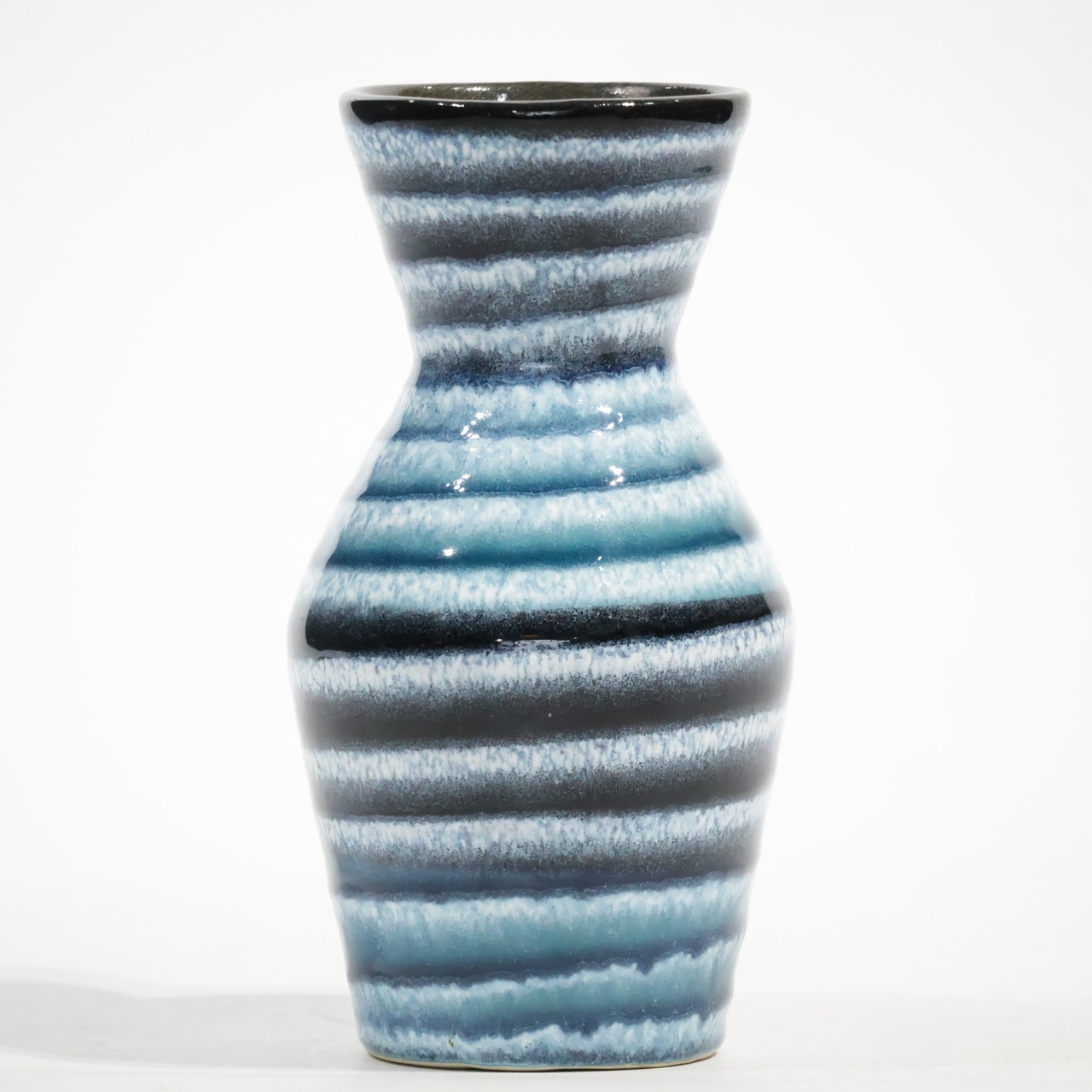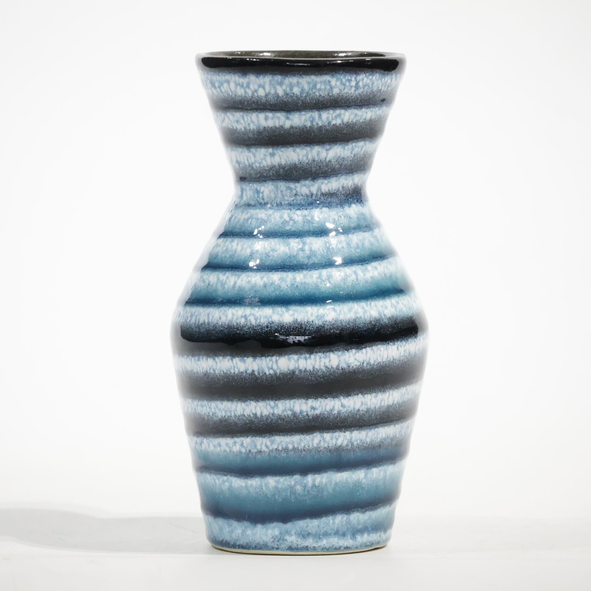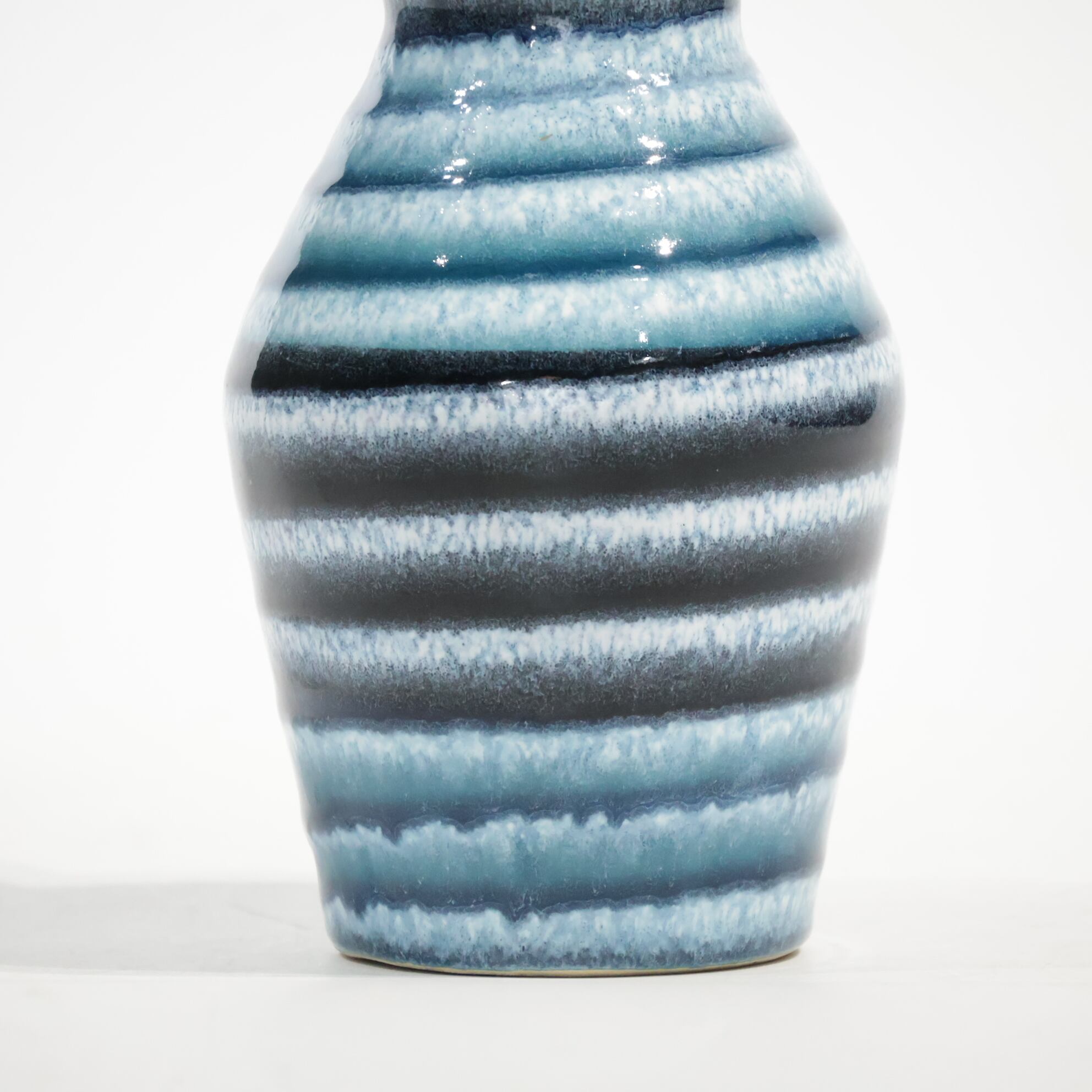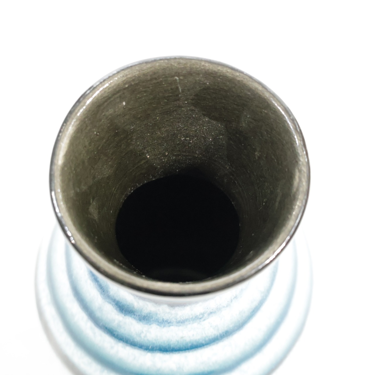 くびれを持つフォルムに、横方向へ連続する帯状の釉薬が施された一点。