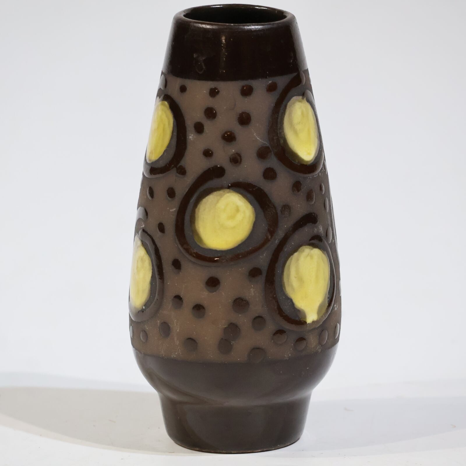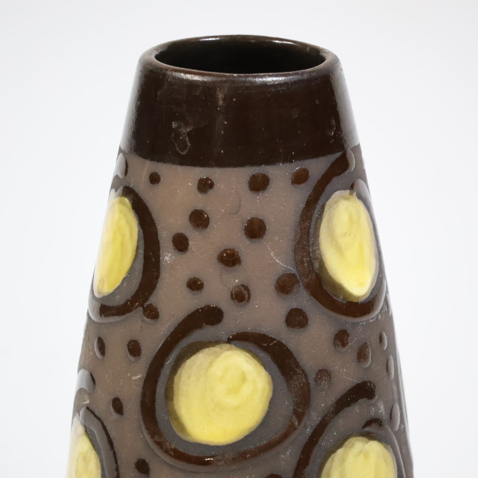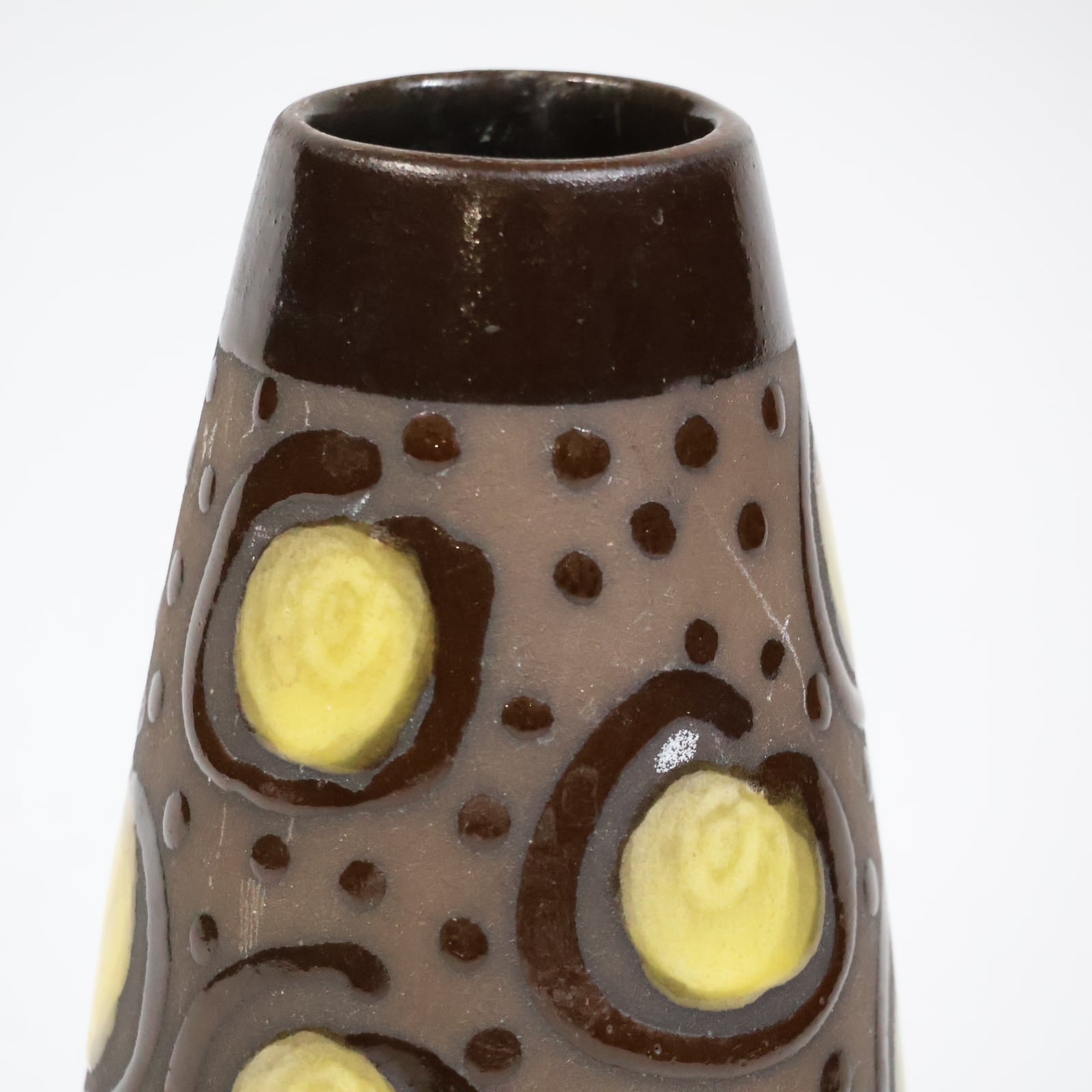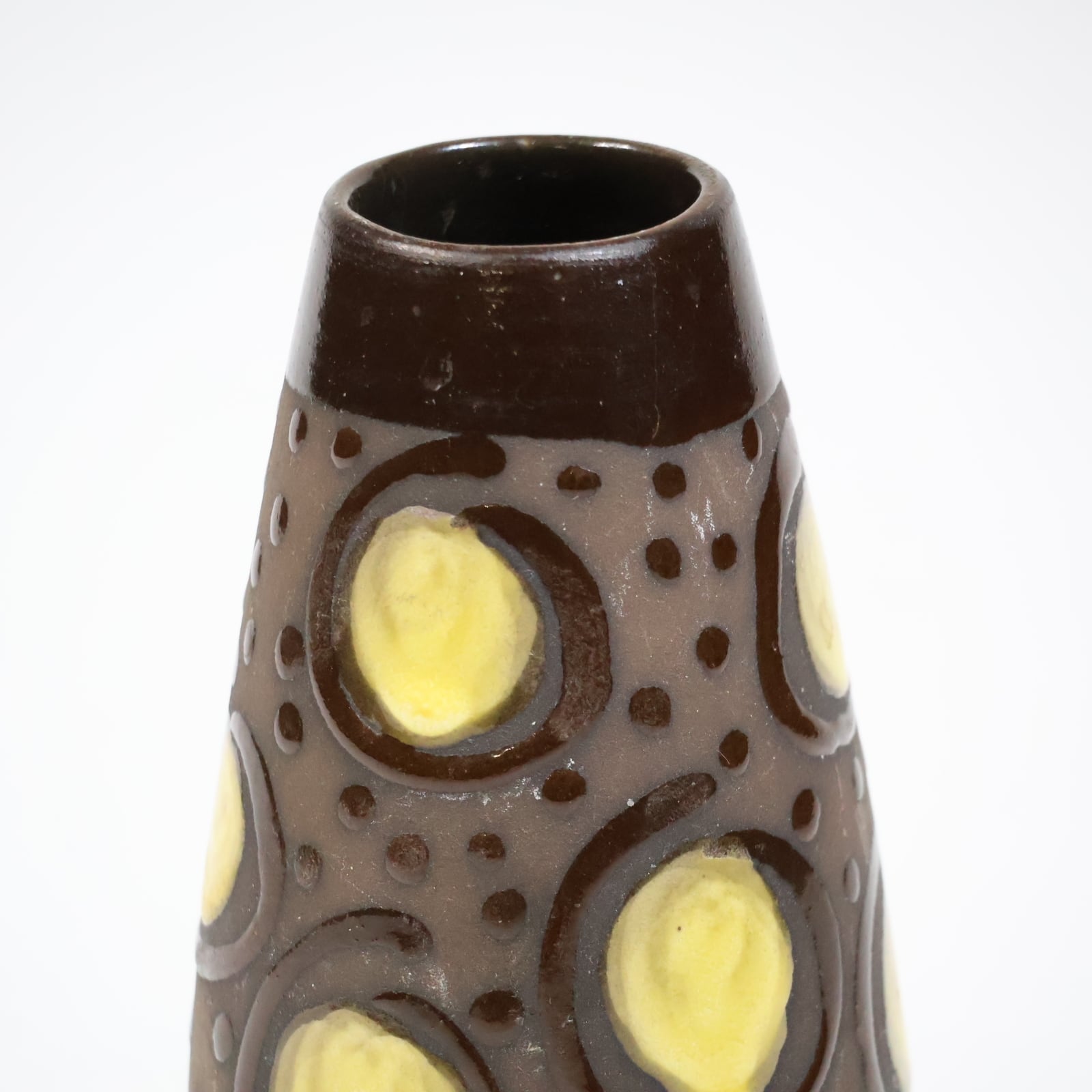 胴部に大胆に配置されたイエローの円形モチーフが目を引く一本。ダークブラウンのベースに、点刻と円環状のレリーフを組み合わせた立体的な装飾が施され、光の当たり方によって陰影が強調されます。