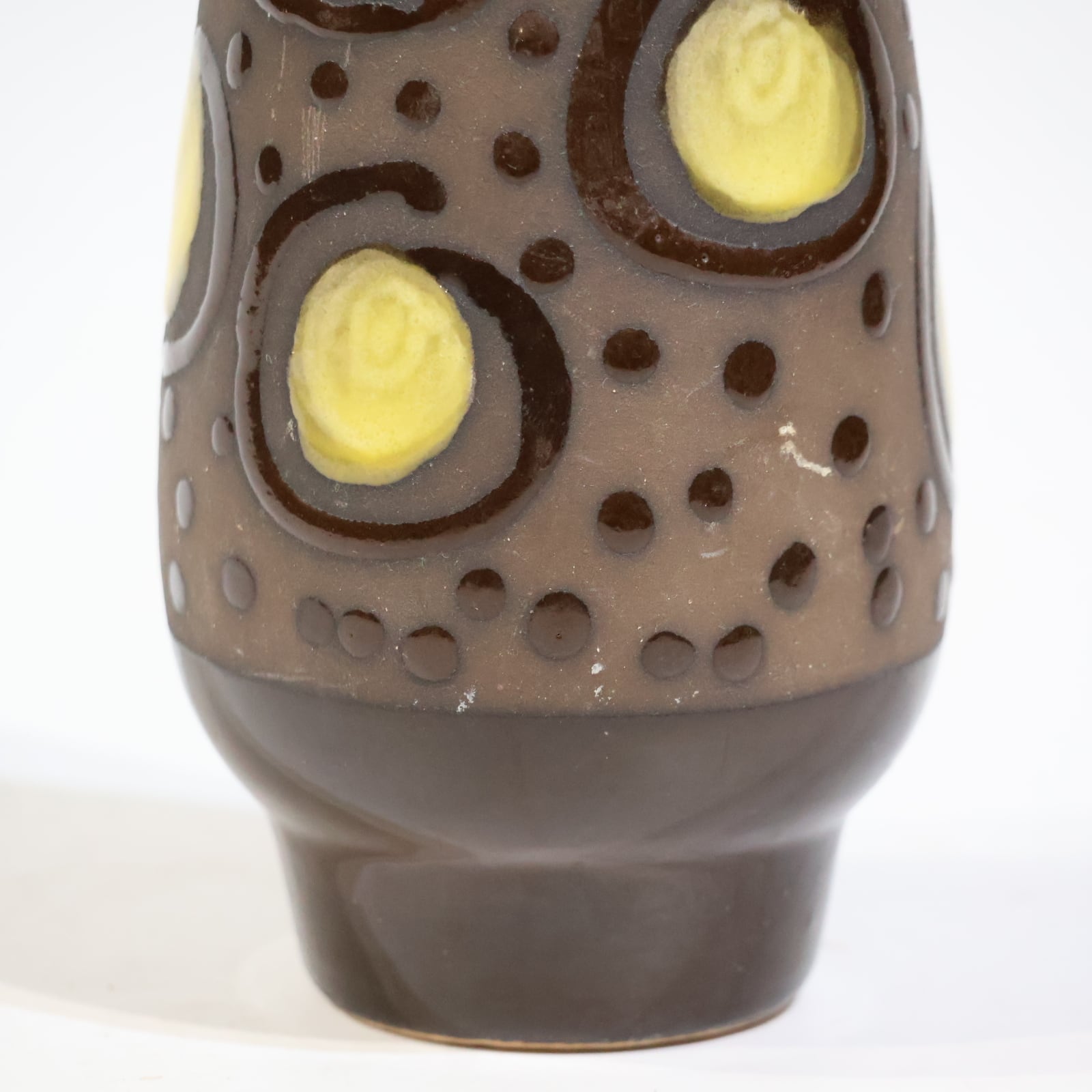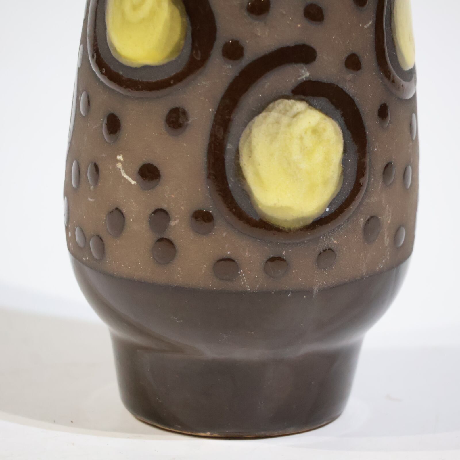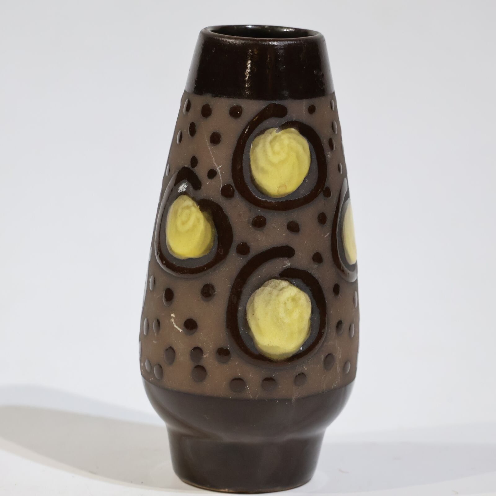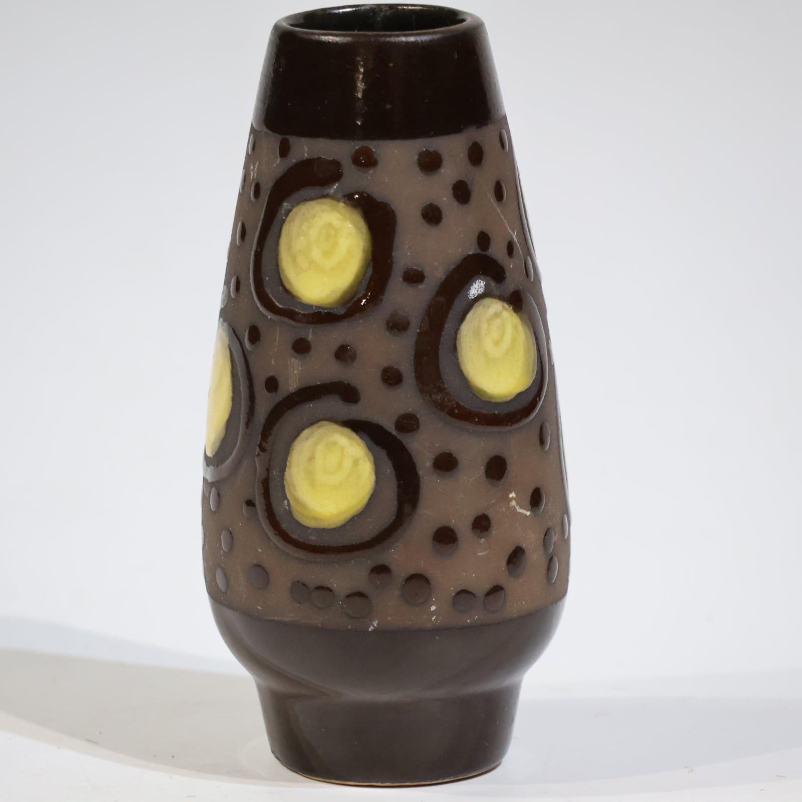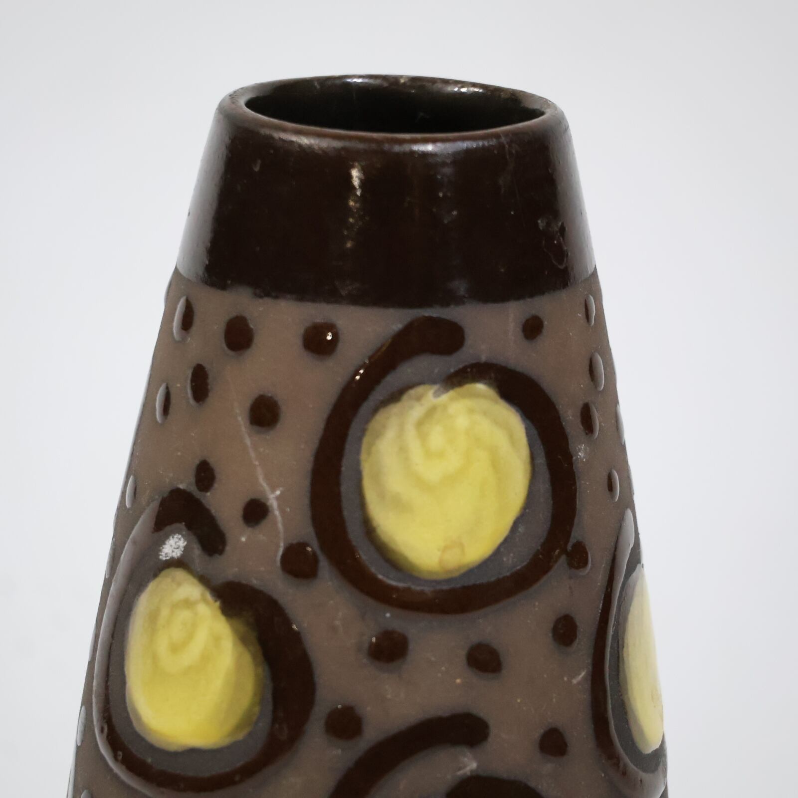 胴部に大胆に配置されたイエローの円形モチーフが目を引く一本。ダークブラウンのベースに、点刻と円環状のレリーフを組み合わせた立体的な装飾が施され、光の当たり方によって陰影が強調されます。