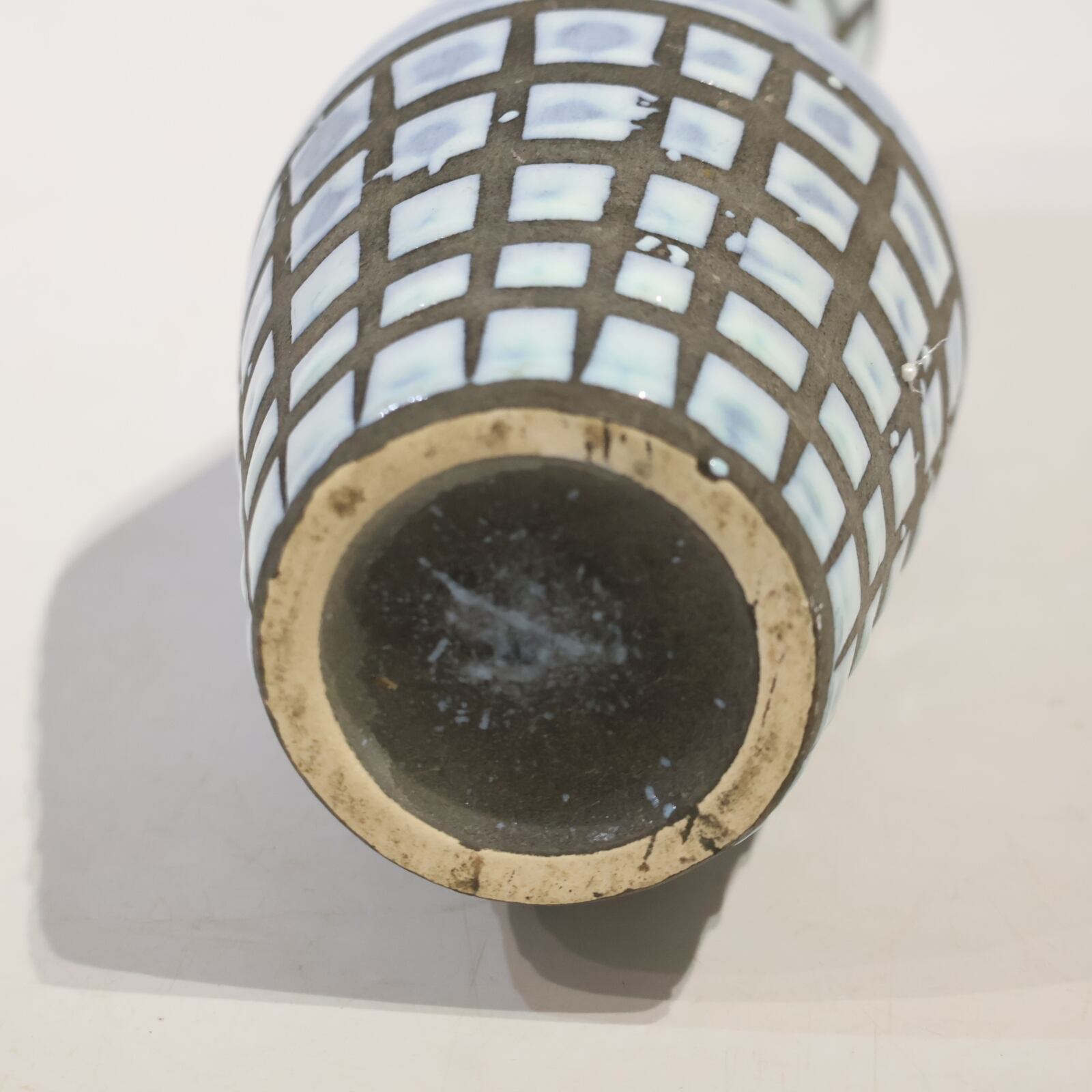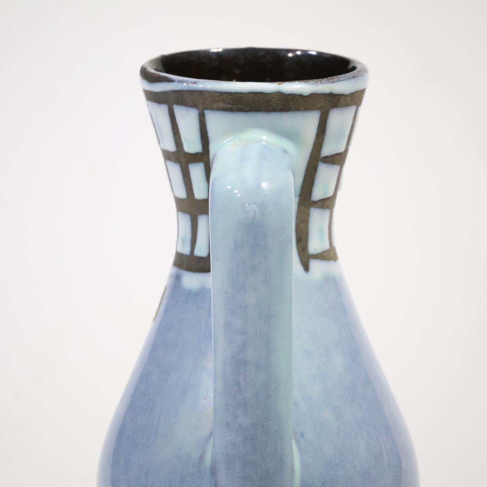 やわらかなブルーを基調に、グリッド状の装飾が印象的なハンドル付きフォルム。