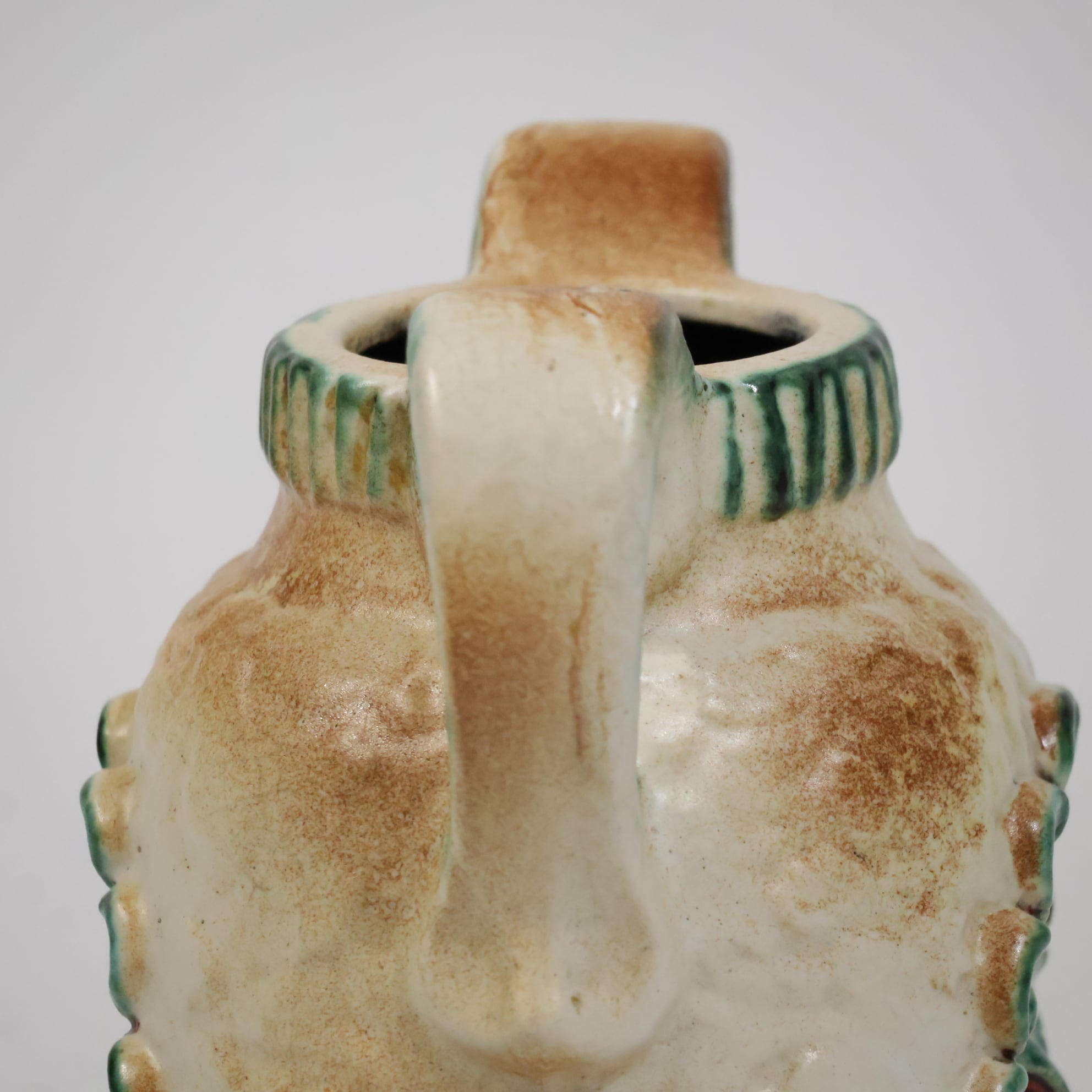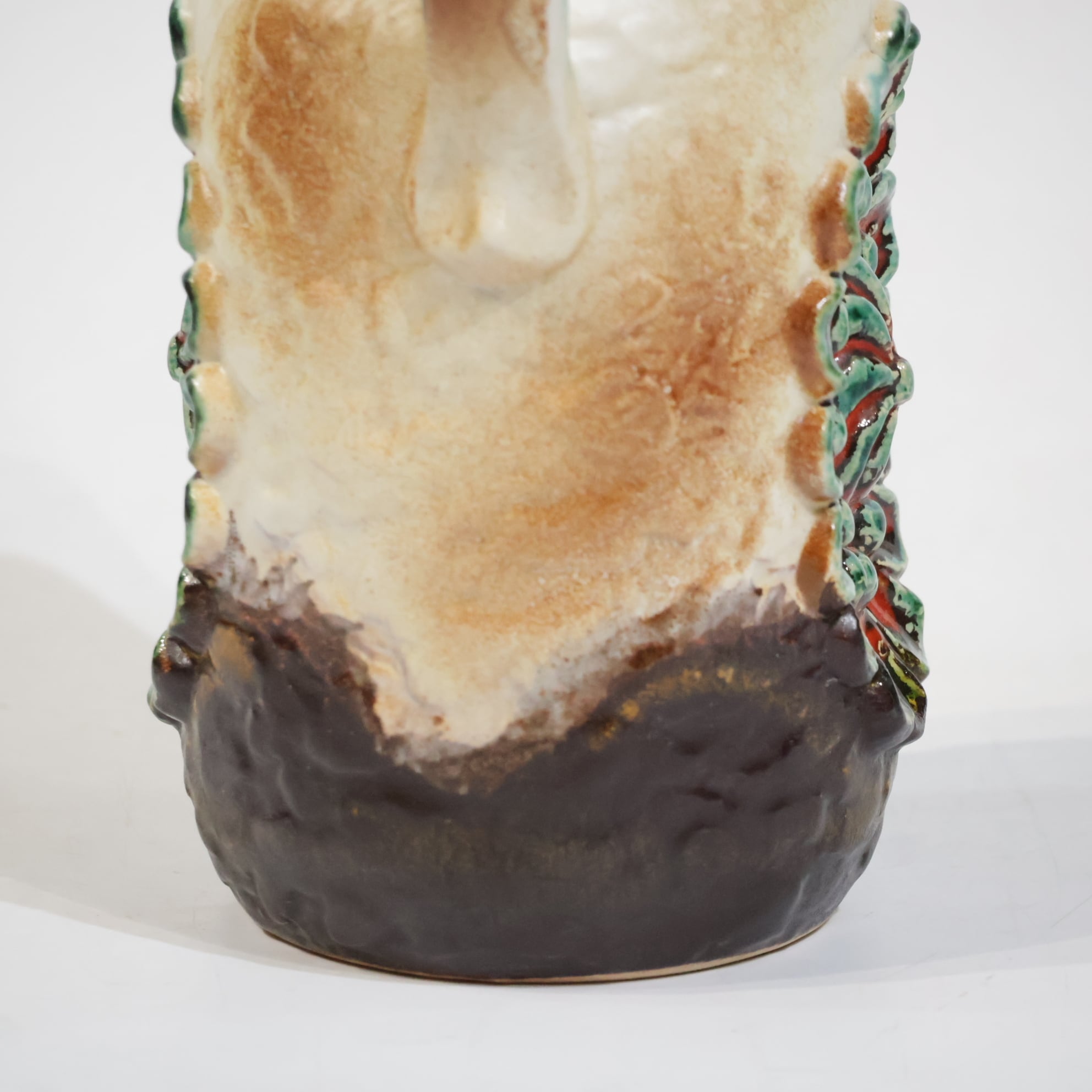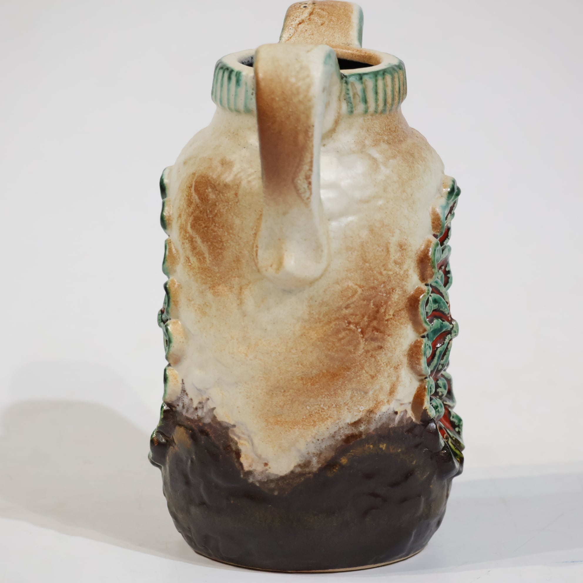 1960年代後半には一目で見分けがつく銅色の釉薬を開発し、ベージュの色調や泡状の滴る溶岩釉との組み合わせがよく用いられていました。