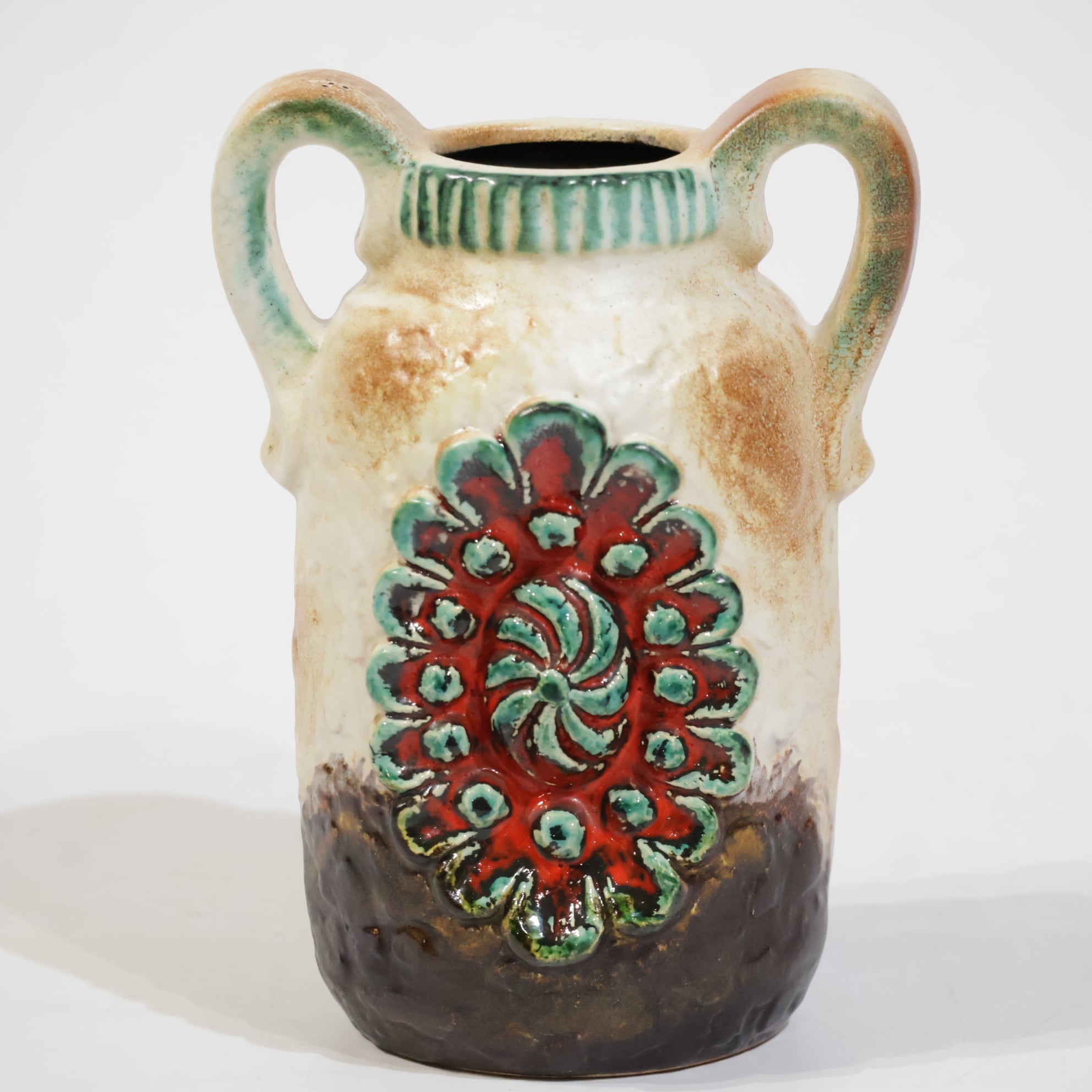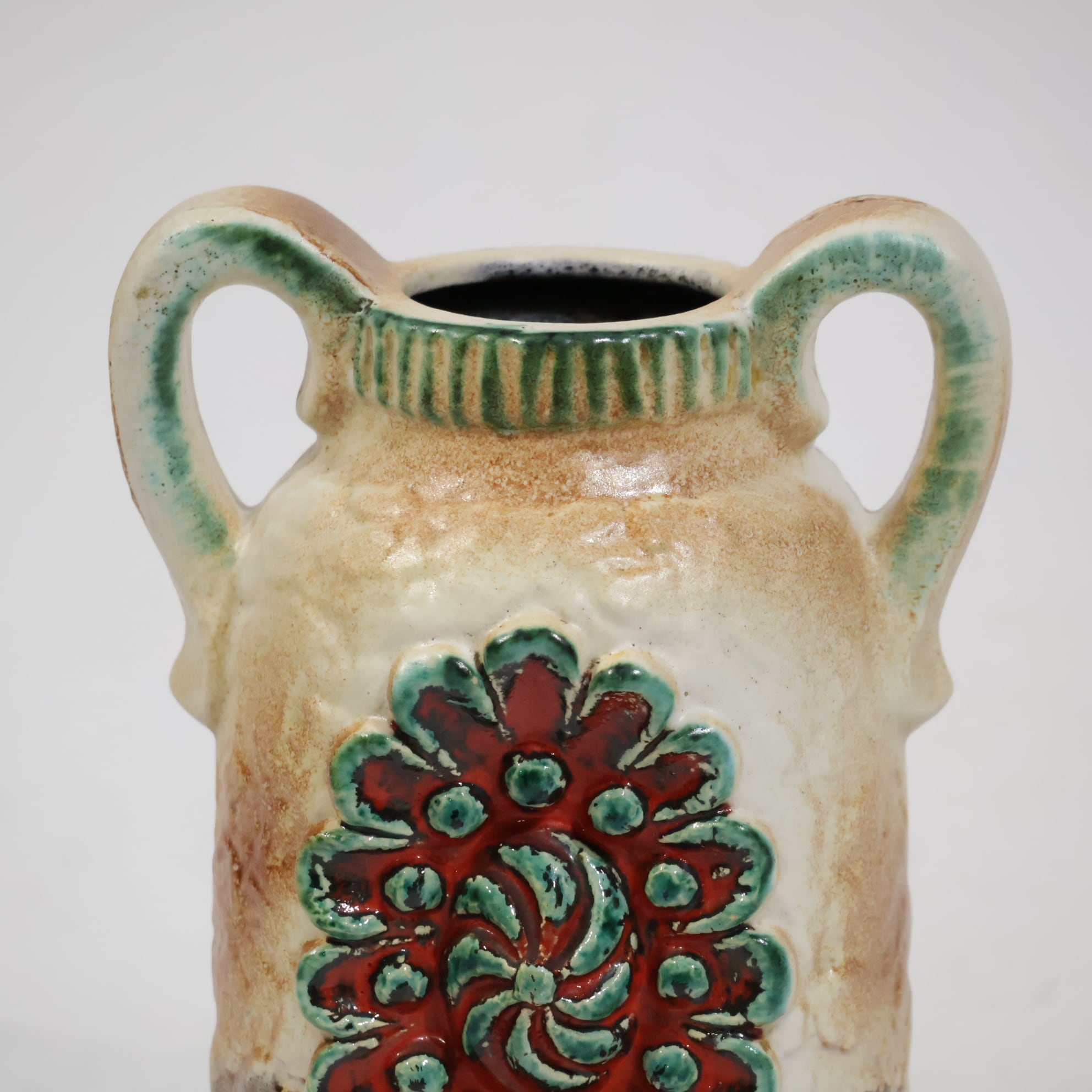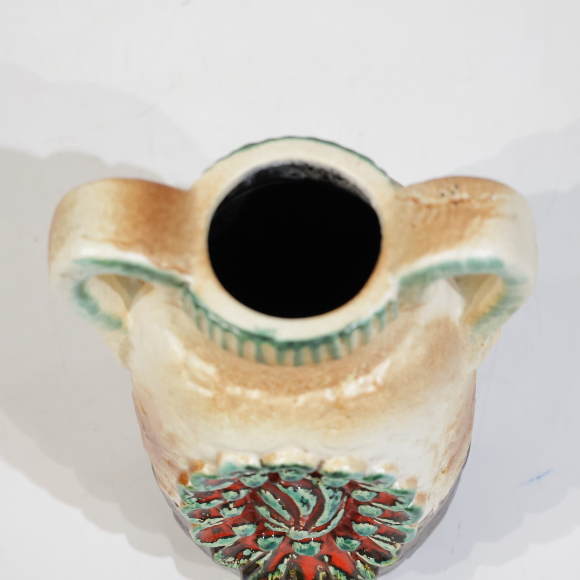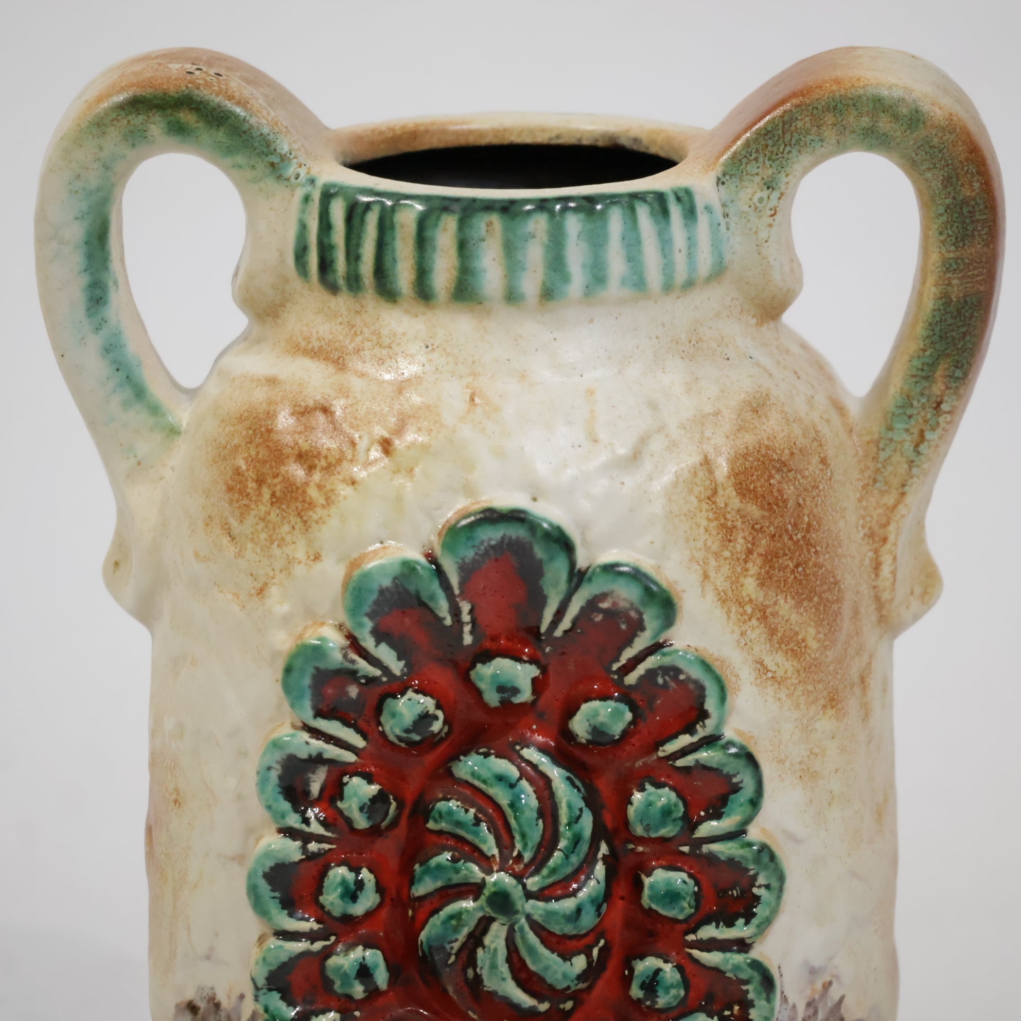 1960年代後半には一目で見分けがつく銅色の釉薬を開発し、ベージュの色調や泡状の滴る溶岩釉との組み合わせがよく用いられていました。