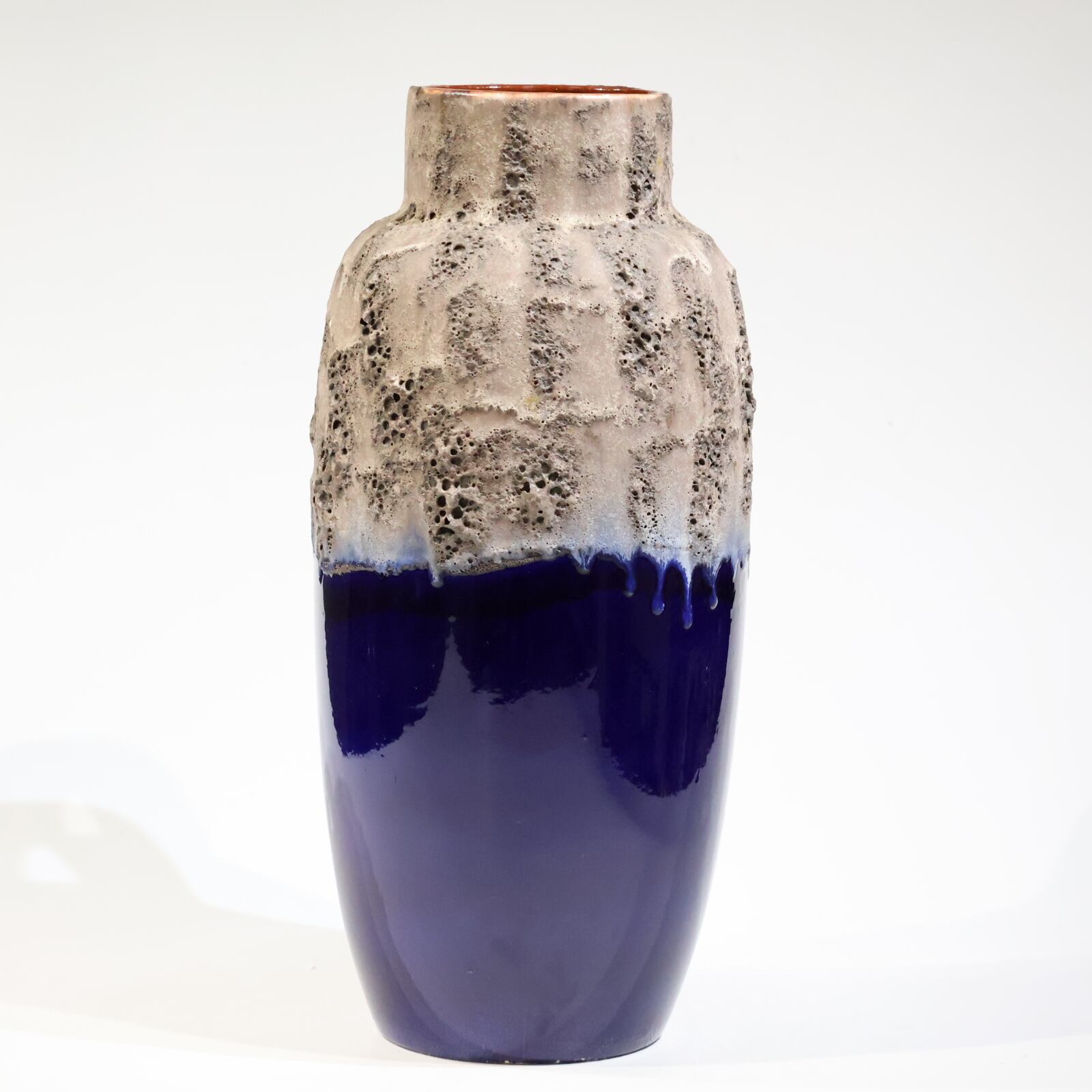 高さ53cmの迫力ある大型モデル。深いコバルトブルーの艶やかな下地に、上部には厚く掛けられたベージュ系の立体的な釉が大胆に重なります。