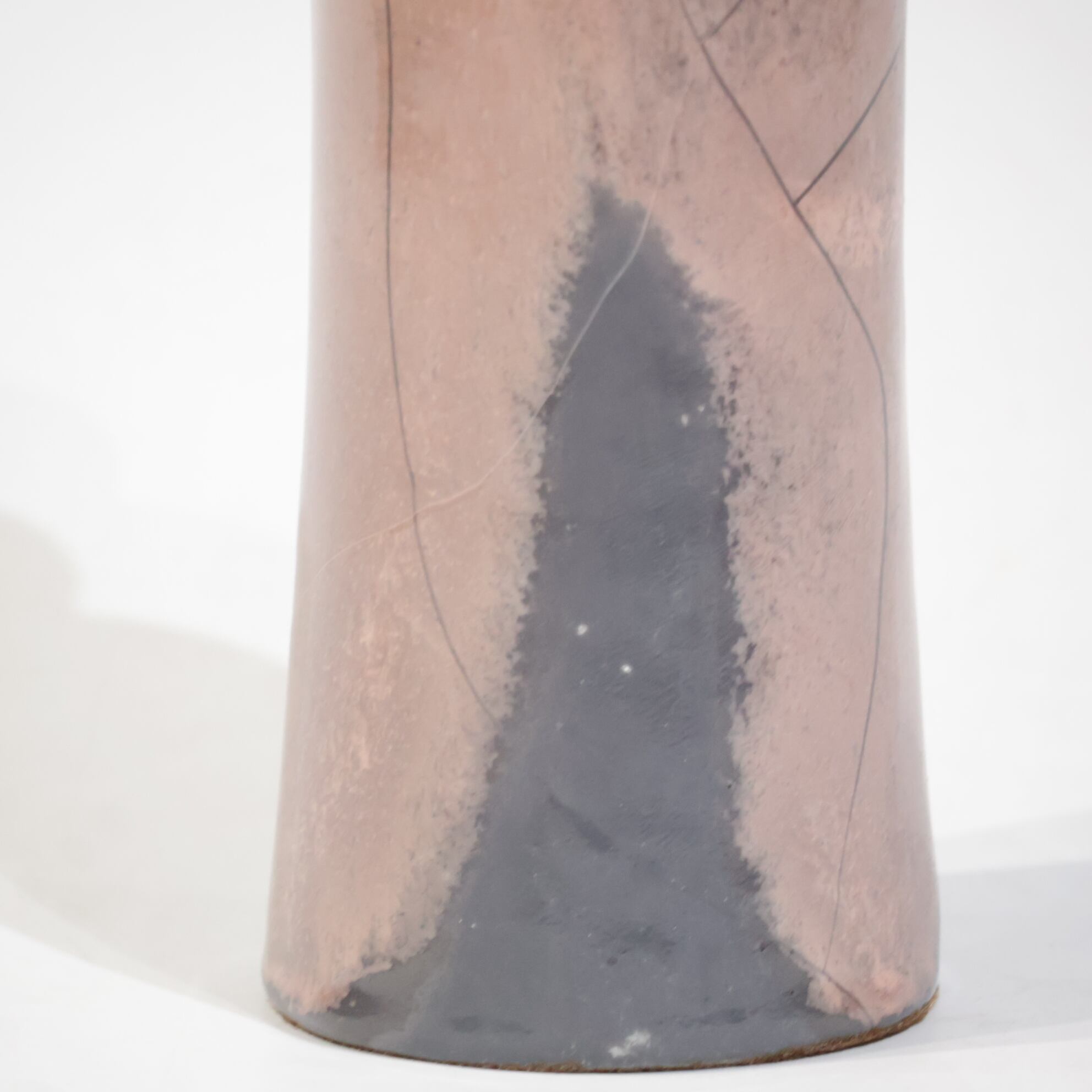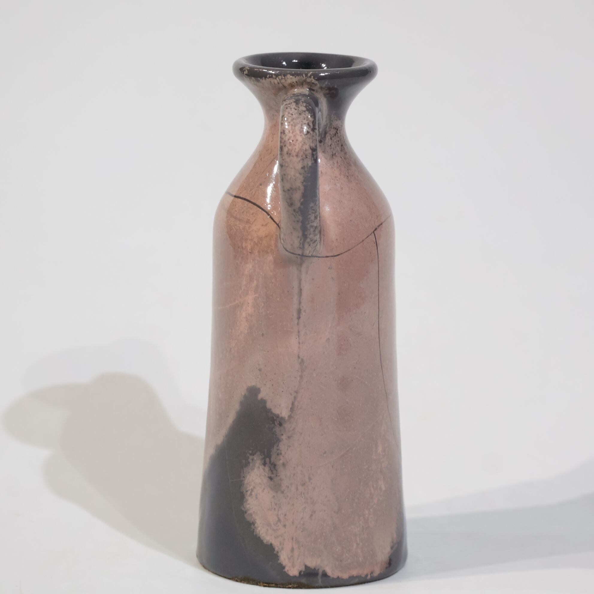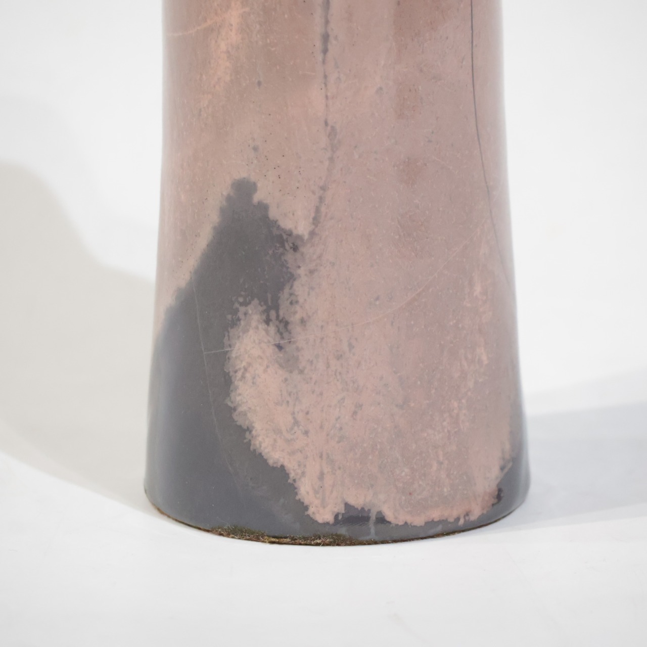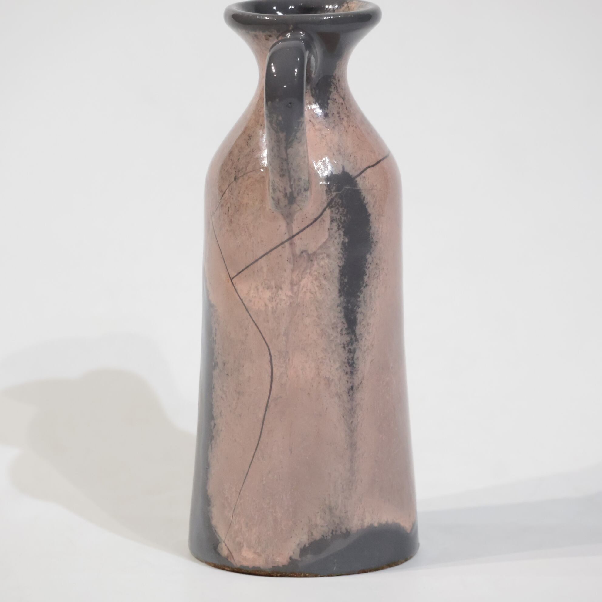 色彩は柔らかなグレーとピンクの組み合わせ。艶のある釉薬が溶け合うように流れ、静かに揺らぐ陰影を生み出しています。ピンクはややくすみを帯びており、落ち着いたグレートーンとの対比が上品な印象を与えます。
