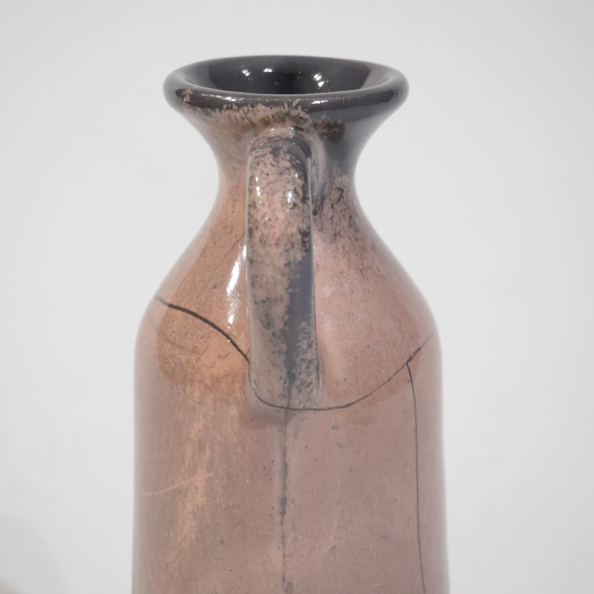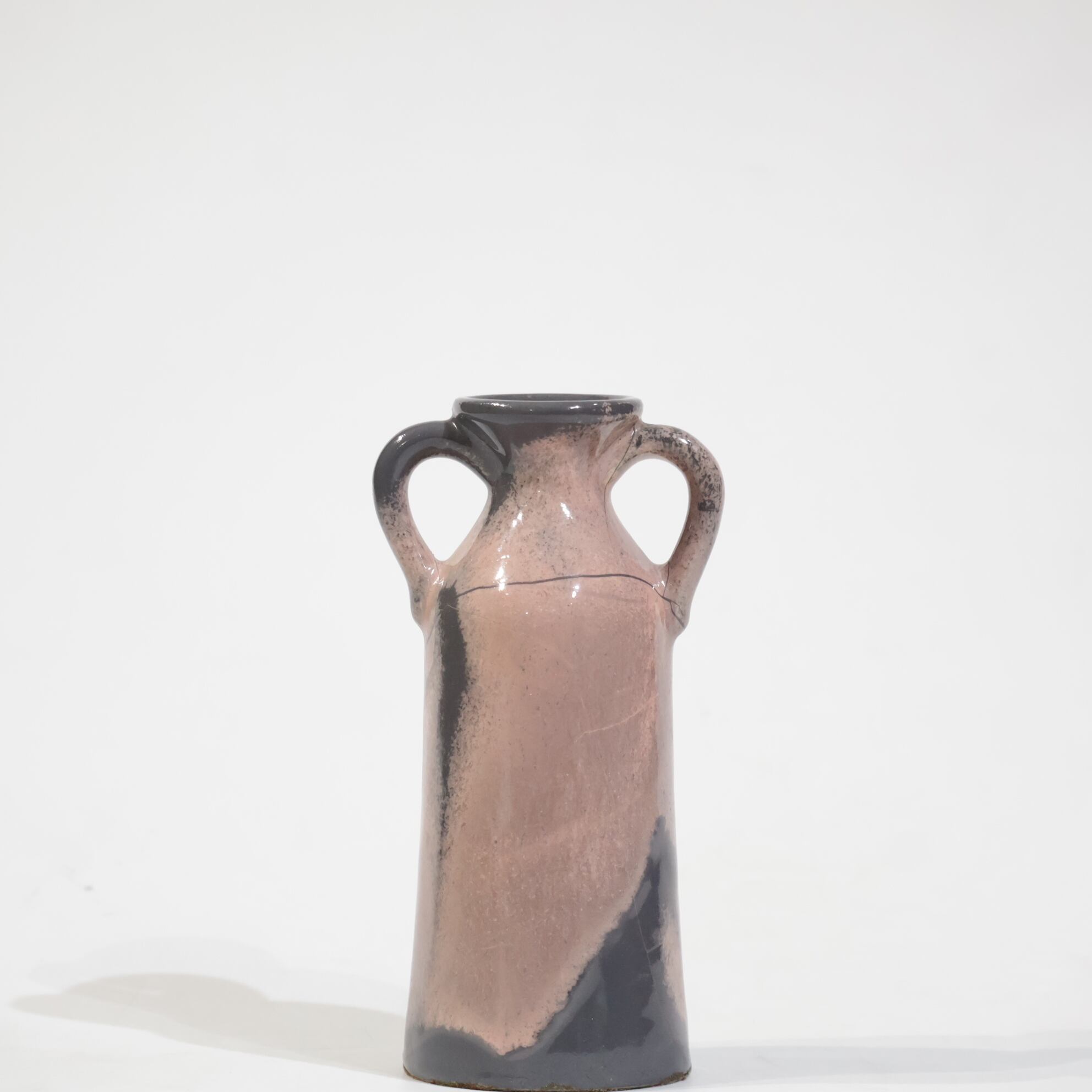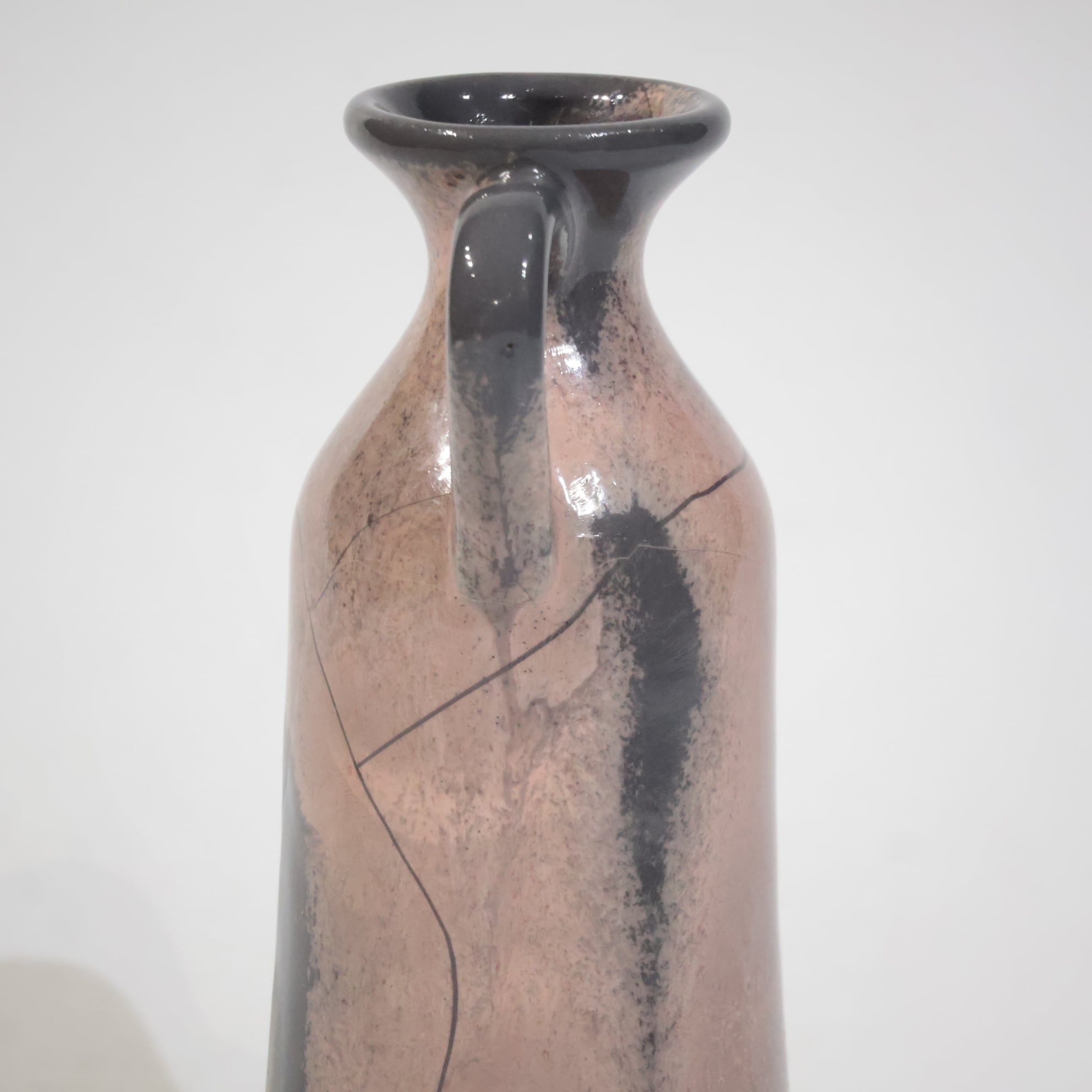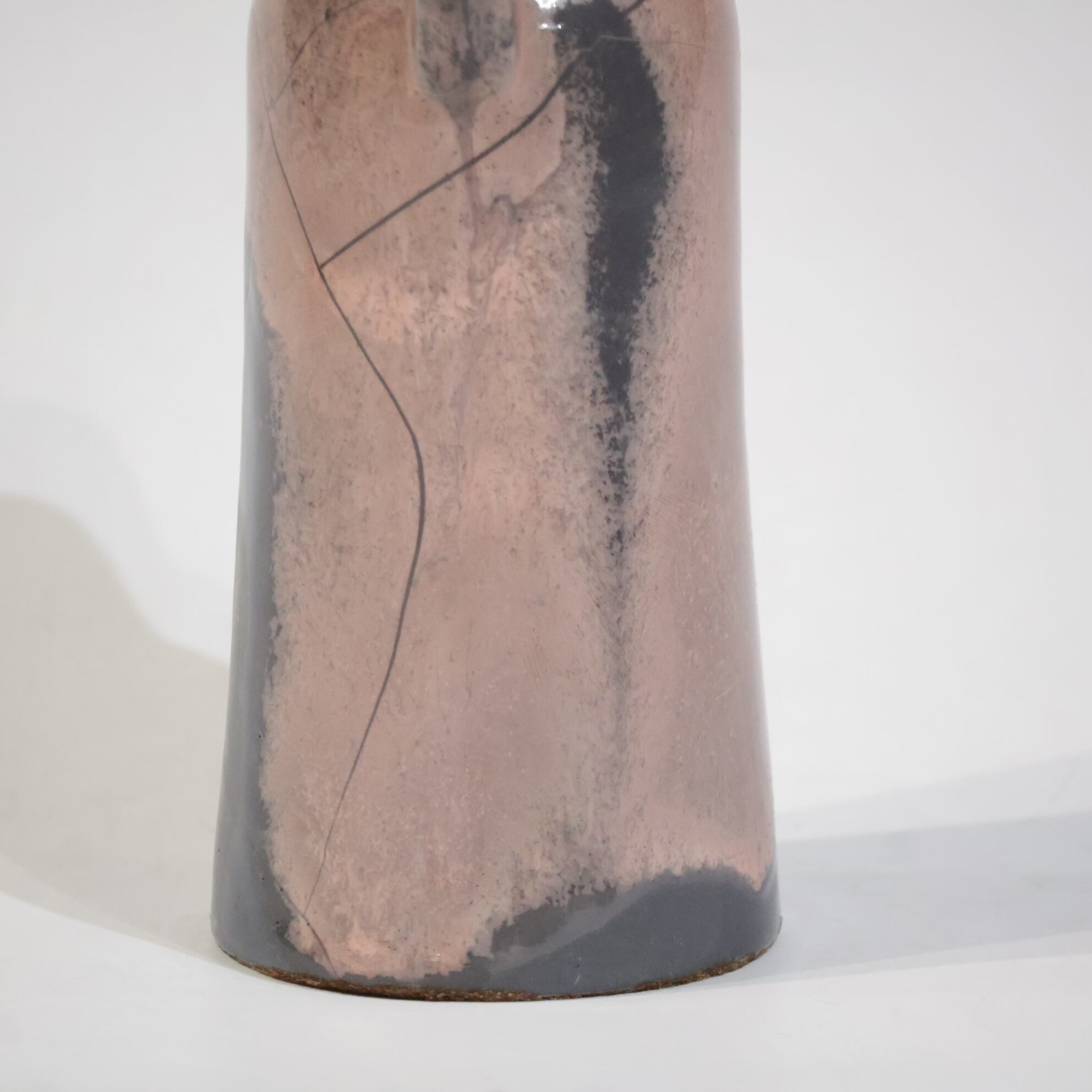 色彩は柔らかなグレーとピンクの組み合わせ。艶のある釉薬が溶け合うように流れ、静かに揺らぐ陰影を生み出しています。ピンクはややくすみを帯びており、落ち着いたグレートーンとの対比が上品な印象を与えます。