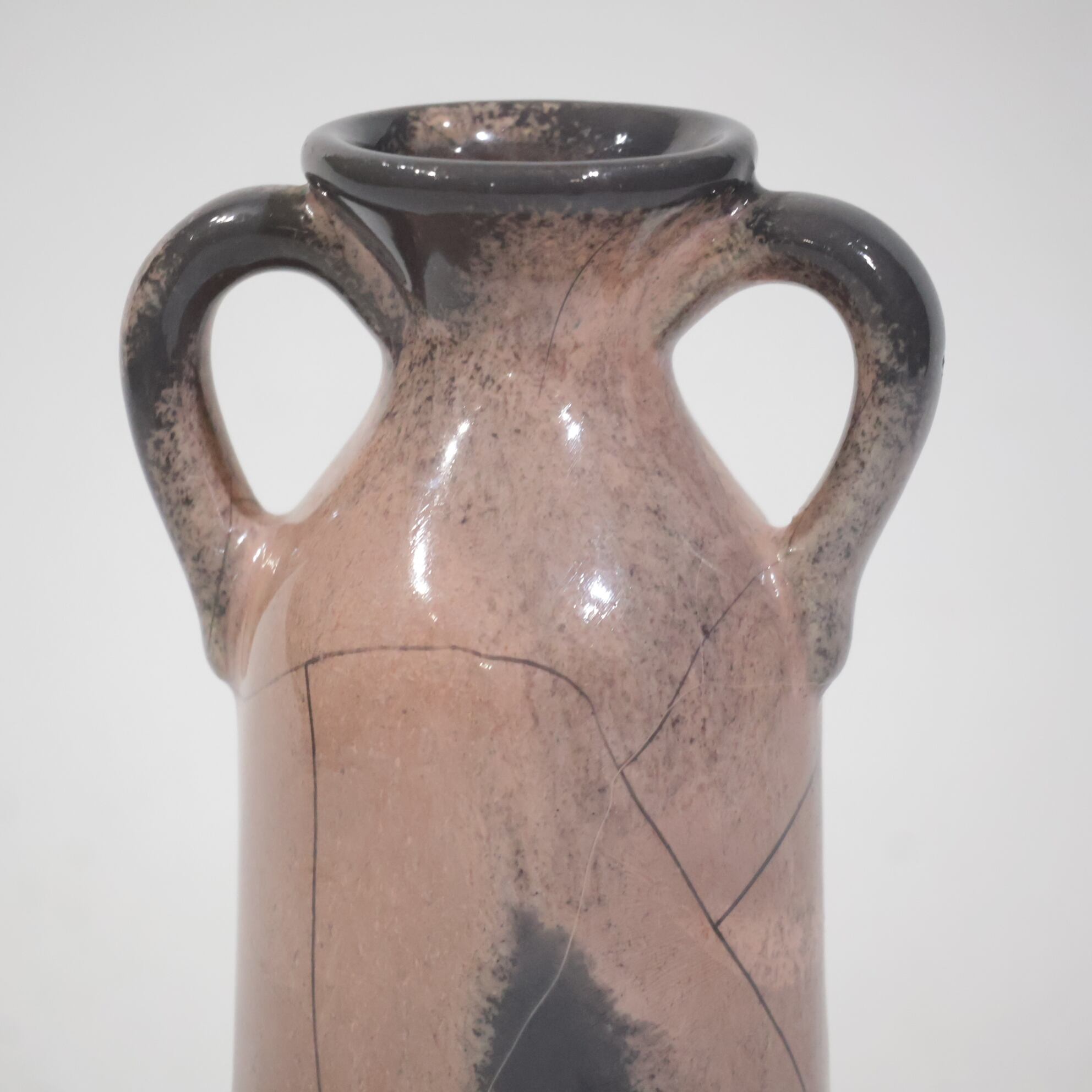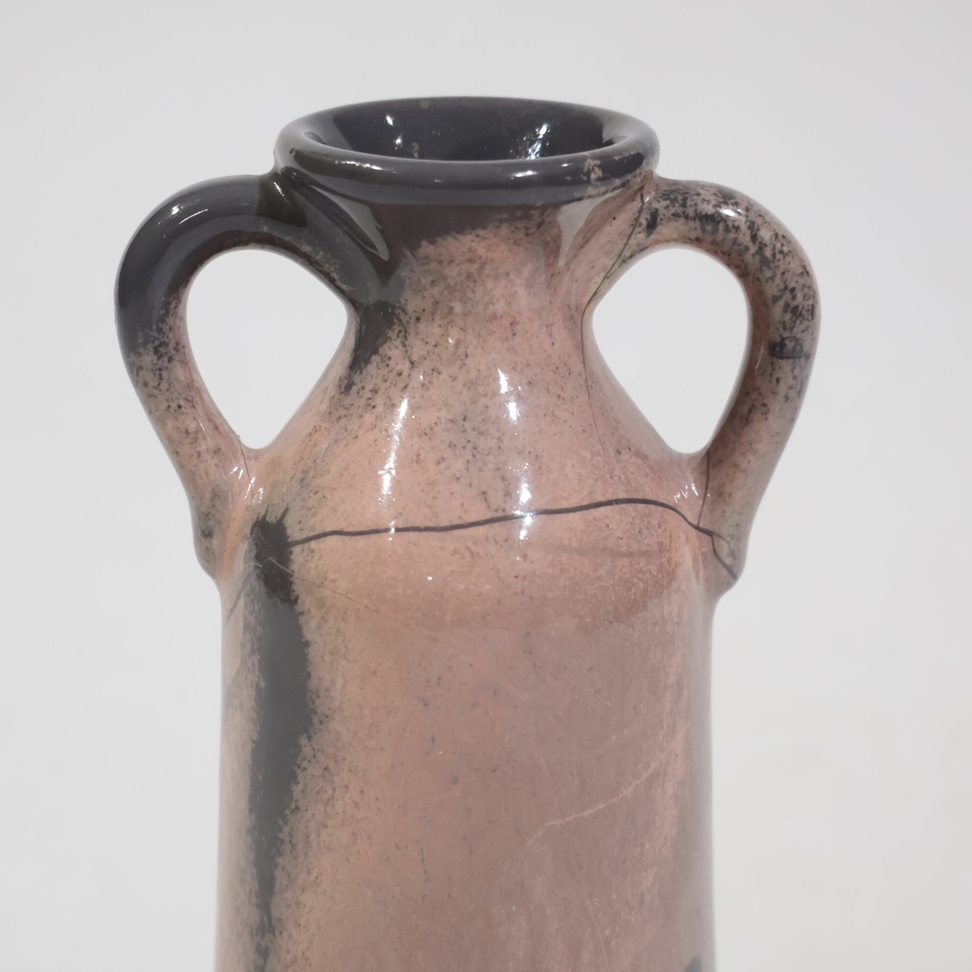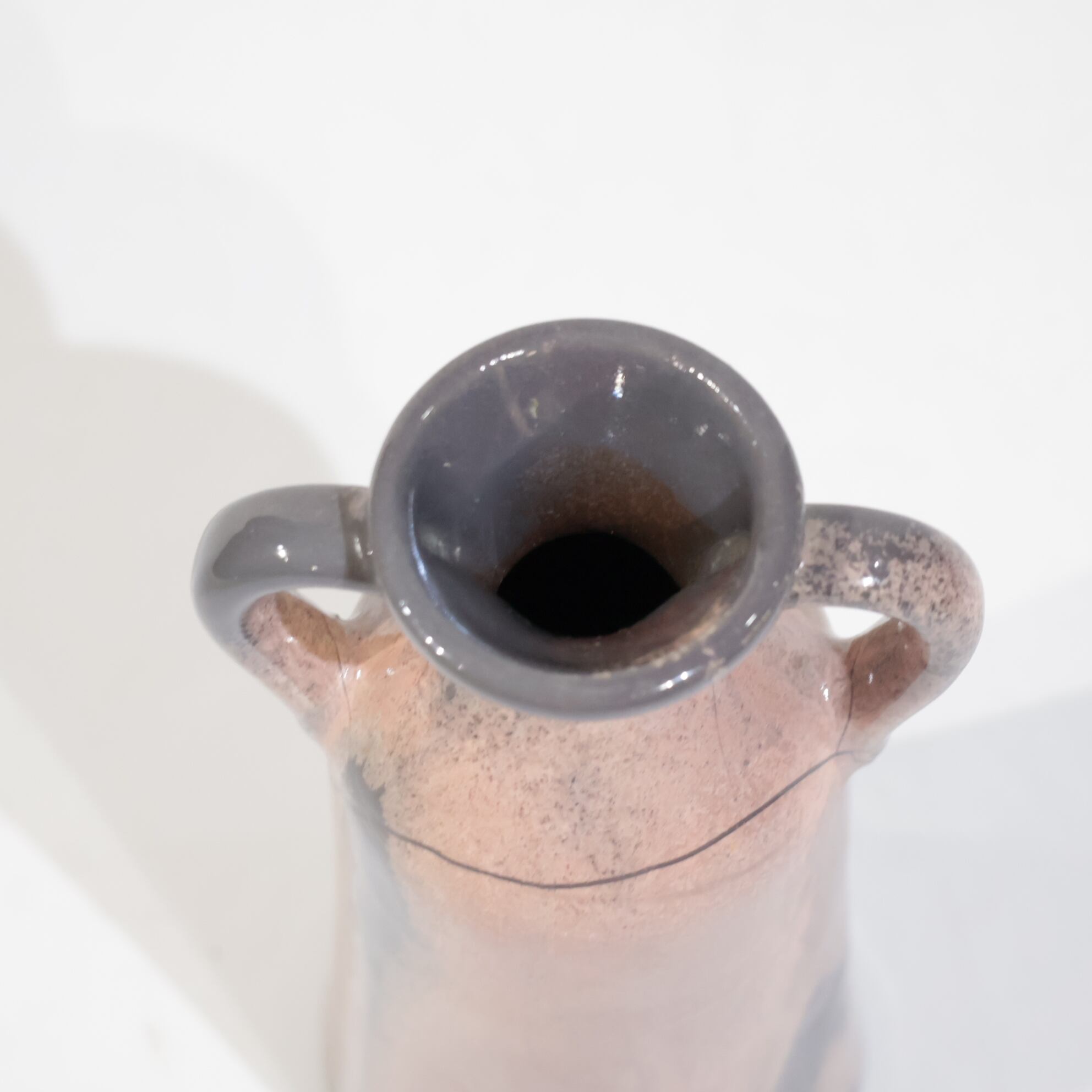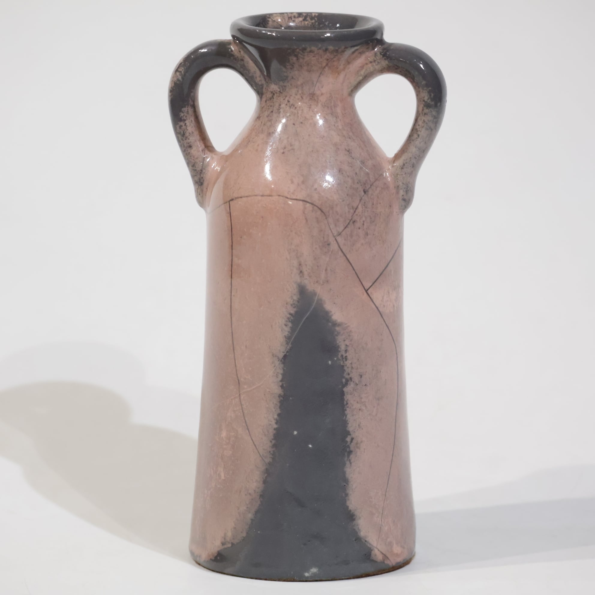 色彩は柔らかなグレーとピンクの組み合わせ。艶のある釉薬が溶け合うように流れ、静かに揺らぐ陰影を生み出しています。ピンクはややくすみを帯びており、落ち着いたグレートーンとの対比が上品な印象を与えます。