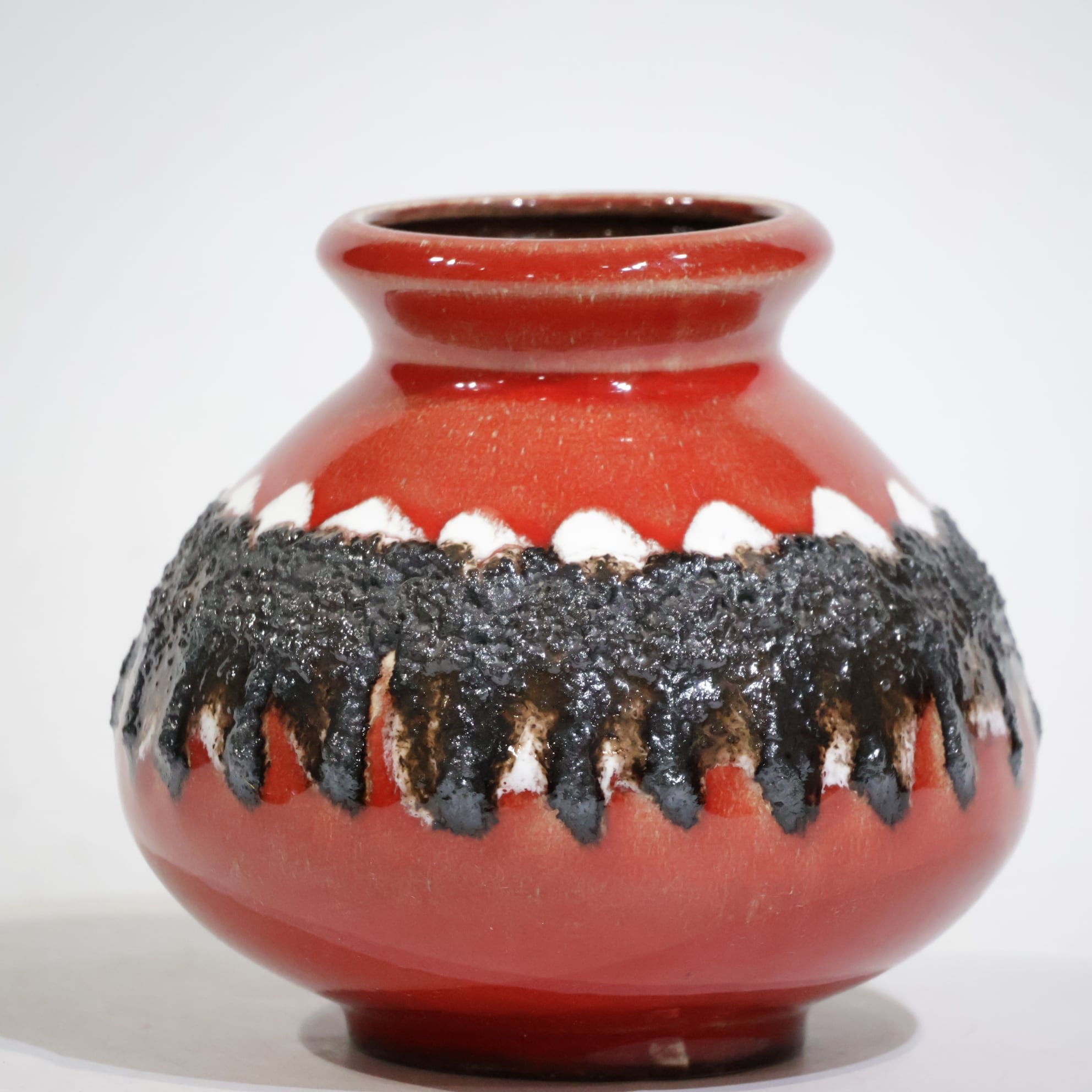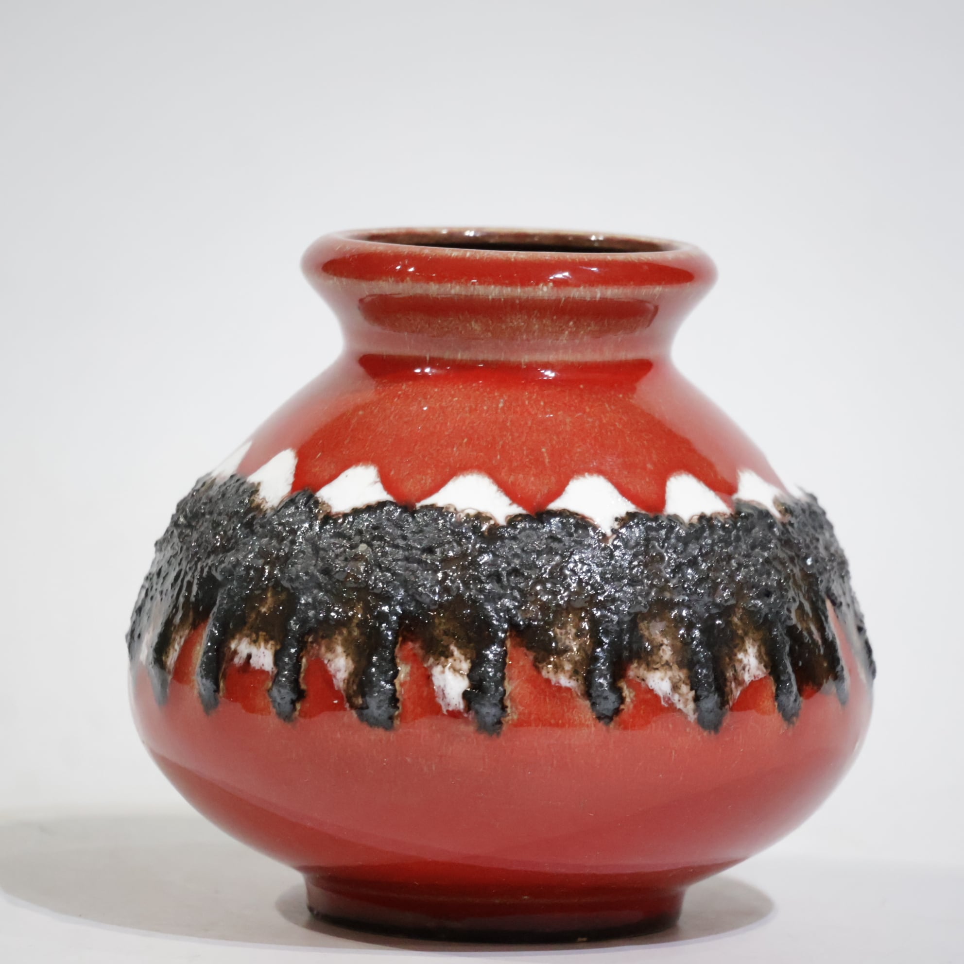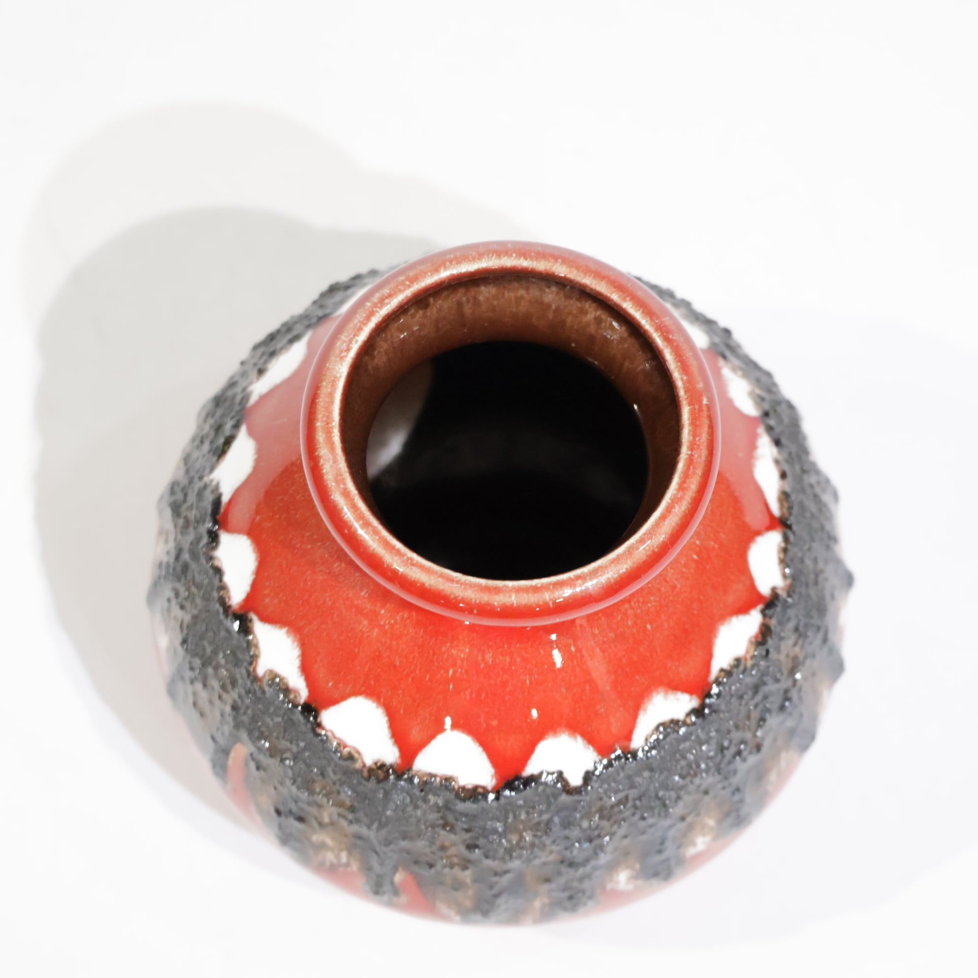 光沢のある赤い釉薬に、白と黒のFat Lava釉薬が大胆に施されたSchlossbergの作品。溶岩のように垂れ落ちる黒い釉薬が、デザインにドラマチックなコントラストを与えています。球体に近いボディに短い首を持つフォルムは、安定感がありながらも視覚的なインパクトを強調しています。