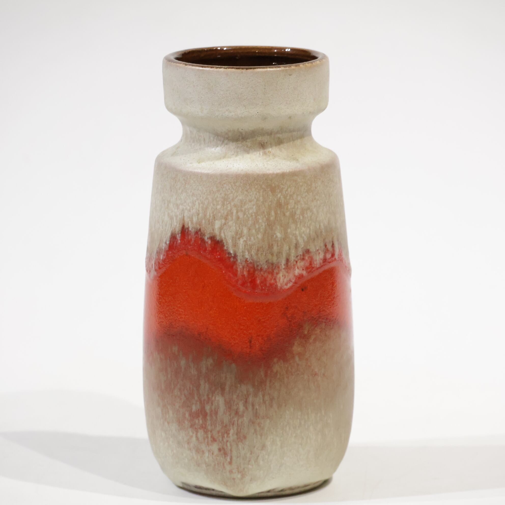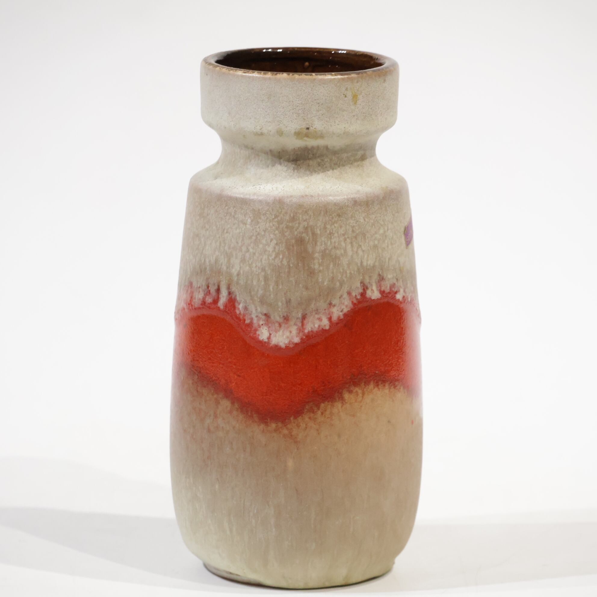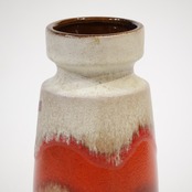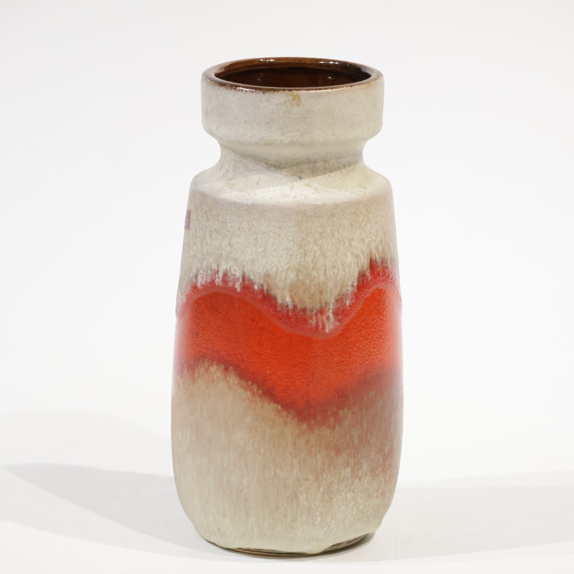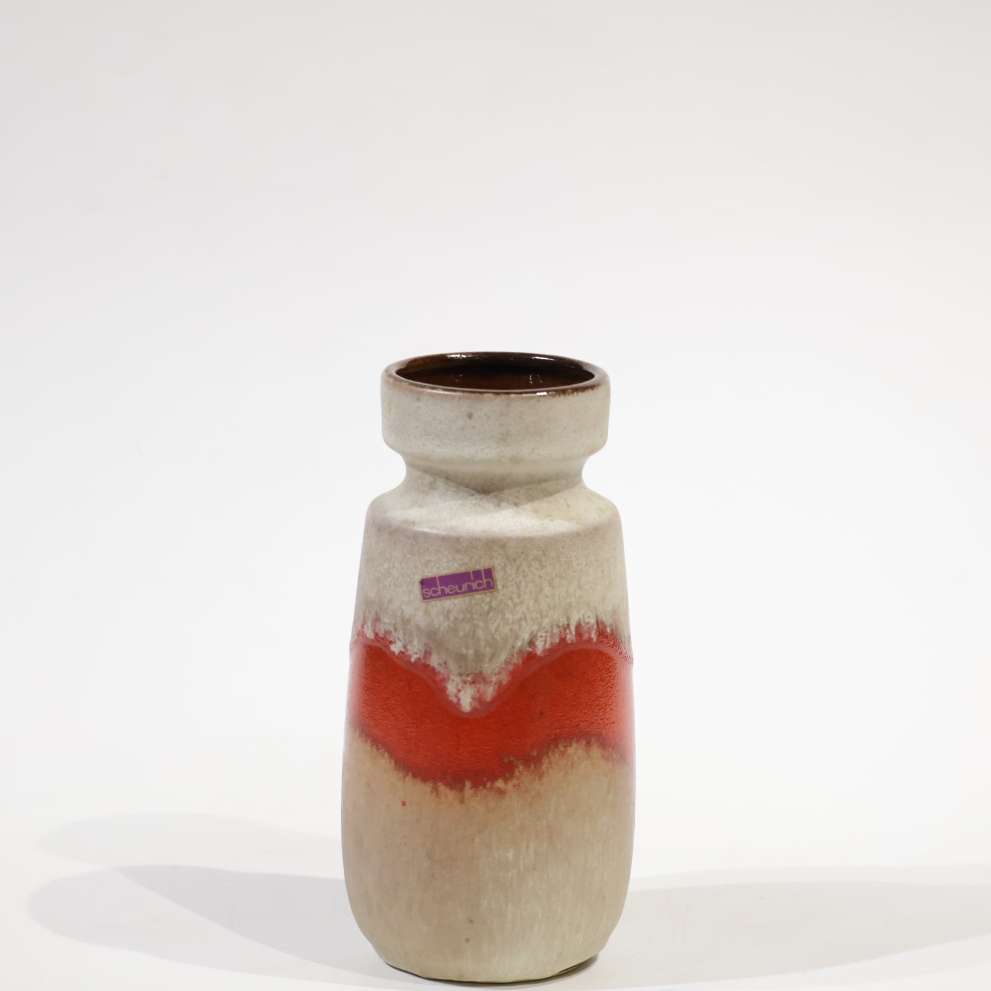 同社は急速に成長し、1950~80年代には陶 器製造の分野でドイツ最大のメーカーとなり、今日も確固たる地位を維持しています。形状に加えて釉薬でも、当時は最も幅広い品揃えを誇った他、輸出量も最大だったため、現在でも同社の製品はよく見られます。特に円筒形を基調にし たシンプルな形状で、型押し模様のある床置き 花瓶が代表的。色彩については当時主流だっ た赤やオレンジから、クリーム、ベージュ、茶色 などが多くを占めています。