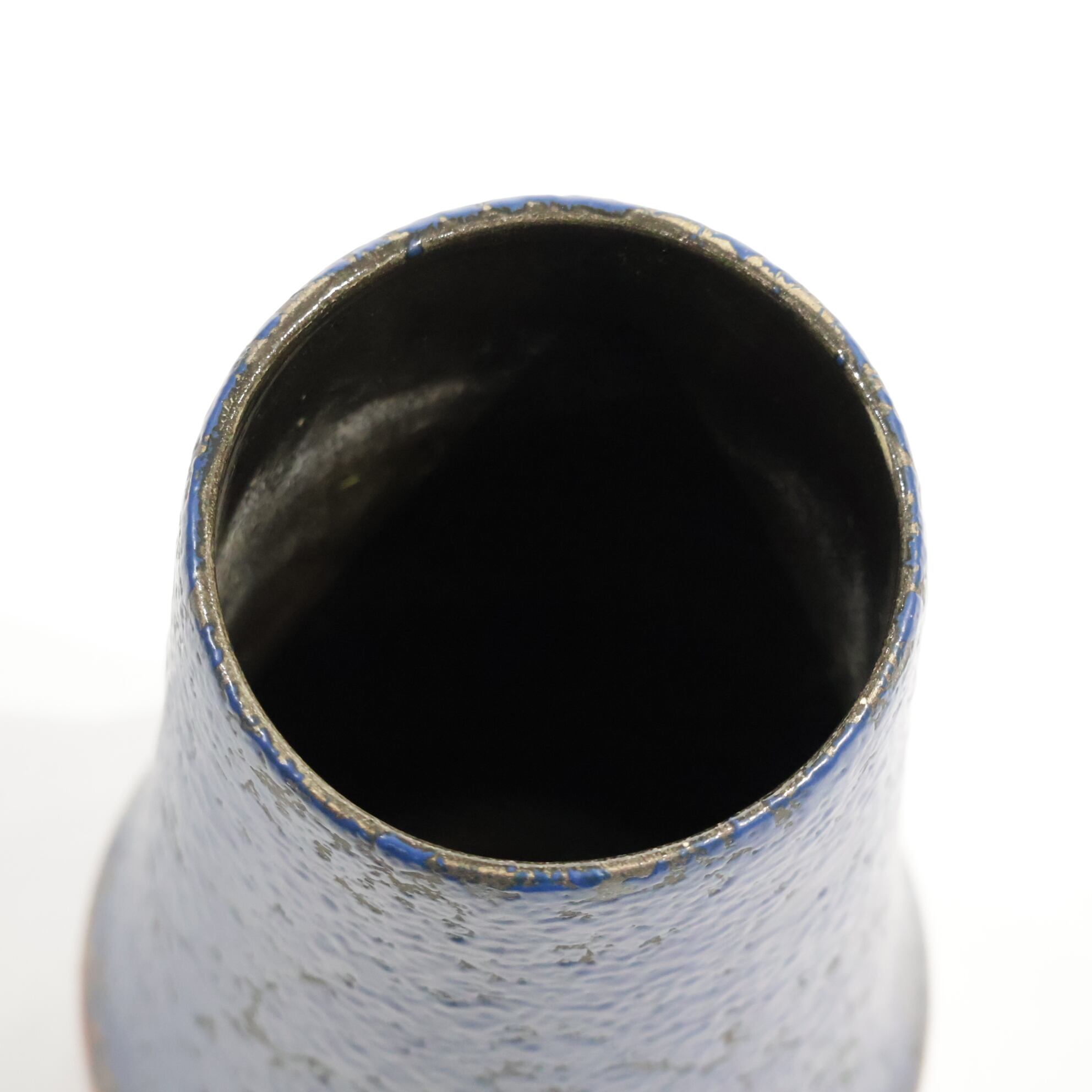 上部は深いブルーのマット釉で覆われ、細かな凹凸を持つ乾いた表面が光を抑えます。