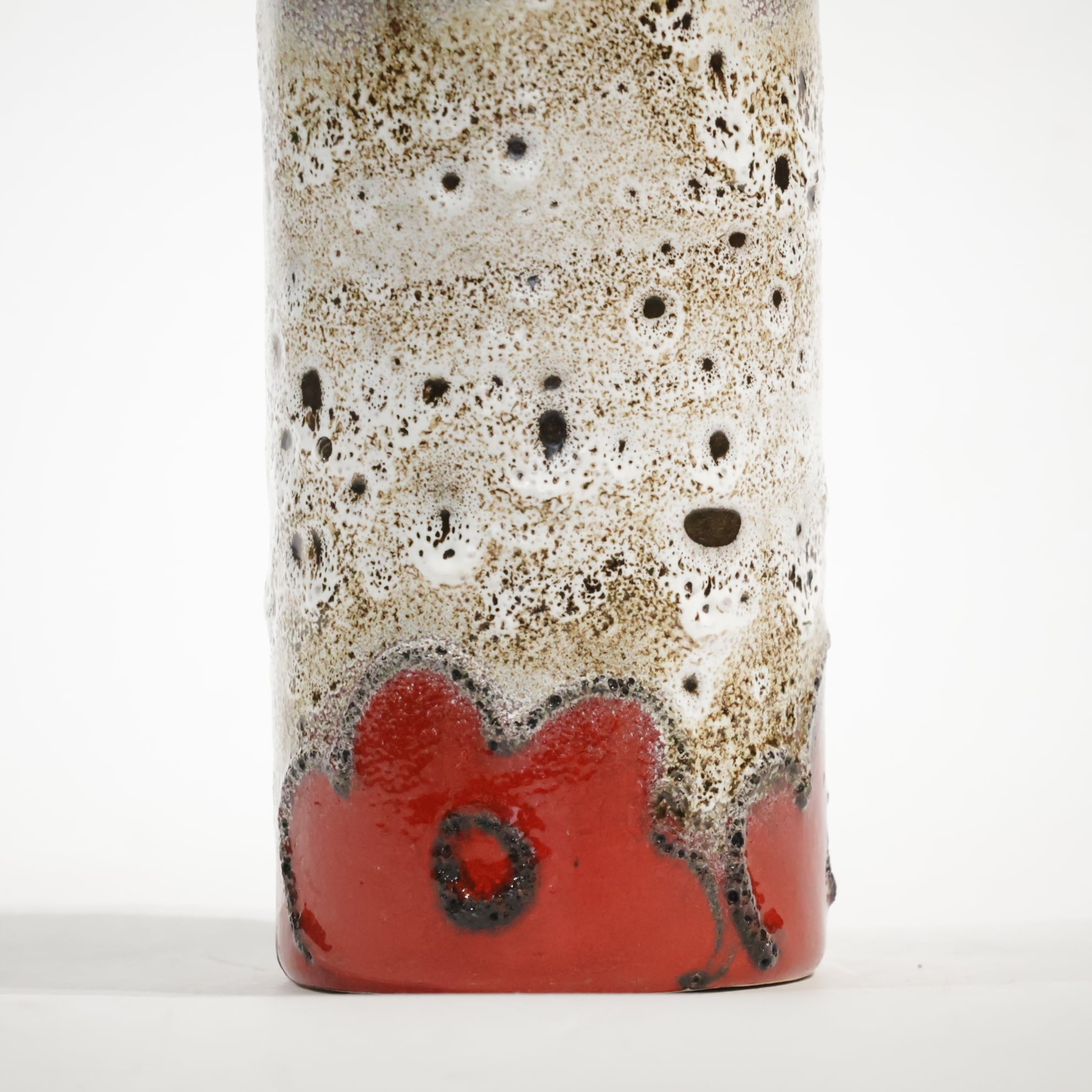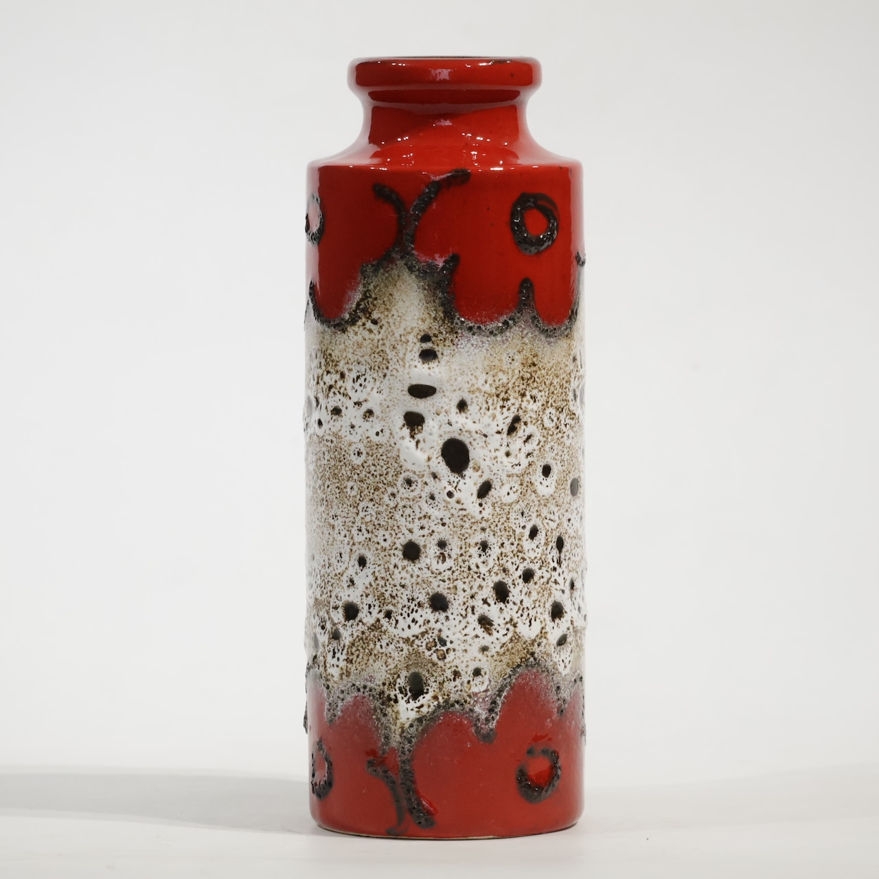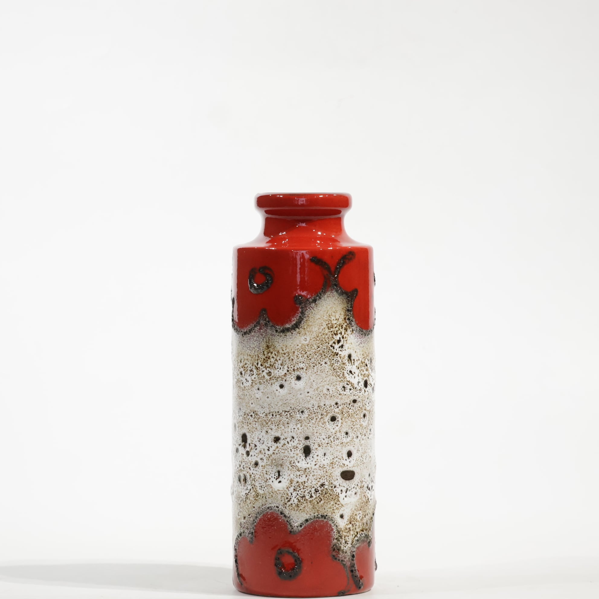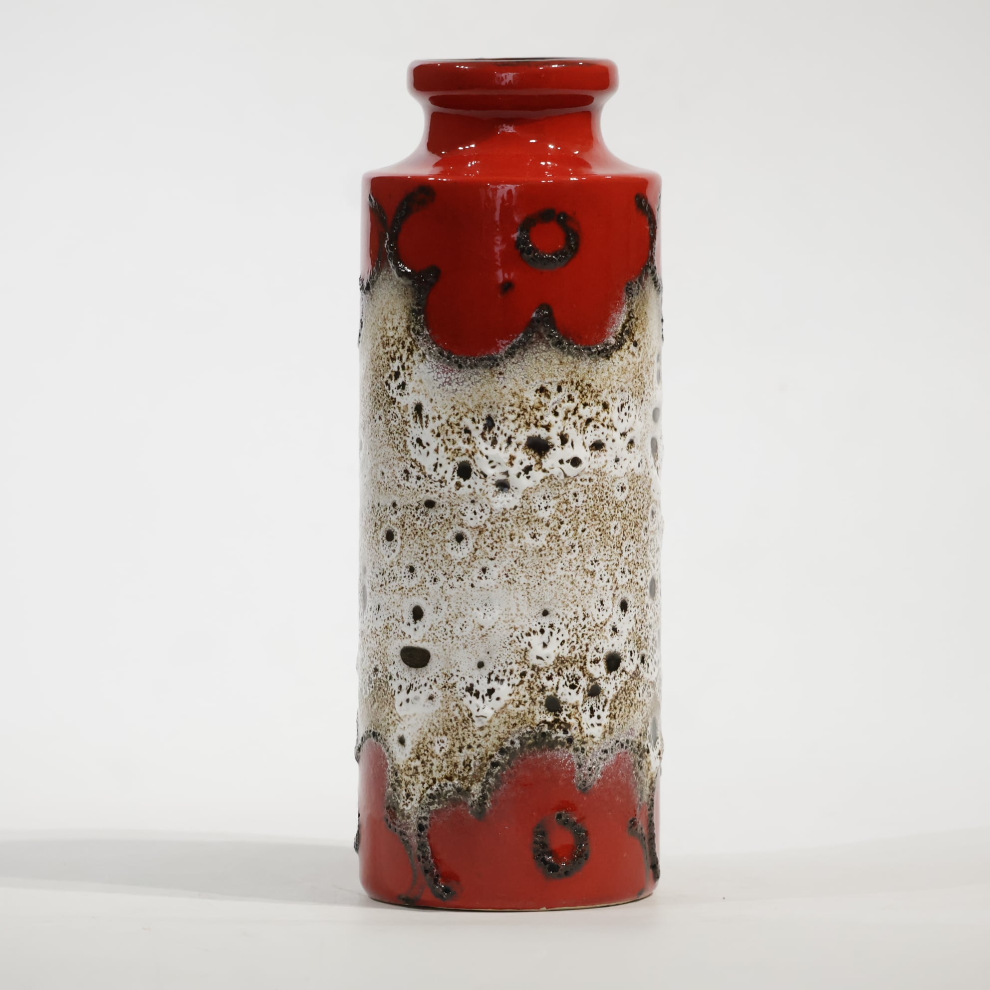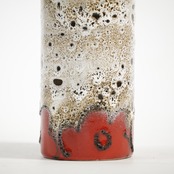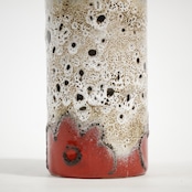 同社は急速に成長し、1950~80年代には陶 器製造の分野でドイツ最大のメーカーとなり、今日も確固たる地位を維持しています。形状に加えて釉薬でも、当時は最も幅広い品揃えを誇った他、輸出量も最大だったため、現在でも同社の製品はよく見られます。特に円筒形を基調にし たシンプルな形状で、型押し模様のある床置き 花瓶が代表的。色彩については当時主流だっ た赤やオレンジから、クリーム、ベージュ、茶色 などが多くを占めています。