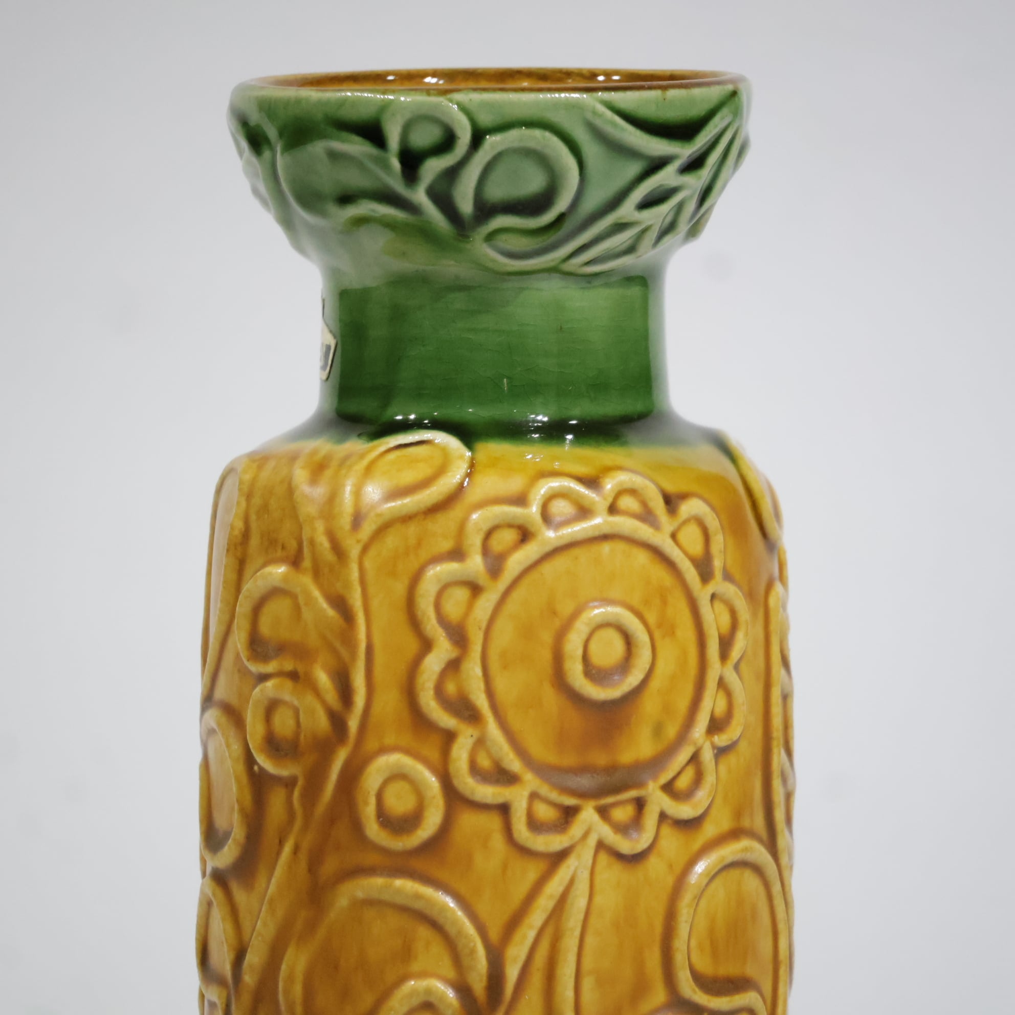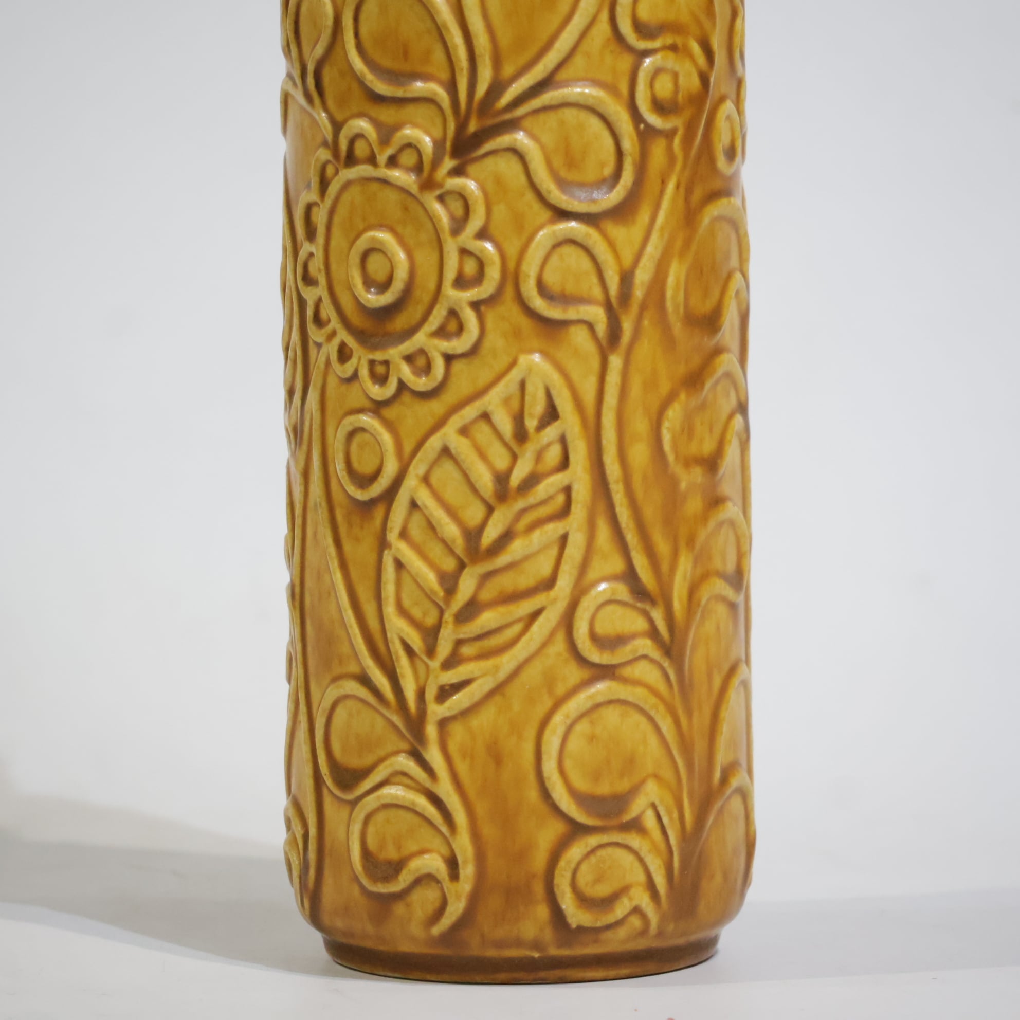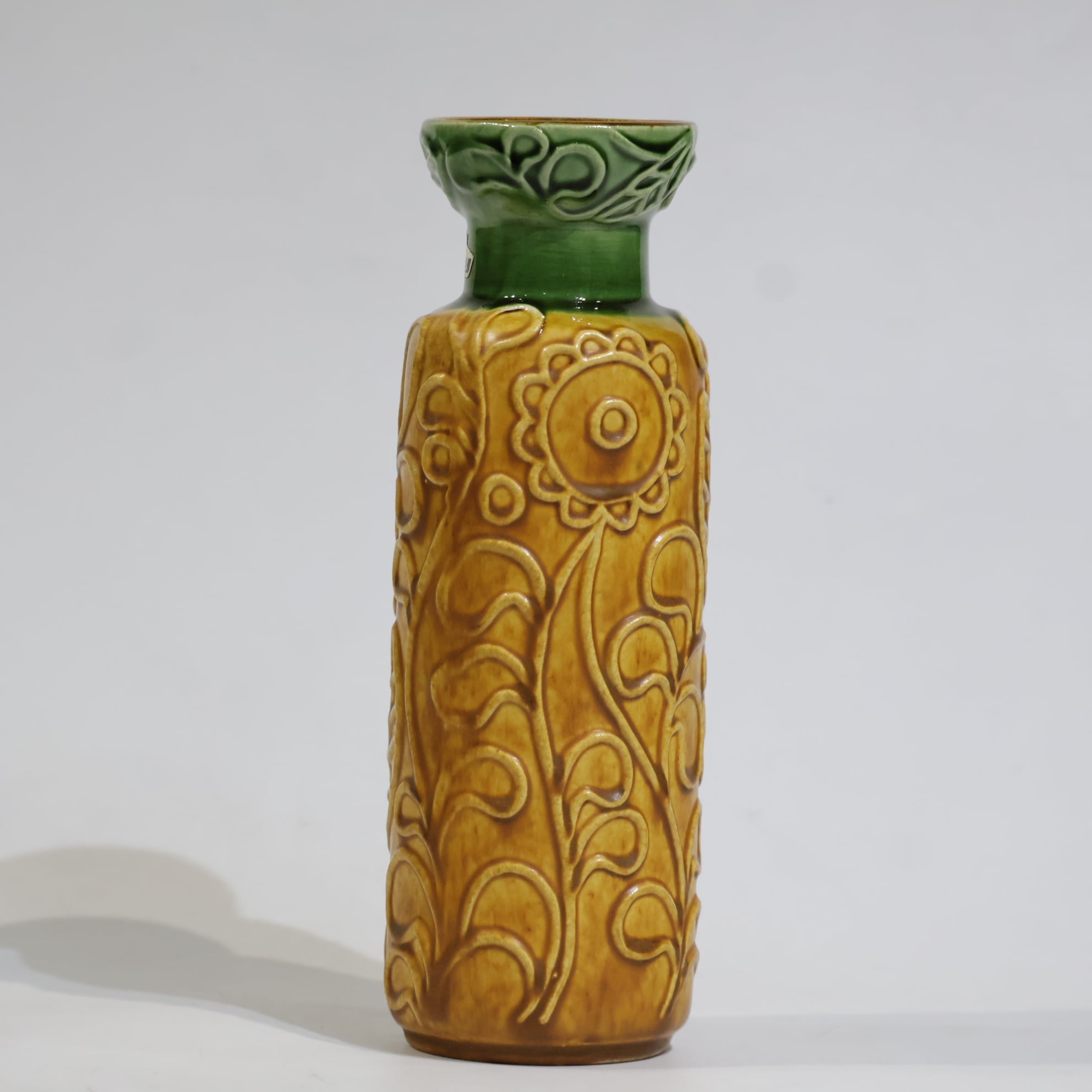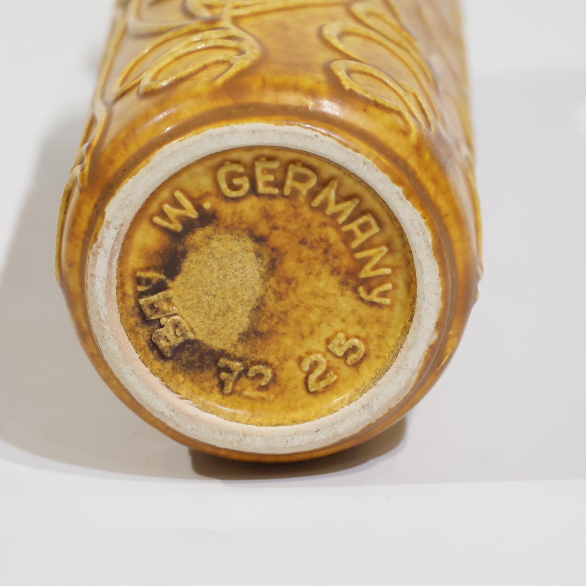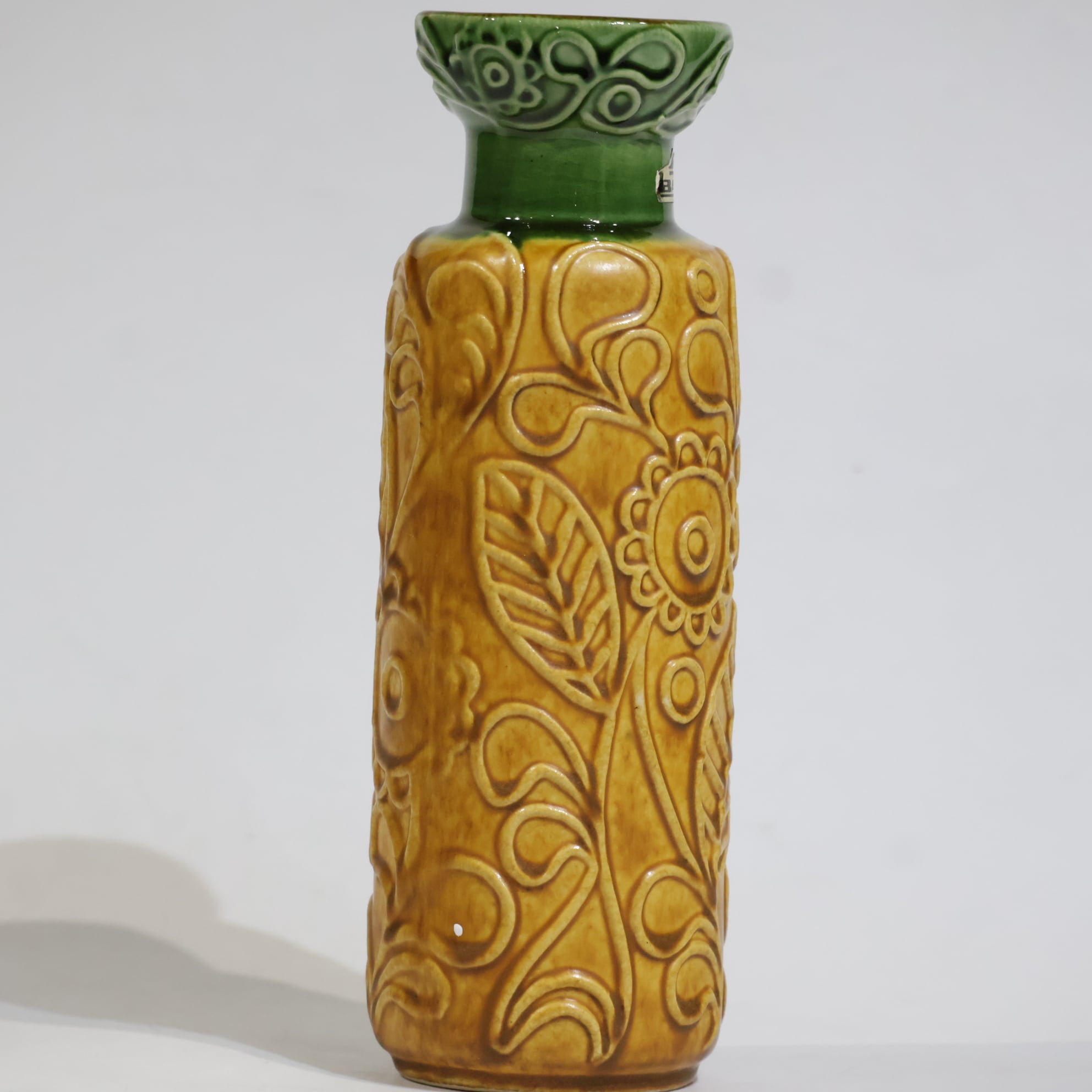 1960年代からのスタイルとしては、 当時広く流行していた色彩の釉薬(マットまたは 光沢あり)を使用し、シンプルなフォルムの上に様 式化した花の図柄の型押しや幾何学模様をあし らったものが多く、Scheurichのも のと混同されがちです。