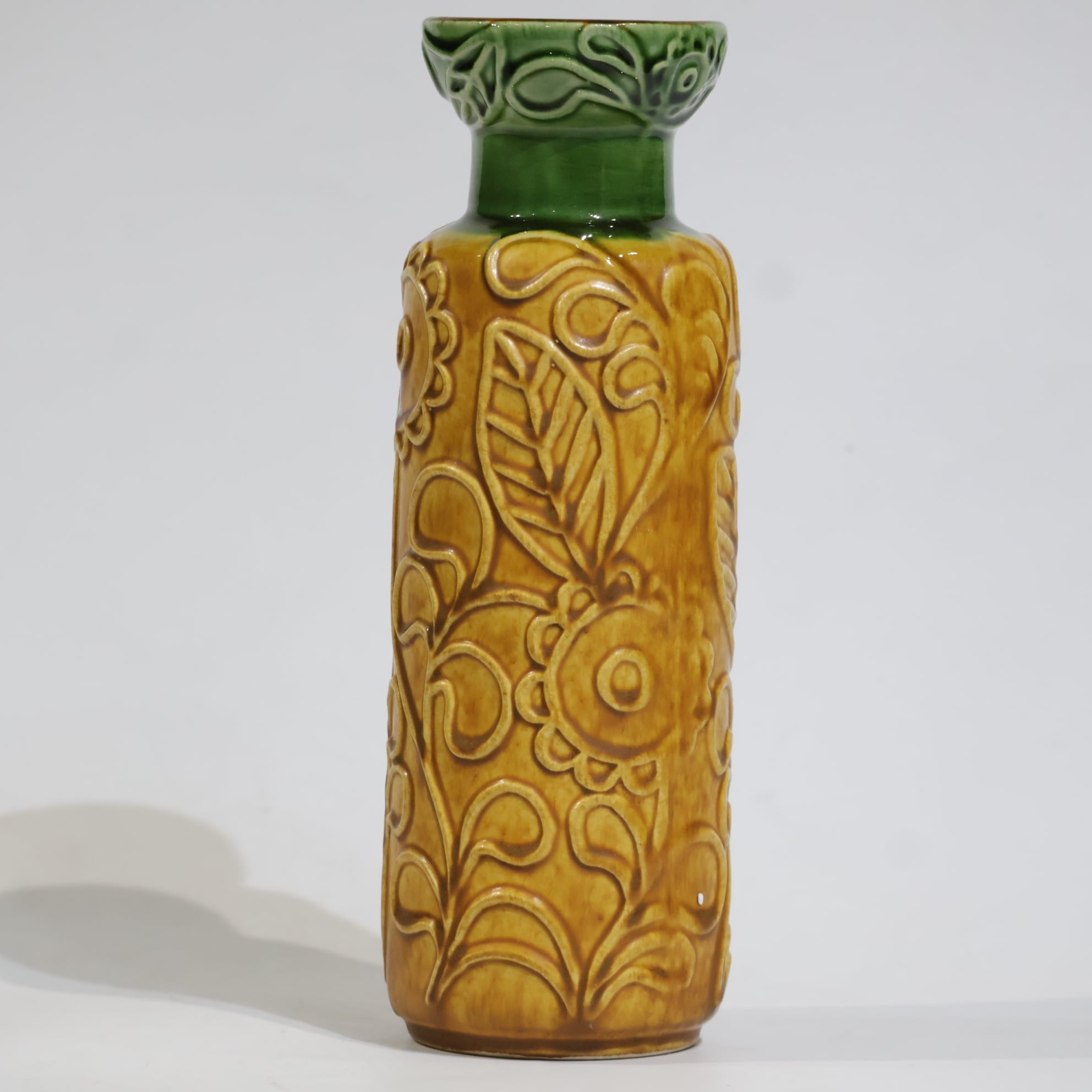 マスタードイエローの釉が彫りの陰影を柔らかく拾い、葉や花のモチーフを際立たせています。首元はグリーンで切り替えられ、上下で明確なコントラストを形成していて、穏やかながらアクセントになりますね。