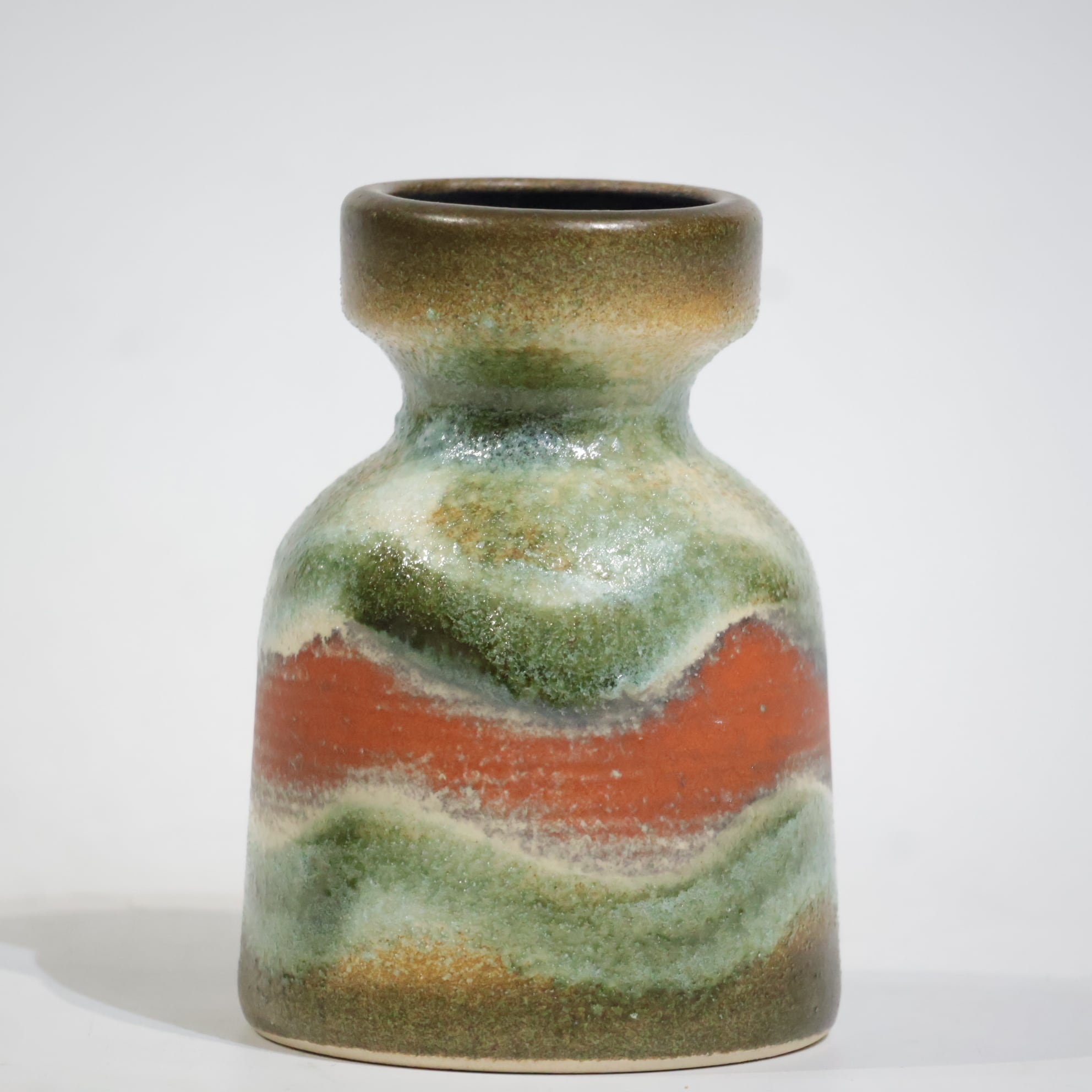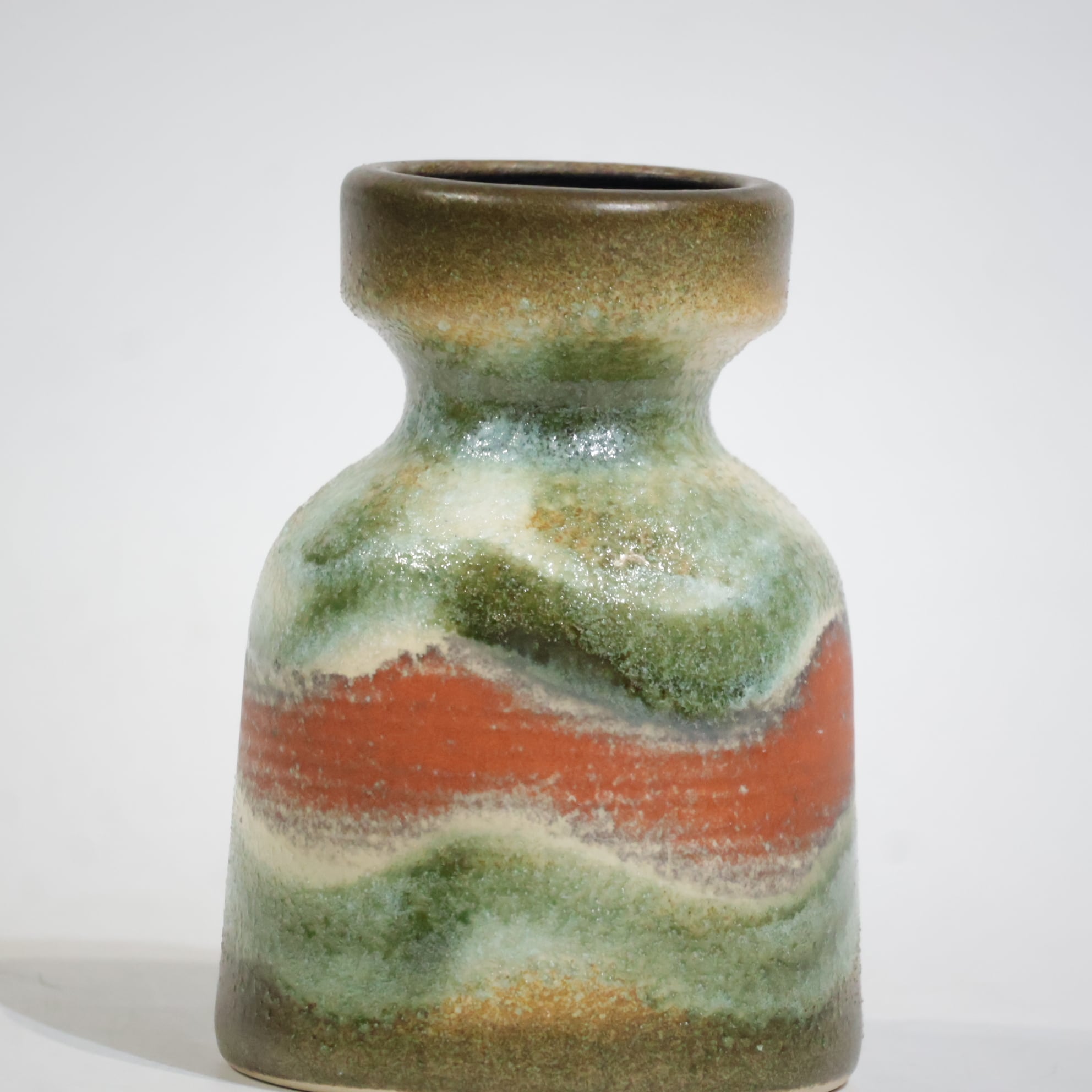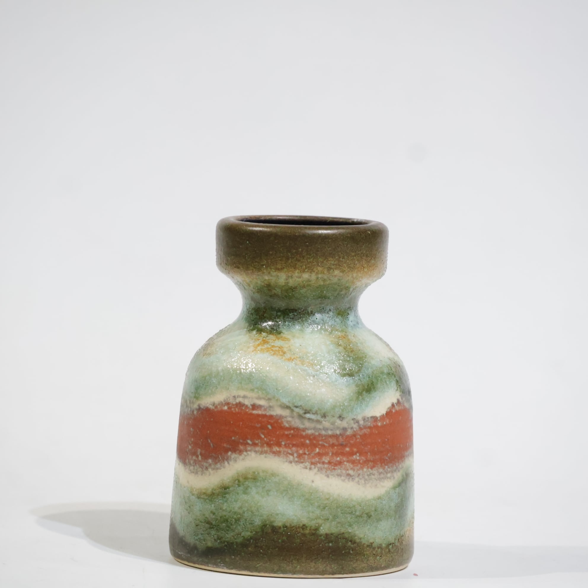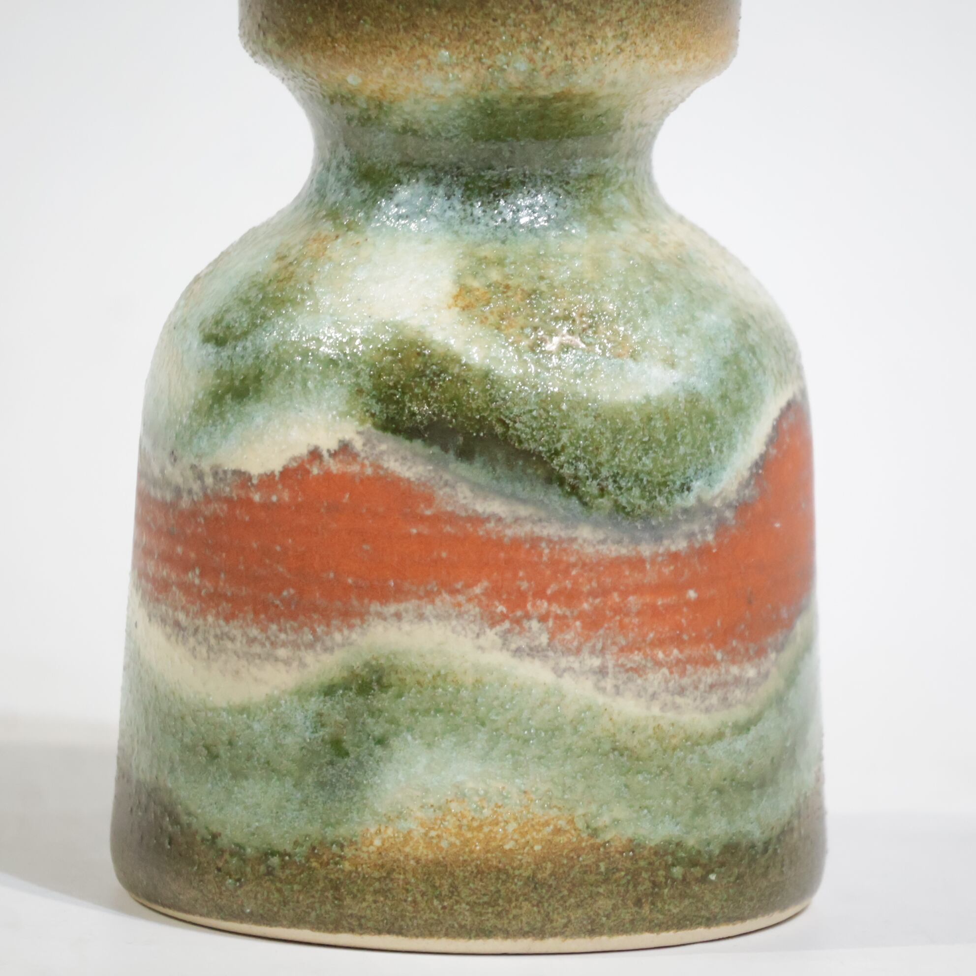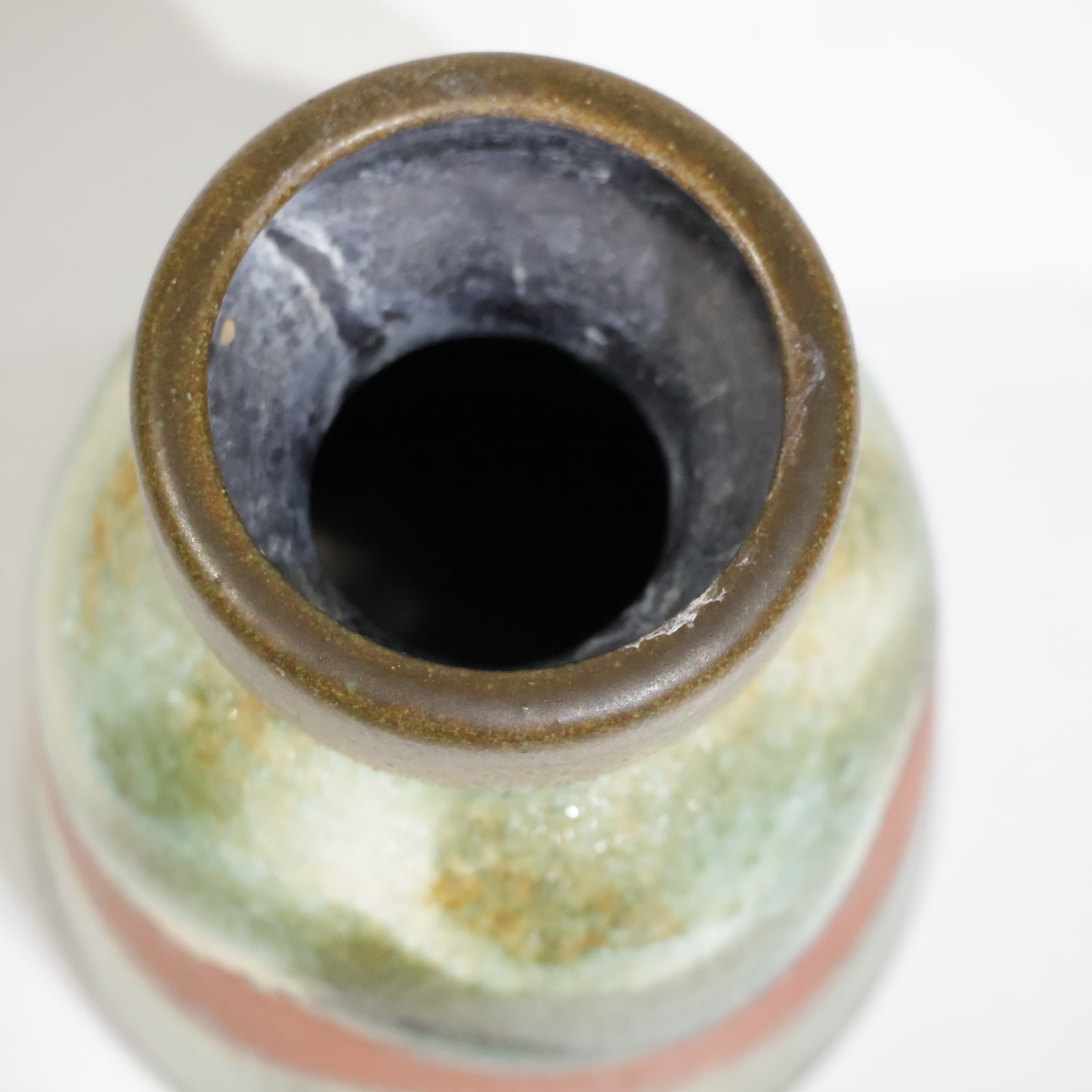 1960年代後半には一目で見分けがつく銅色の釉薬を開発し、ベージュの色調や泡状の滴る溶岩釉との組み合わせがよく用いられていました。