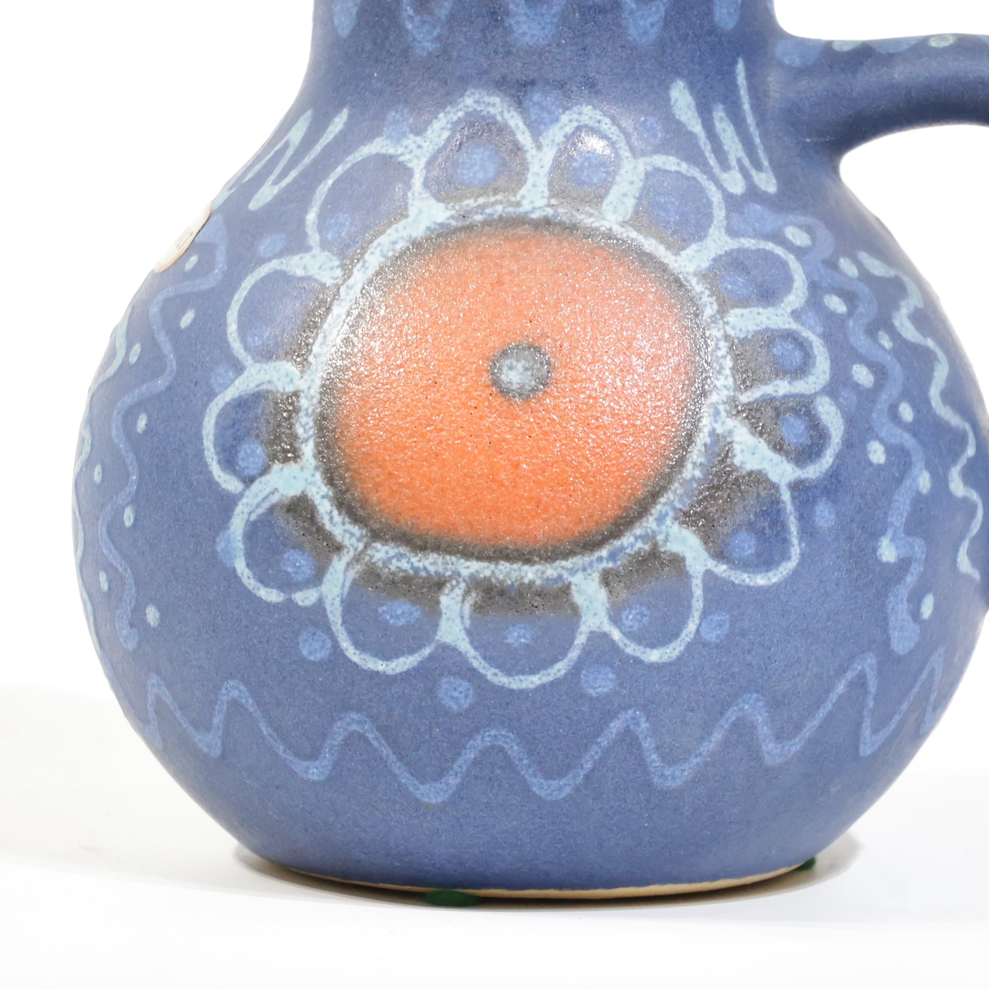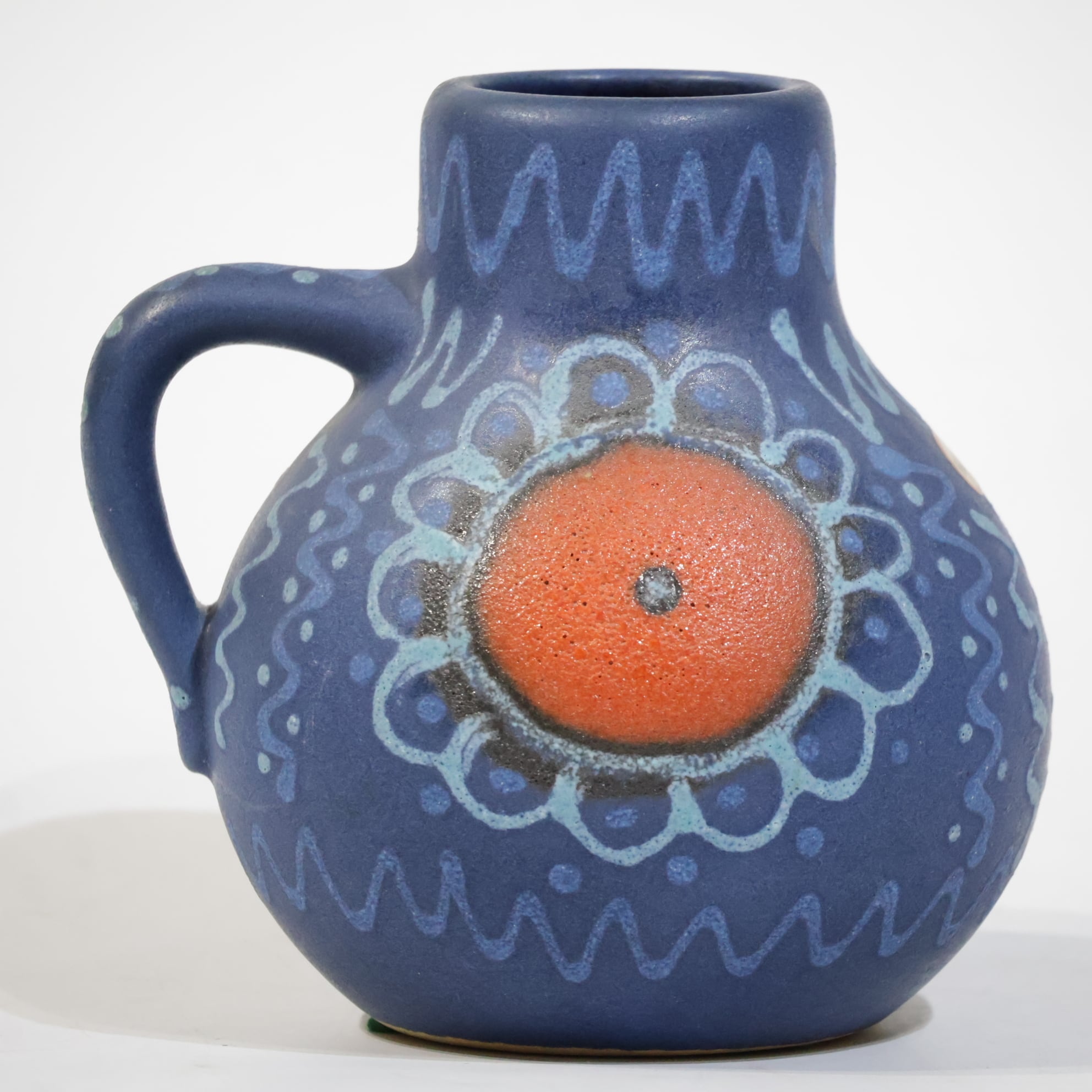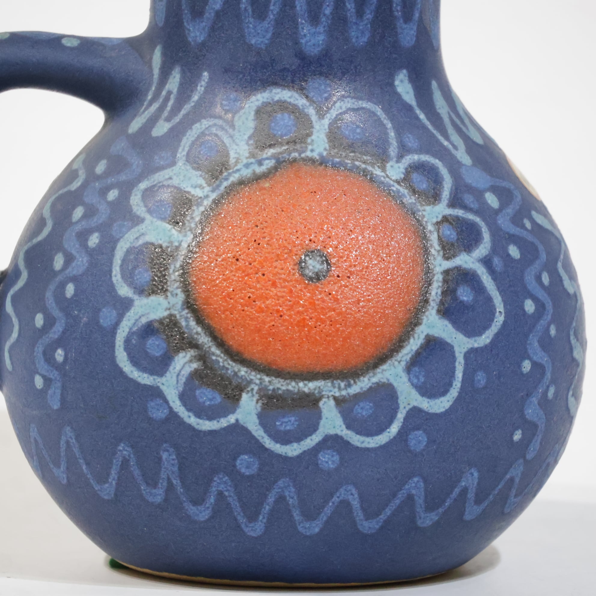中央の橙色円形文様は、Silberdistelでよくみられる代表的な装飾構成のひとつで、手仕事の痕跡が明確に残っています。