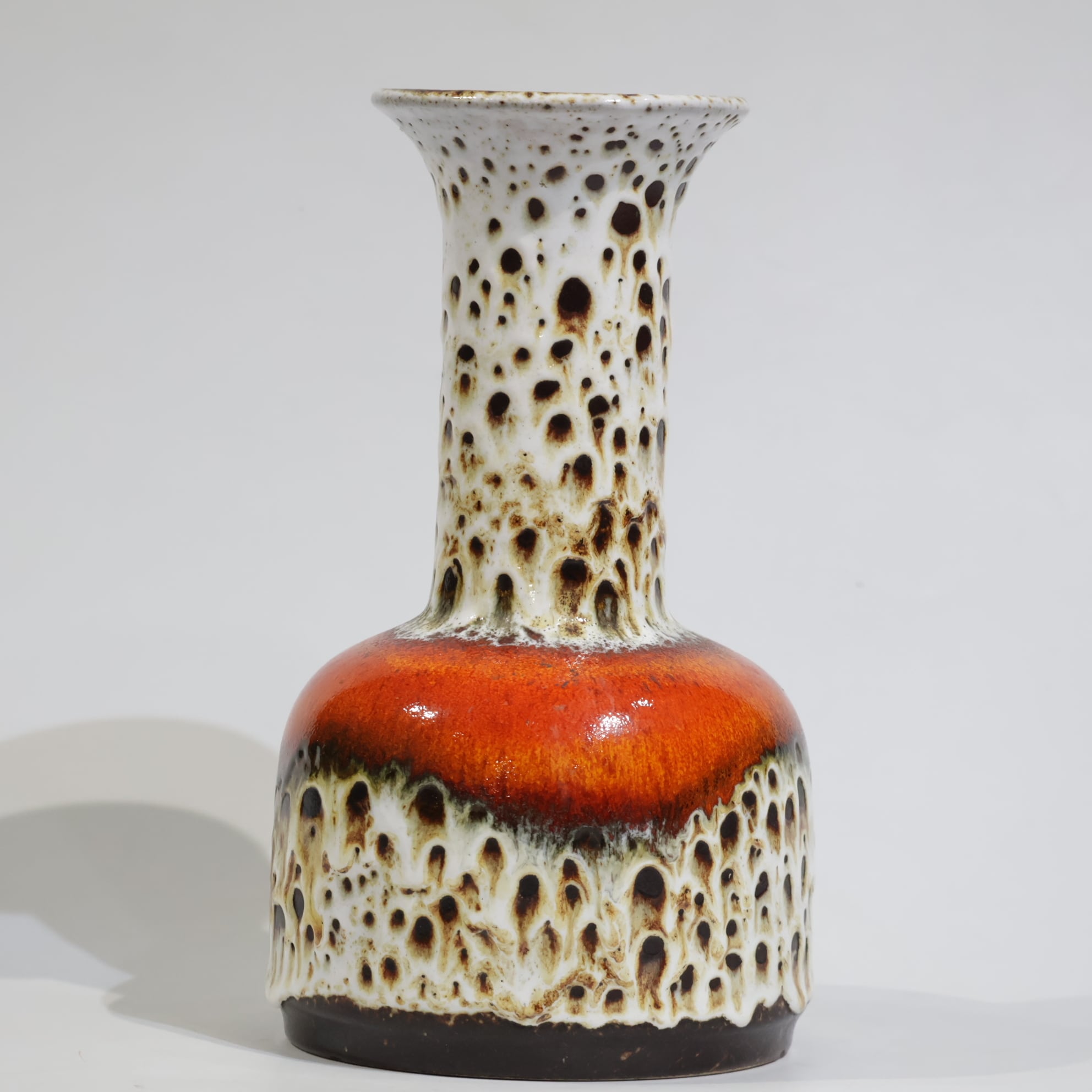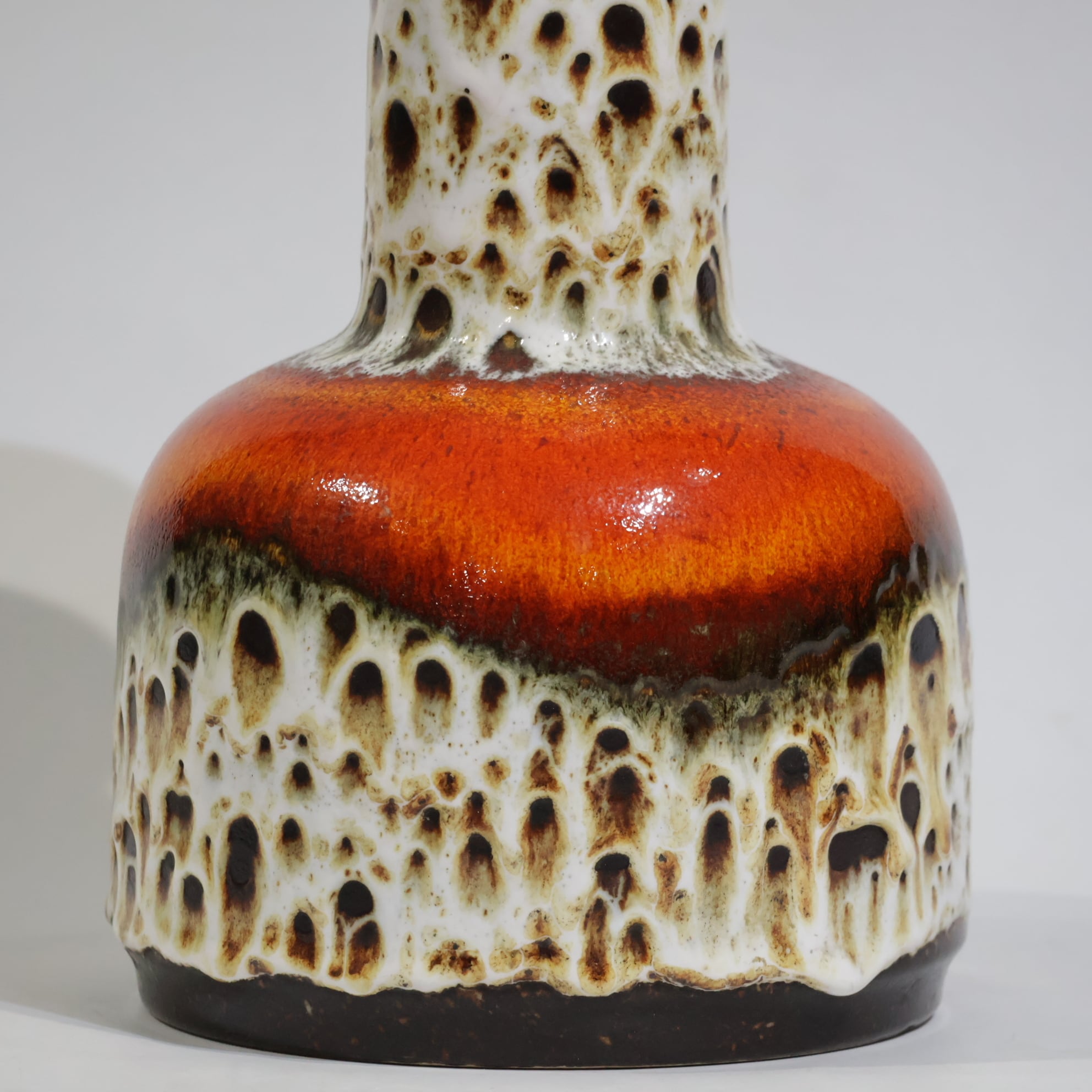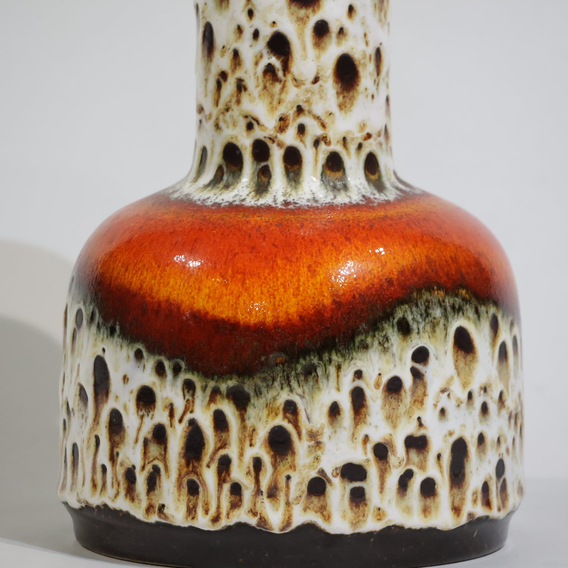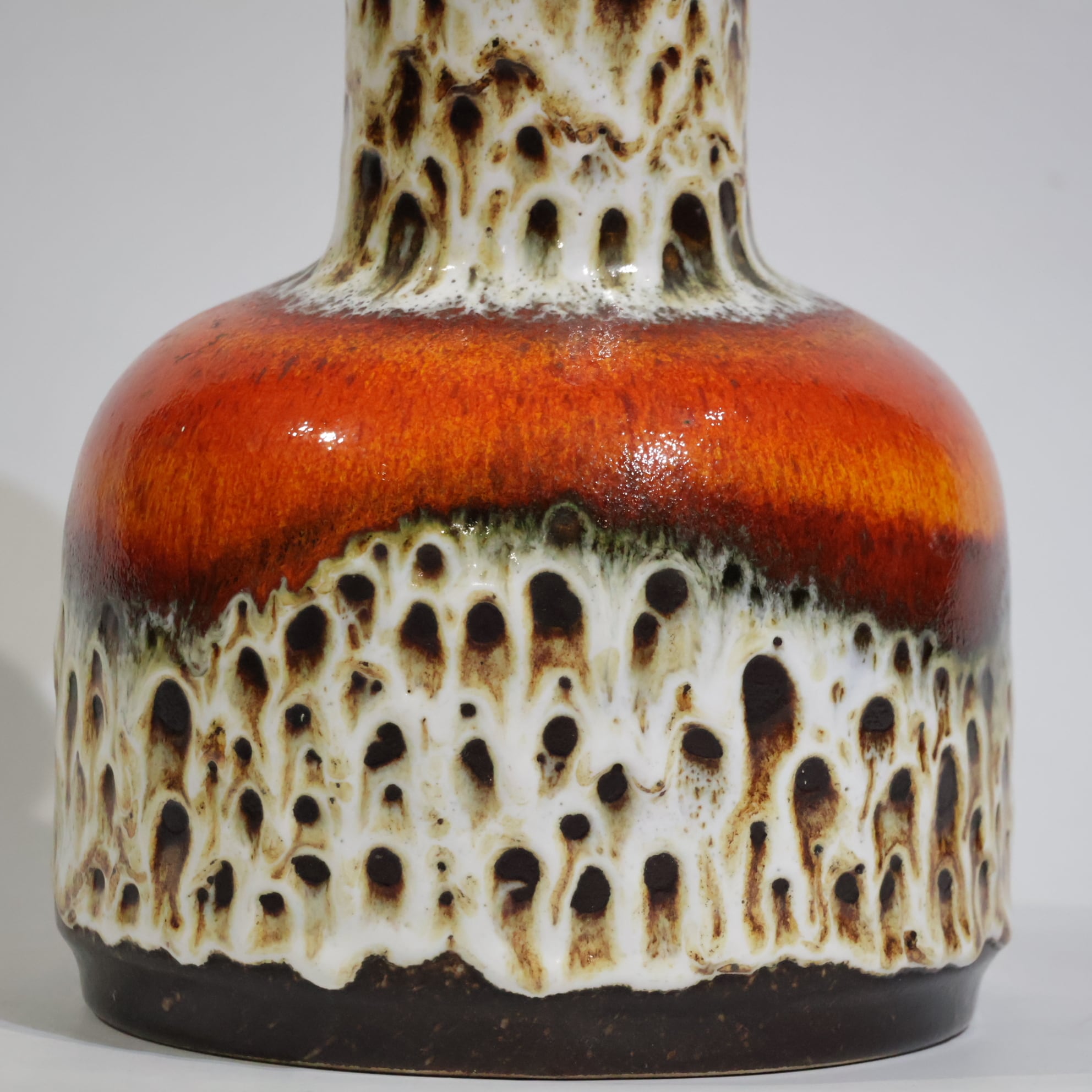 Fat Lava期特有の力強い釉薬表現と、Jasbaらしい造形の美しさが見事に調和した作品。視線を奪う鮮烈な色彩ながら、陰影のある質感が空間に深みを与えます。1970年代ドイツ陶芸のエネルギーをそのまま封じ込めたような一点です。