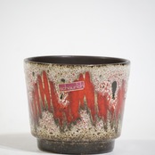 同社は急速に成長し、1950~80年代には陶 器製造の分野でドイツ最大のメーカーとなり、今日も確固たる地位を維持しています。形状に加えて釉薬でも、当時は最も幅広い品揃えを誇った他、輸出量も最大だったため、現在でも同社の製品はよく見られます。特に円筒形を基調にし たシンプルな形状で、型押し模様のある床置き 花瓶が代表的。色彩については当時主流だっ た赤やオレンジから、クリーム、ベージュ、茶色 などが多くを占めています。