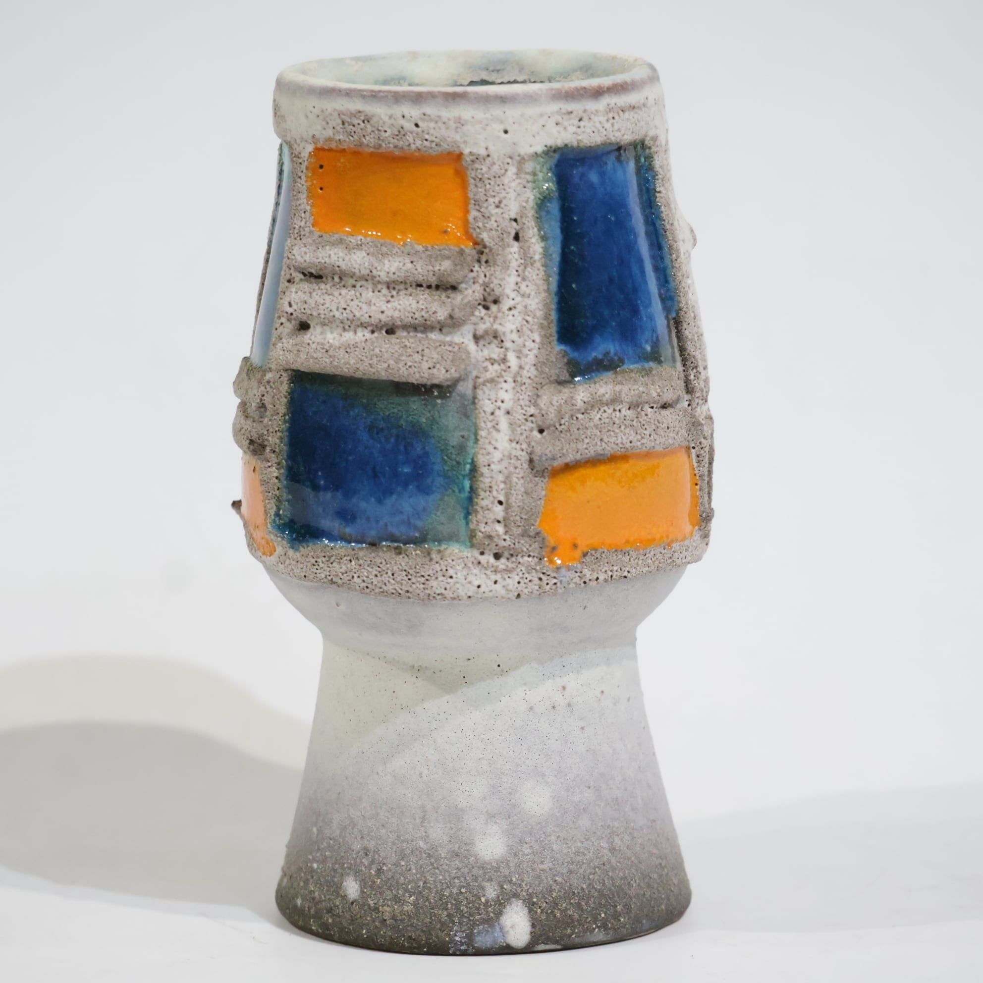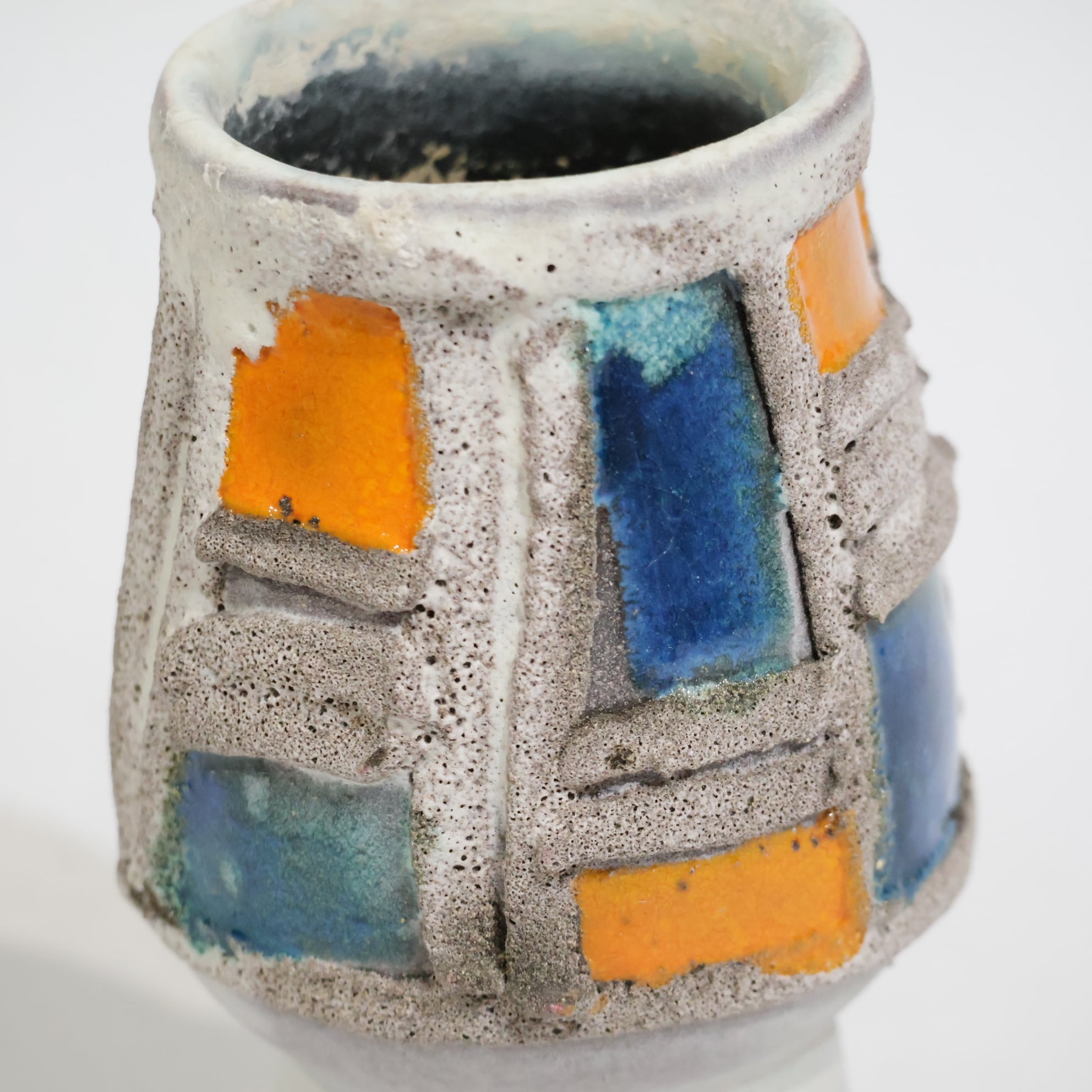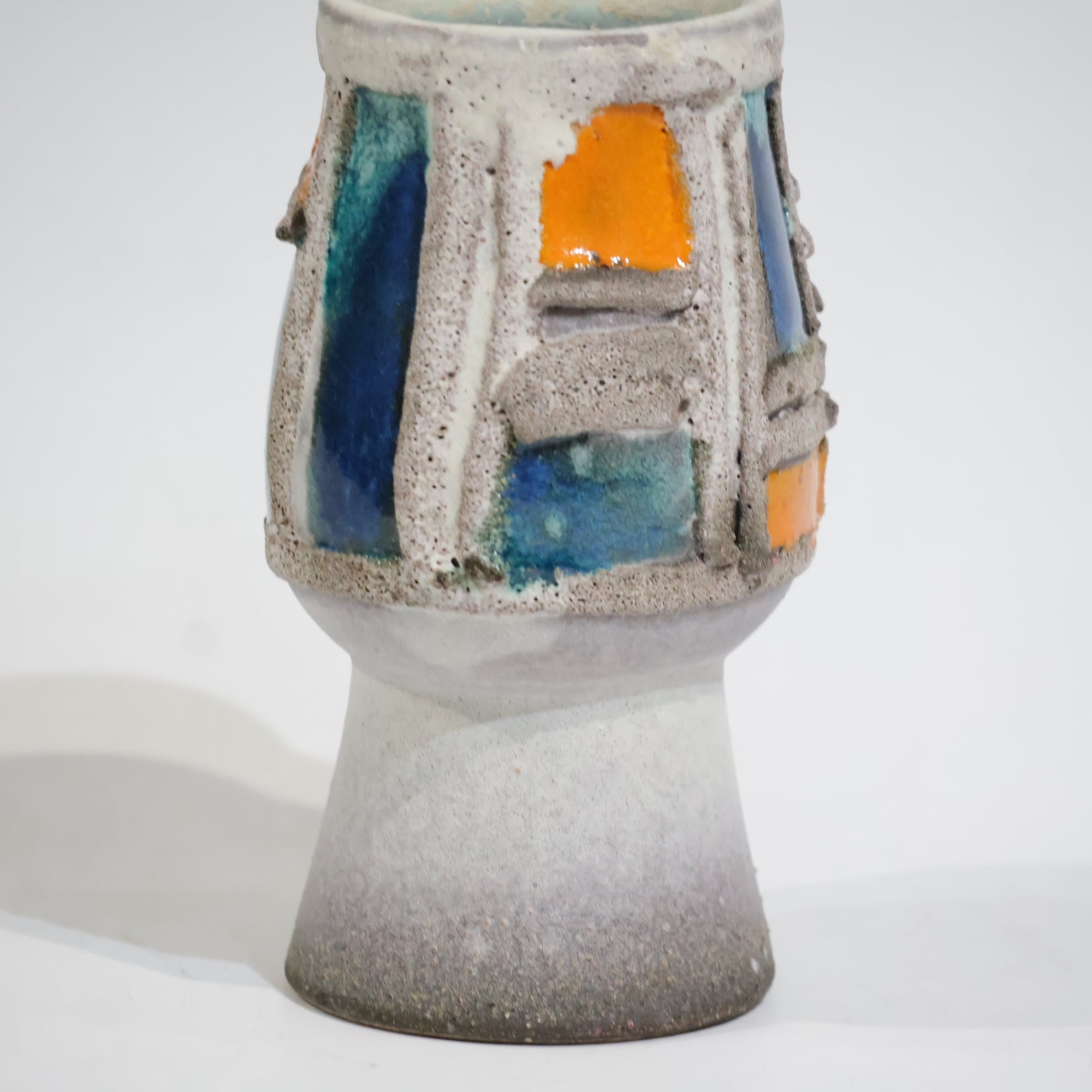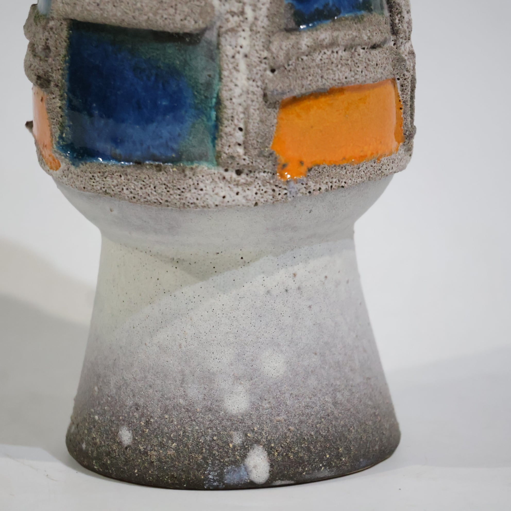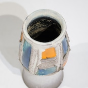粗いテクスチャーのベースに、オレンジとブルーの釉薬がはめ込まれたような立体的装飾が印象的な一点。枠状のレリーフで区切られた色面は、まるで抽象絵画の断片のように配置され、力強いコントラストを生み出しています。