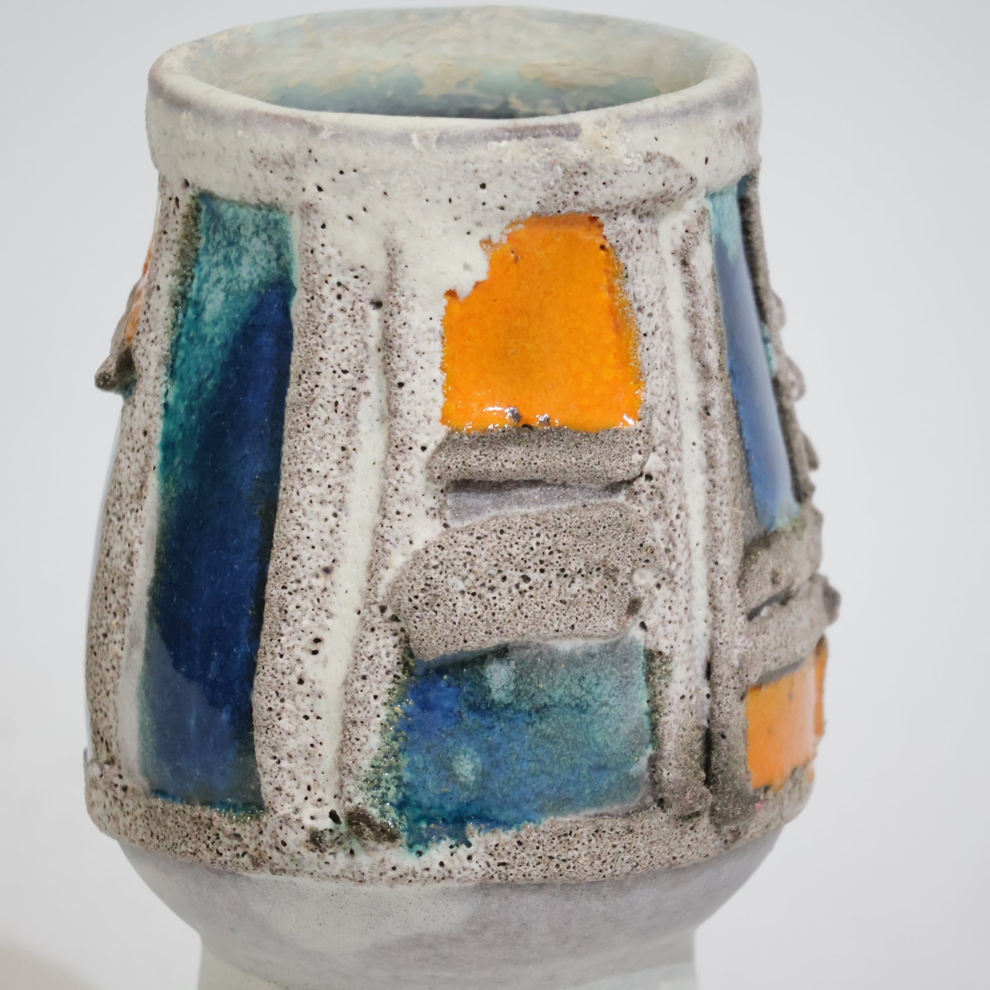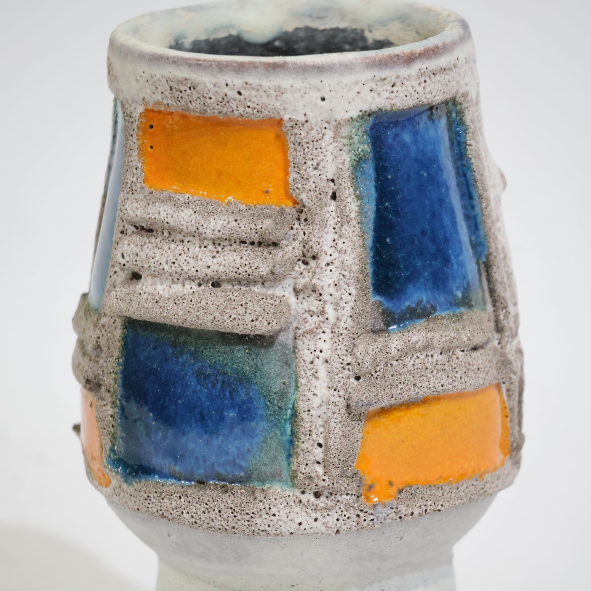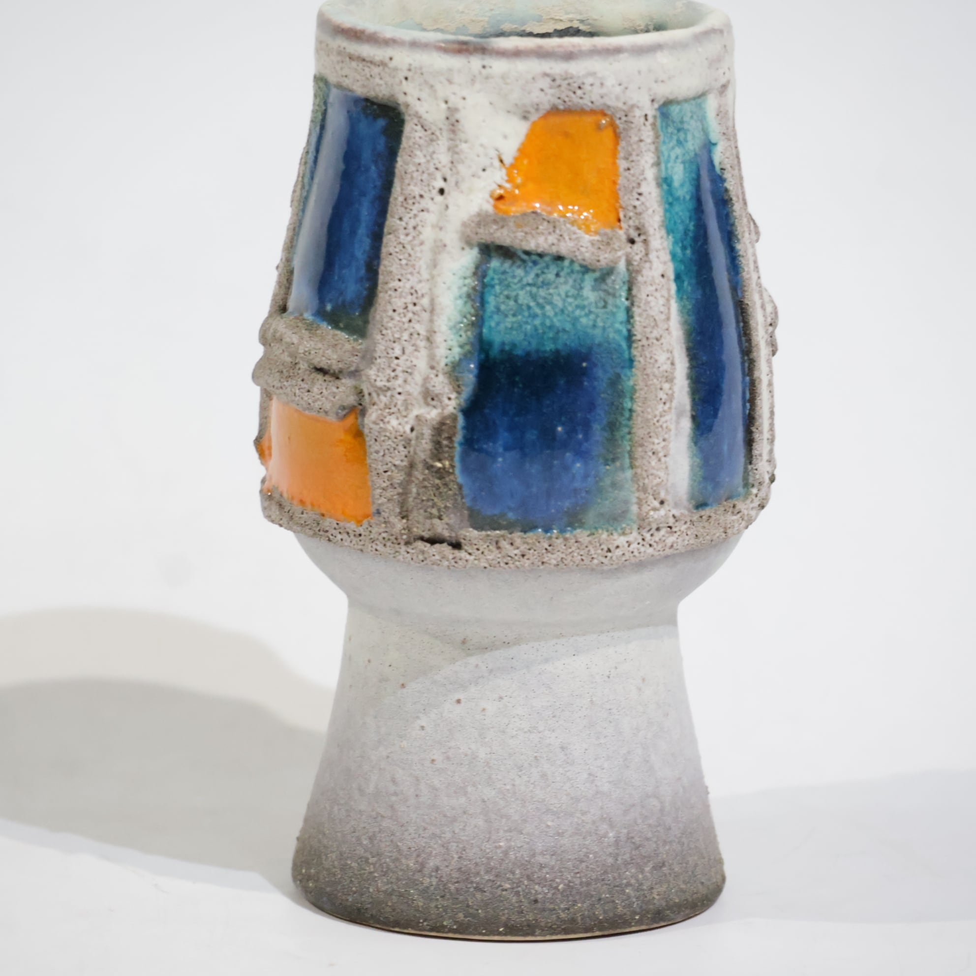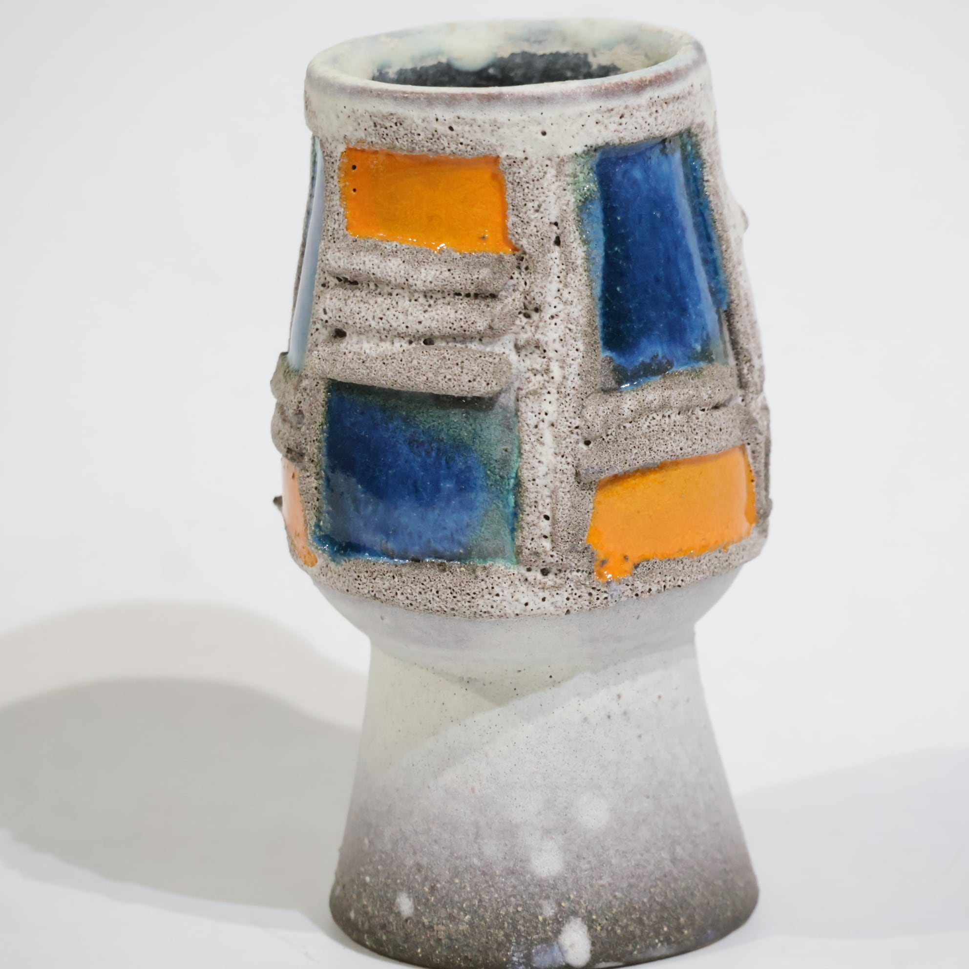 粗いテクスチャーのベースに、オレンジとブルーの釉薬がはめ込まれたような立体的装飾が印象的な一点。枠状のレリーフで区切られた色面は、まるで抽象絵画の断片のように配置され、力強いコントラストを生み出しています。