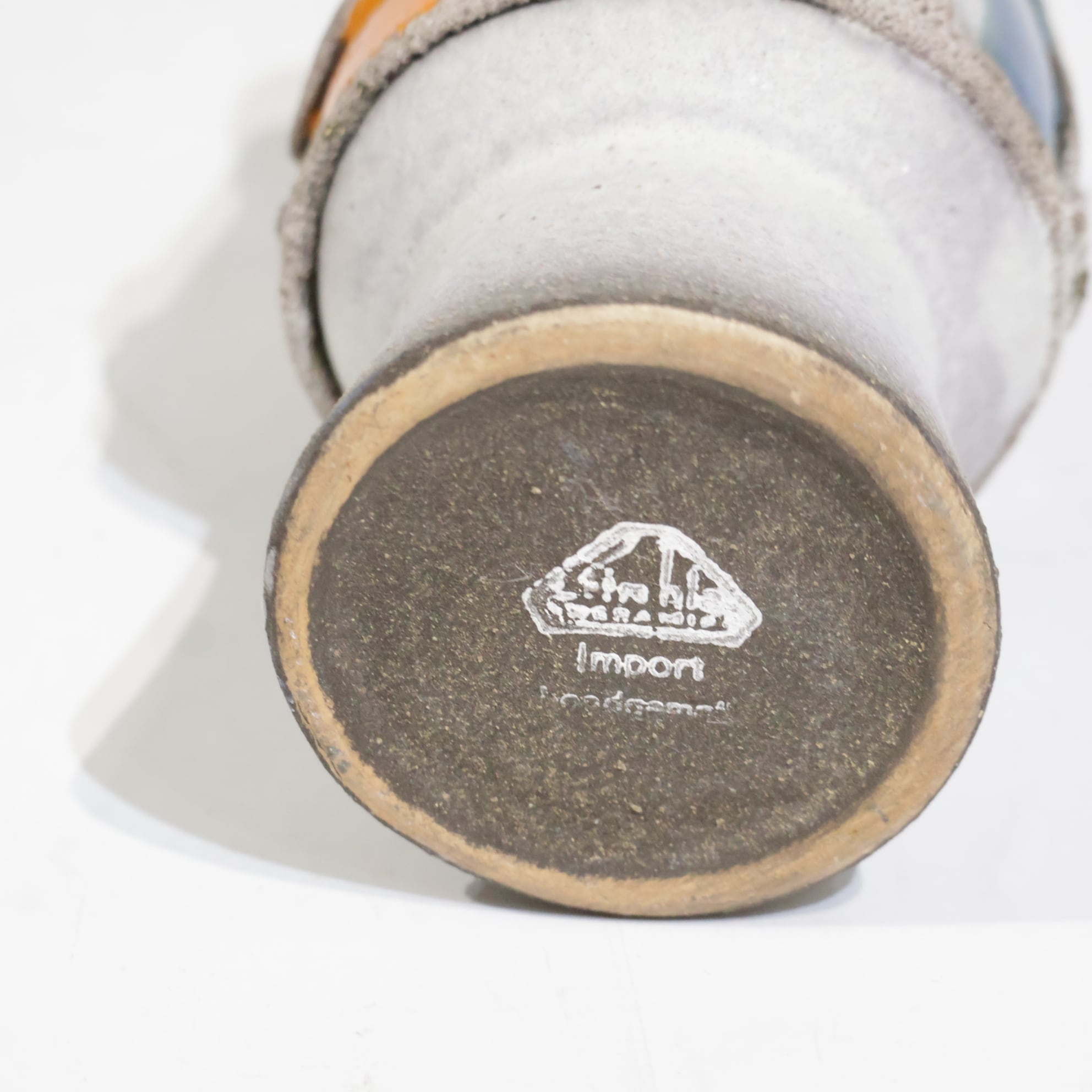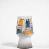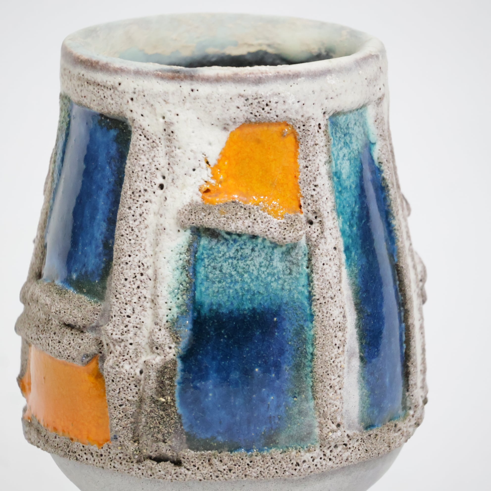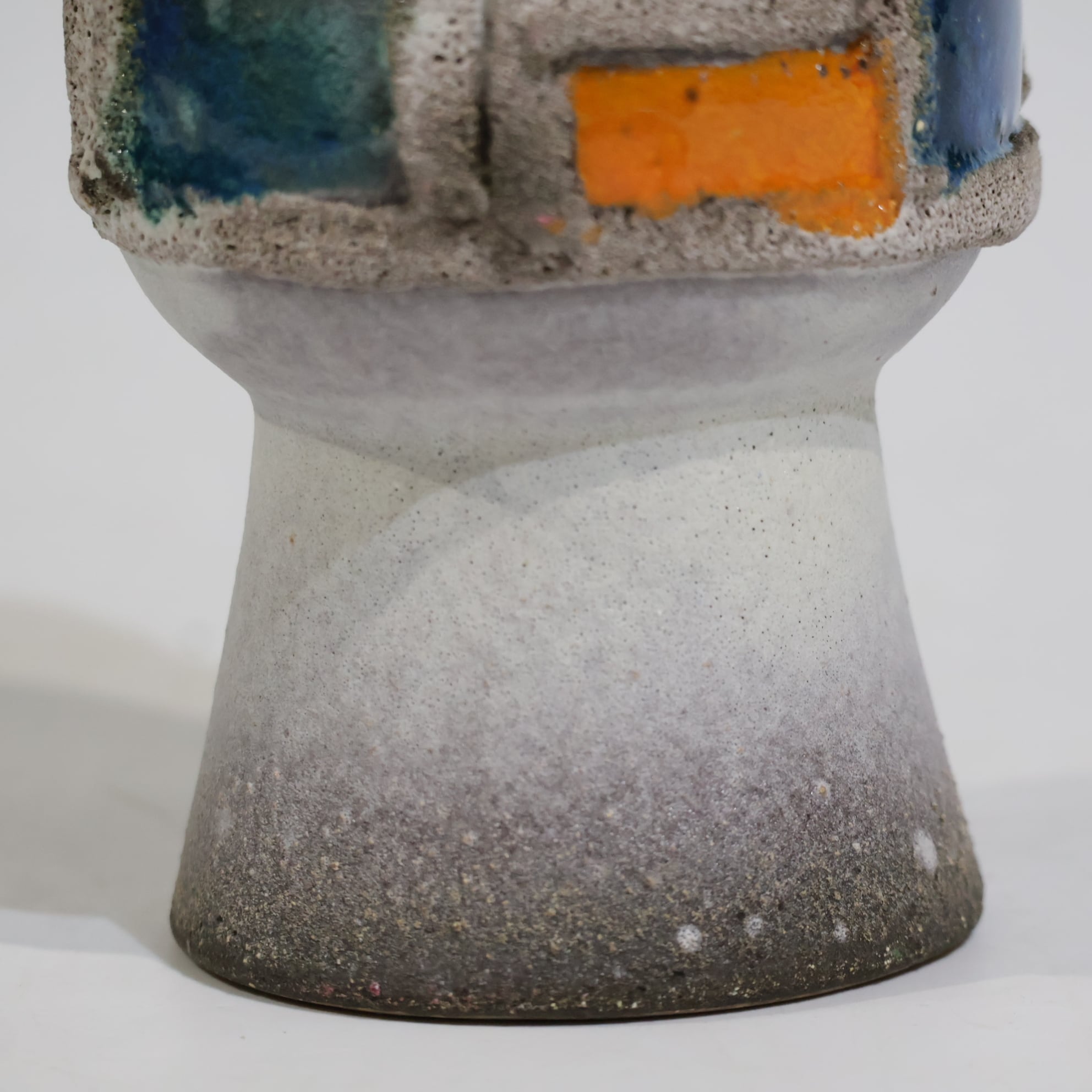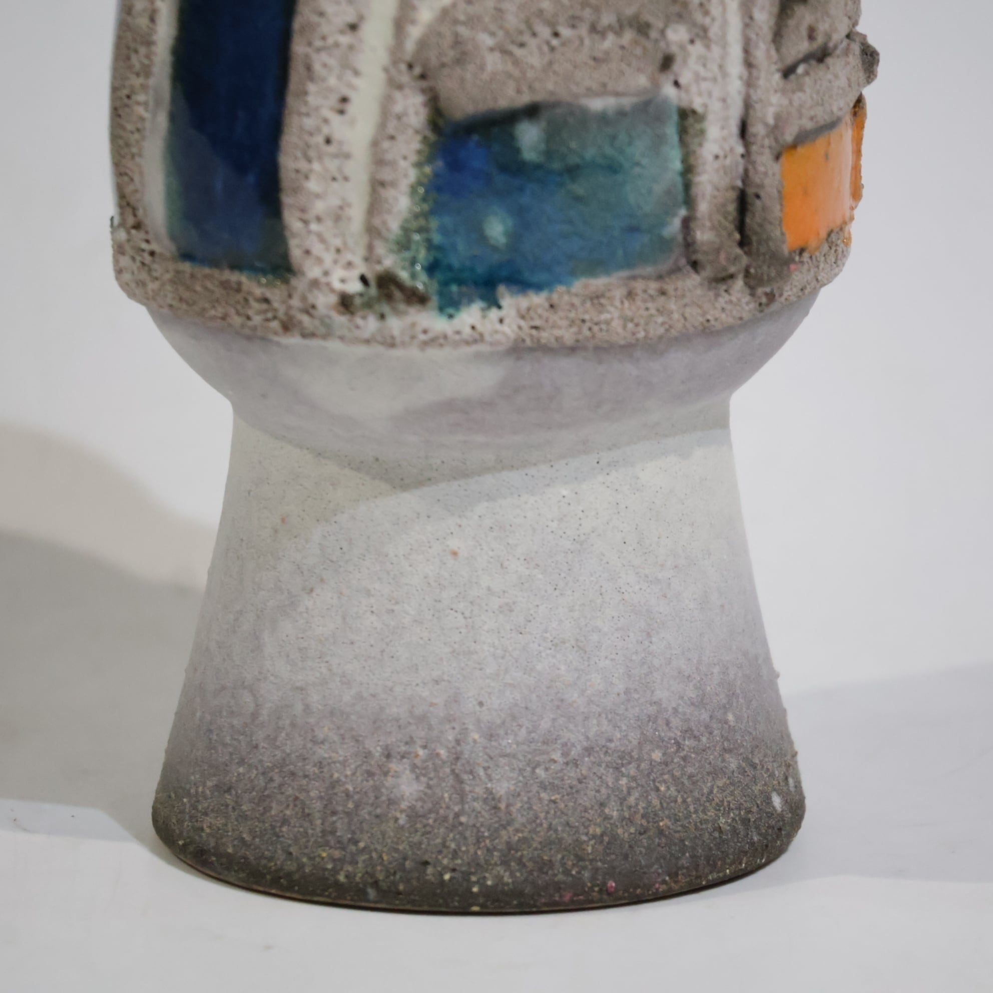 粗いテクスチャーのベースに、オレンジとブルーの釉薬がはめ込まれたような立体的装飾が印象的な一点。枠状のレリーフで区切られた色面は、まるで抽象絵画の断片のように配置され、力強いコントラストを生み出しています。