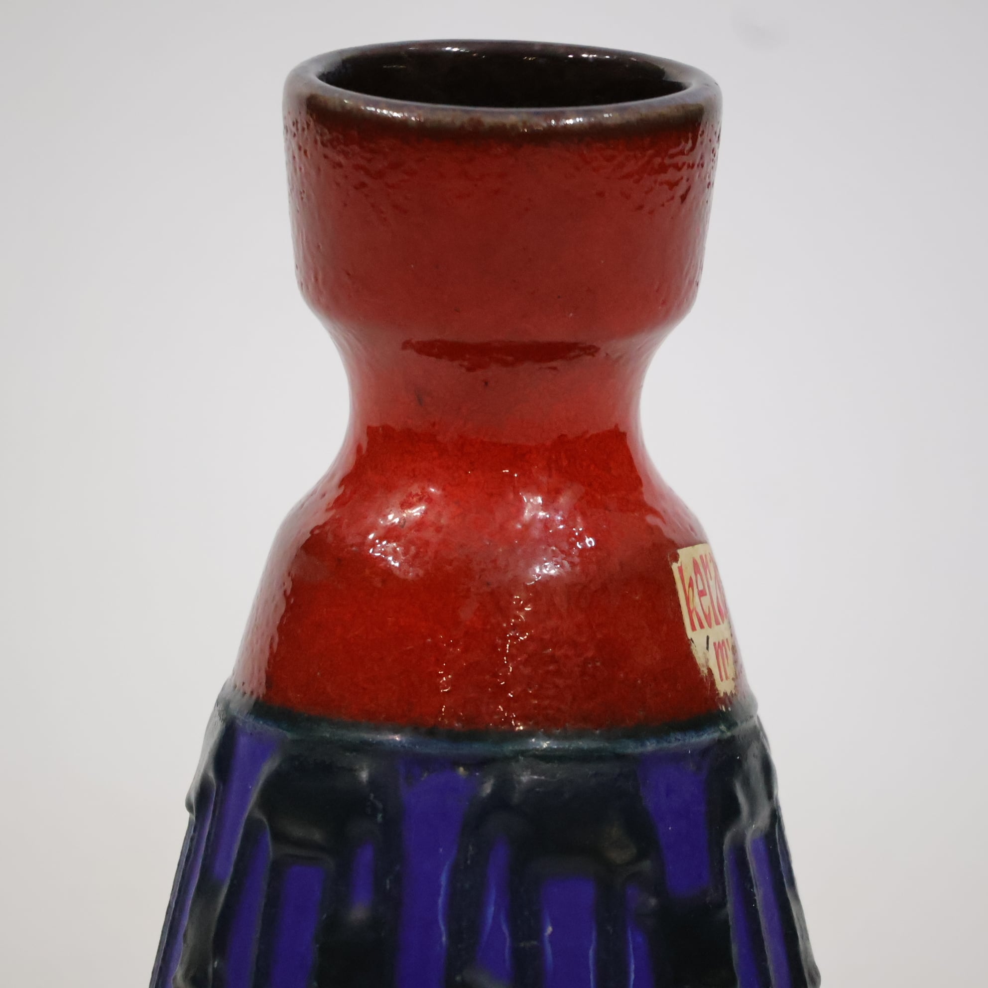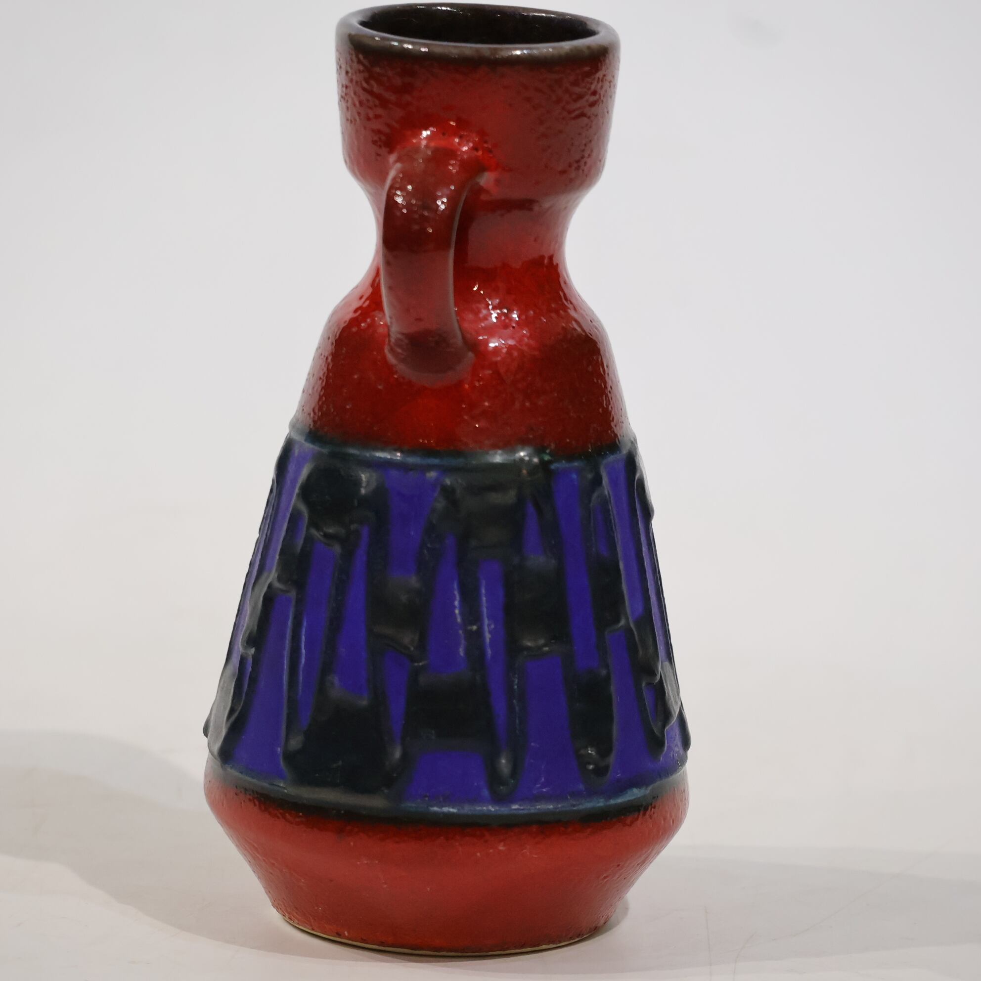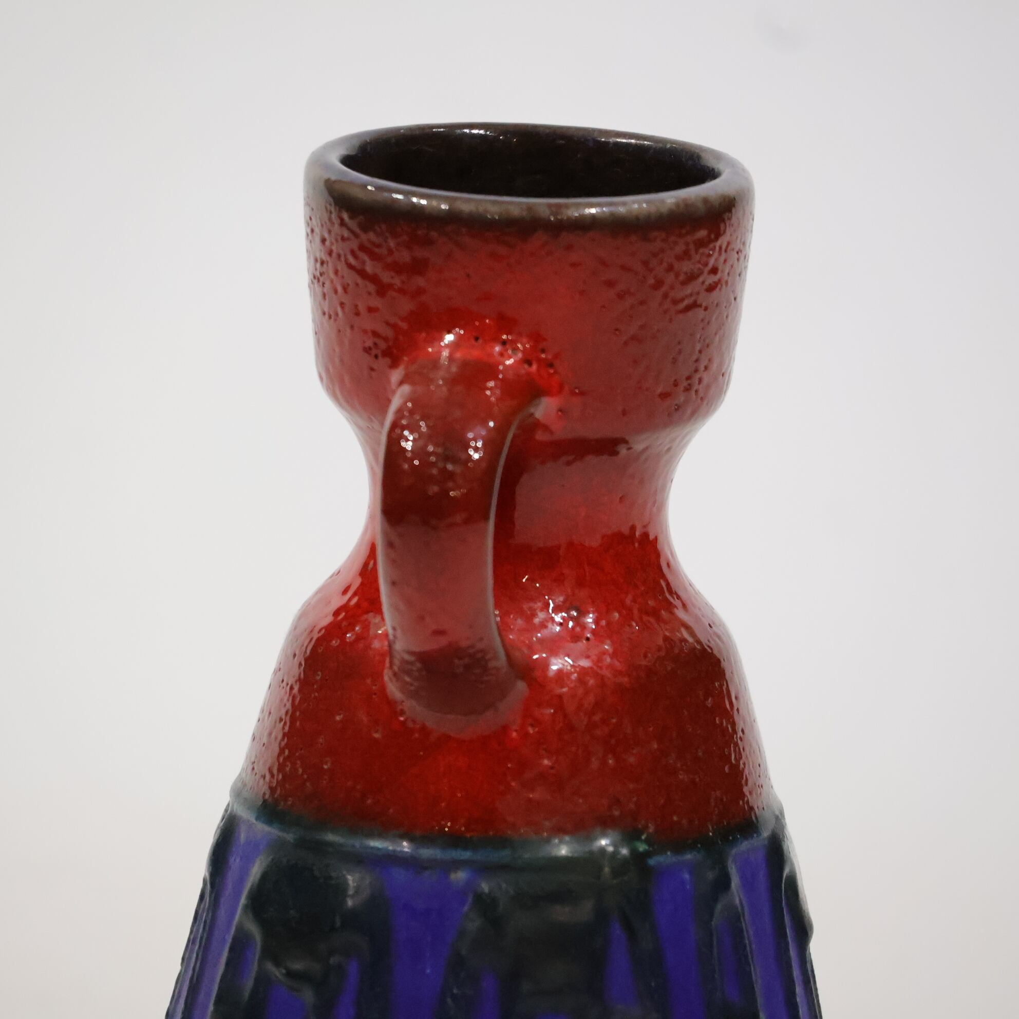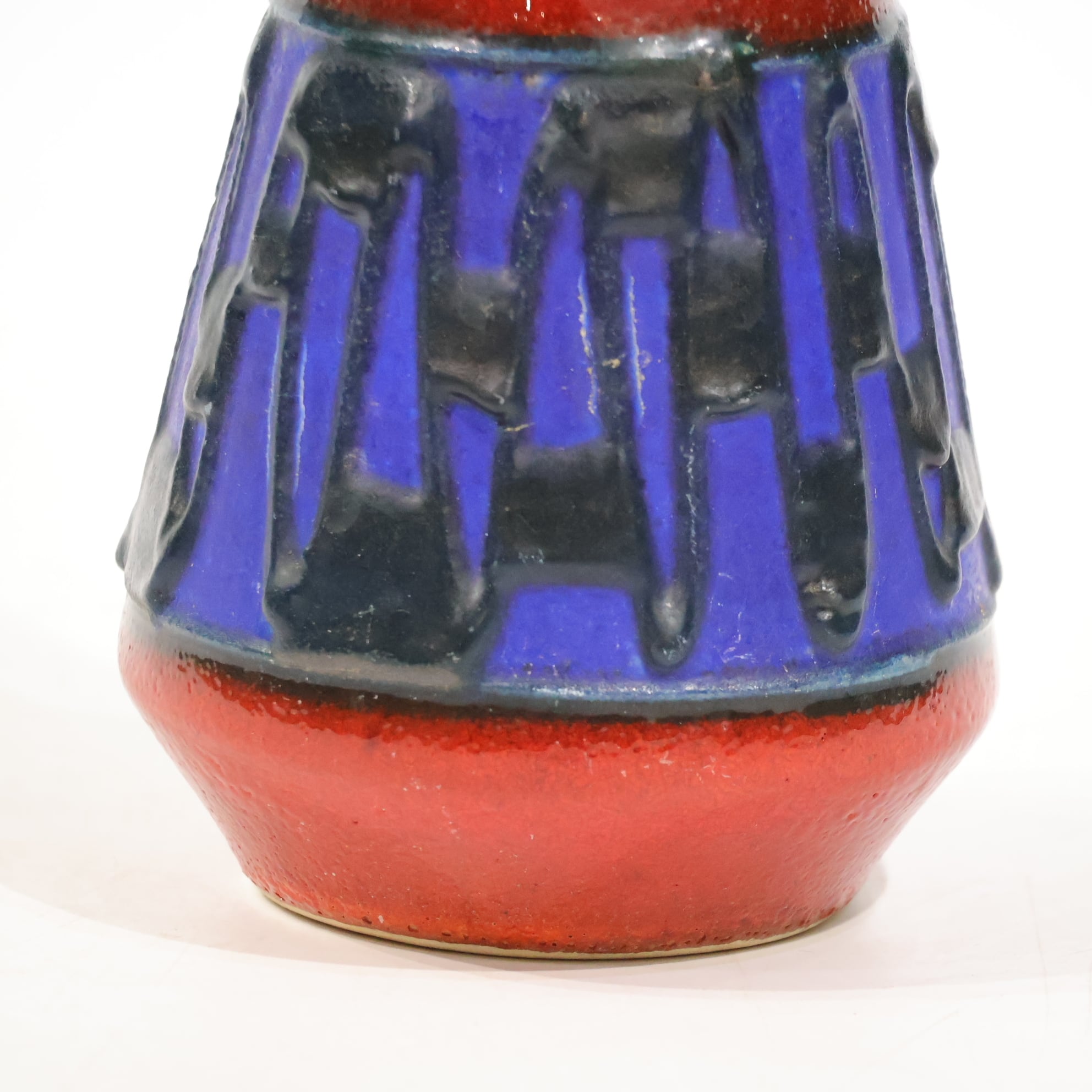 上部と下部は赤の釉でまとめられ、その間に深い青の帯が挟まれる三層構造。中央帯には縦方向のレリーフが入り、黒い釉がその凹凸に沿って流れ込み、濃淡と線の密度をつくっています。均一ではない縦のリズムが、視線を上下に引き伸ばすように働きます。
