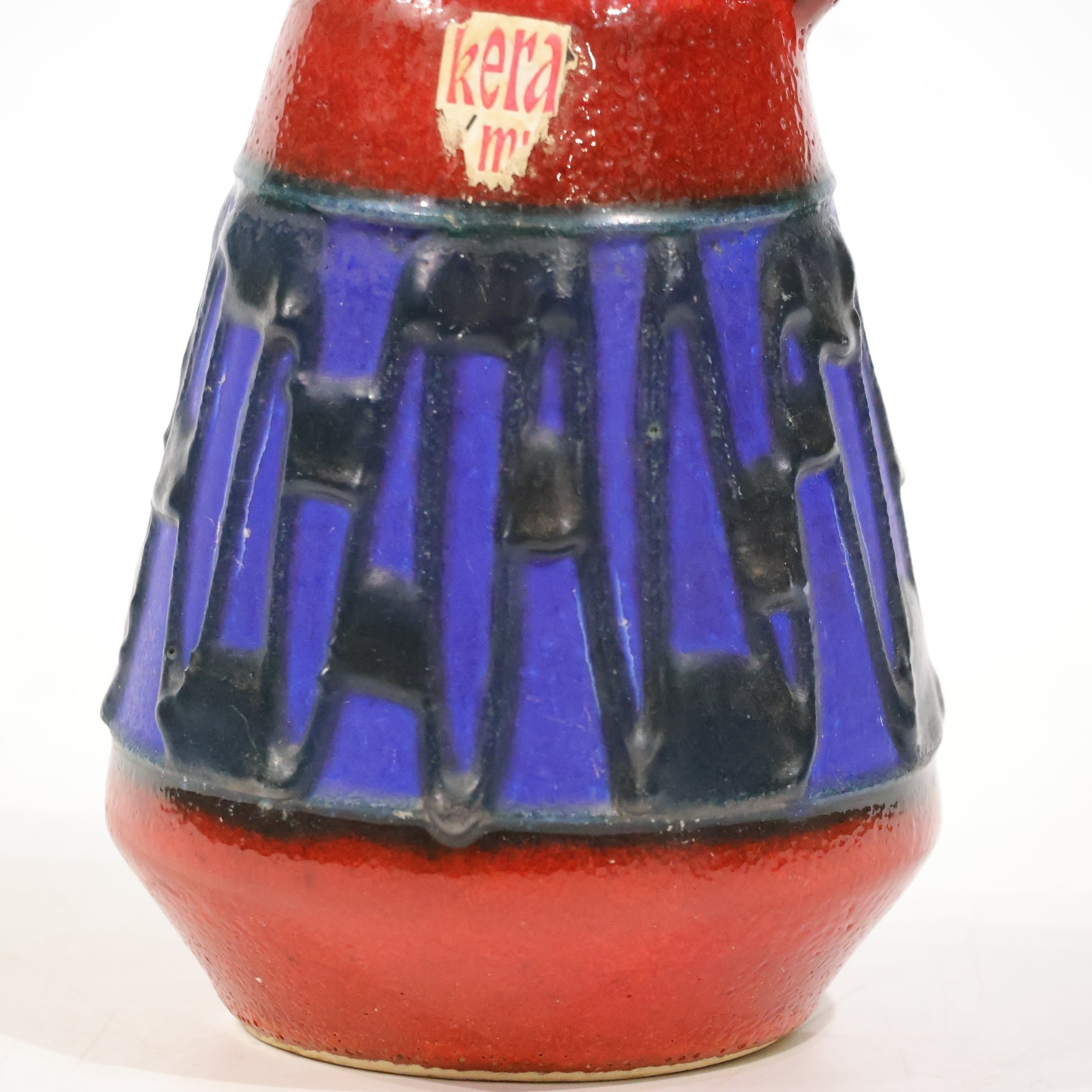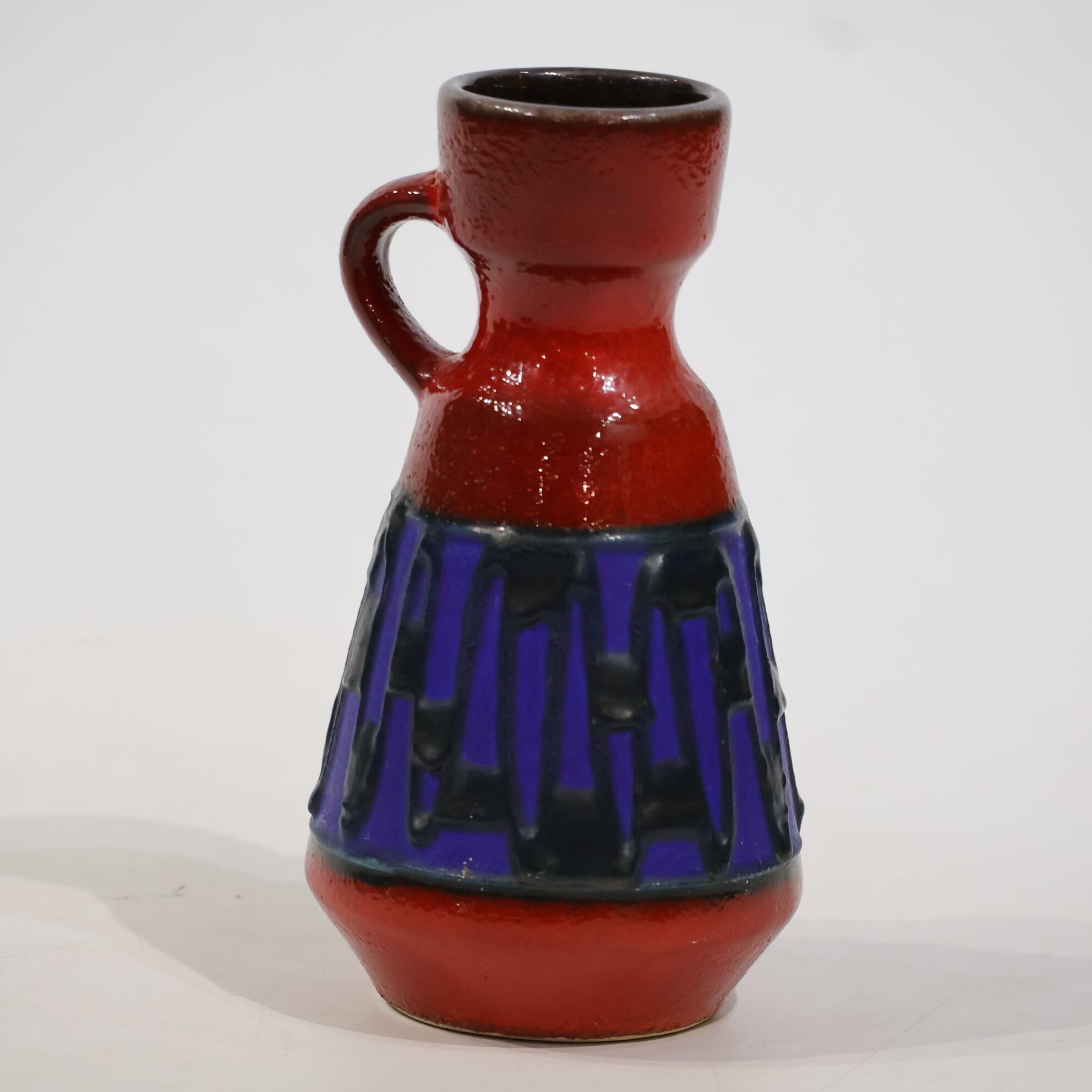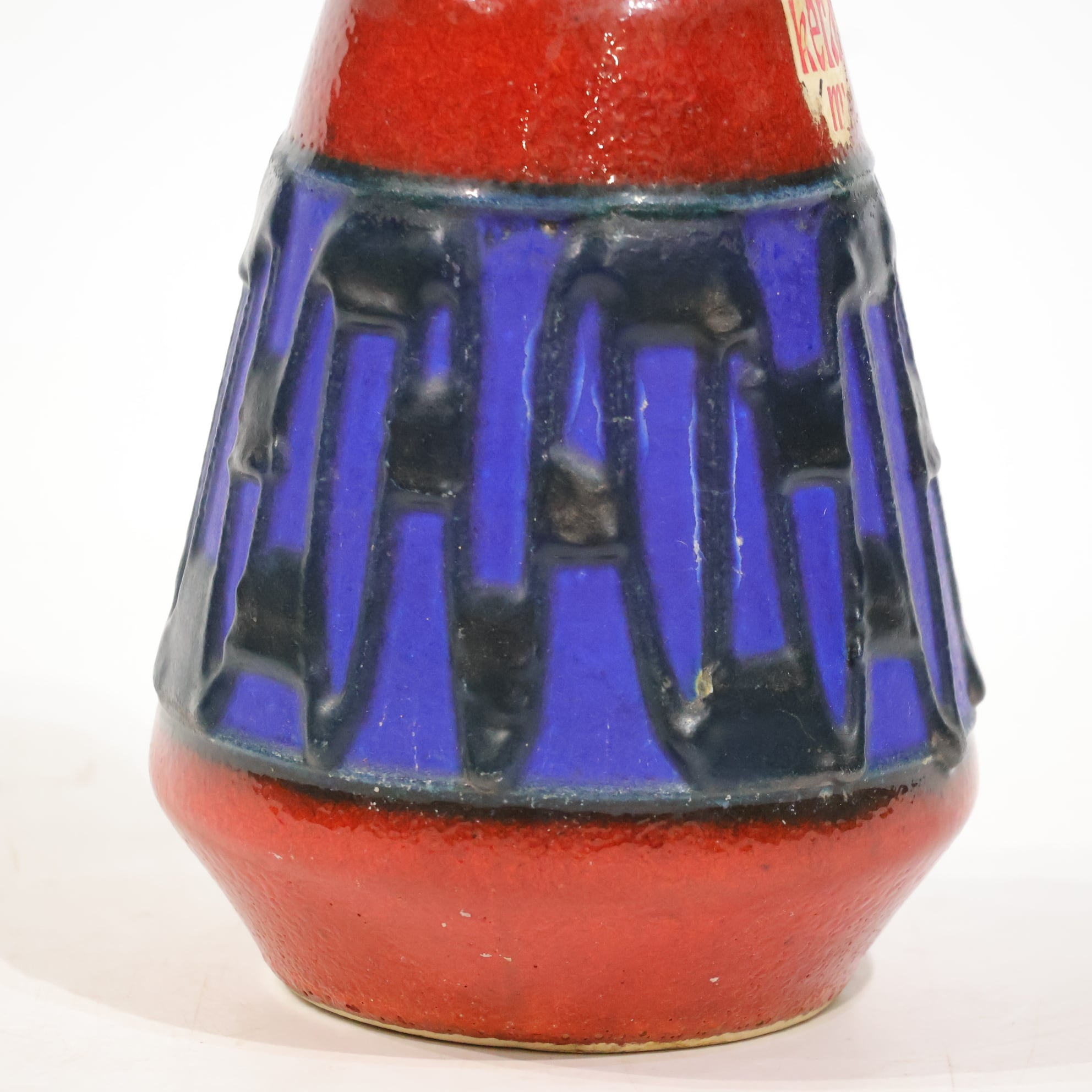 上部と下部は赤の釉でまとめられ、その間に深い青の帯が挟まれる三層構造。中央帯には縦方向のレリーフが入り、黒い釉がその凹凸に沿って流れ込み、濃淡と線の密度をつくっています。均一ではない縦のリズムが、視線を上下に引き伸ばすように働きます。