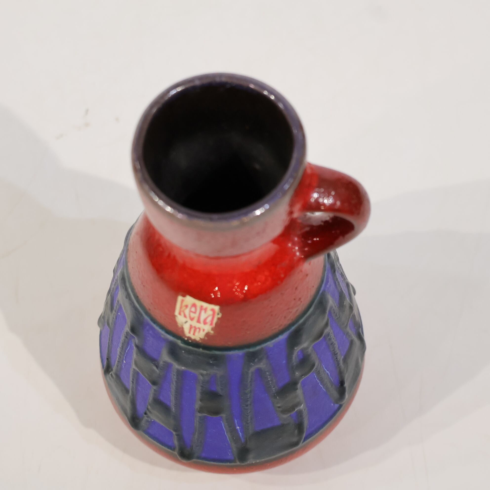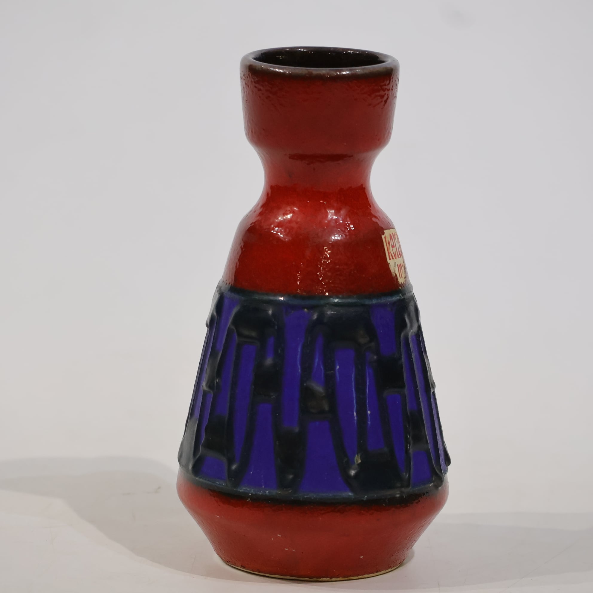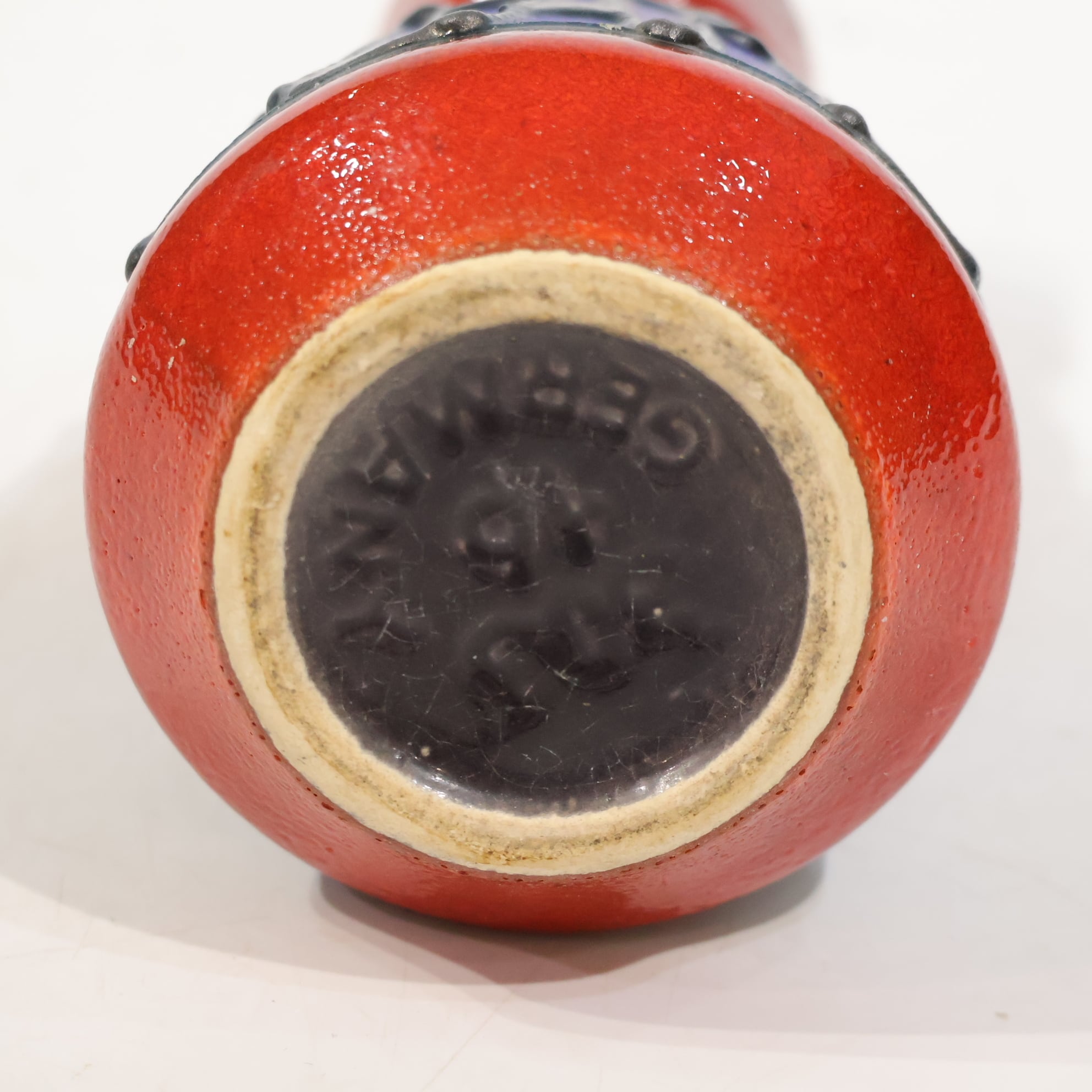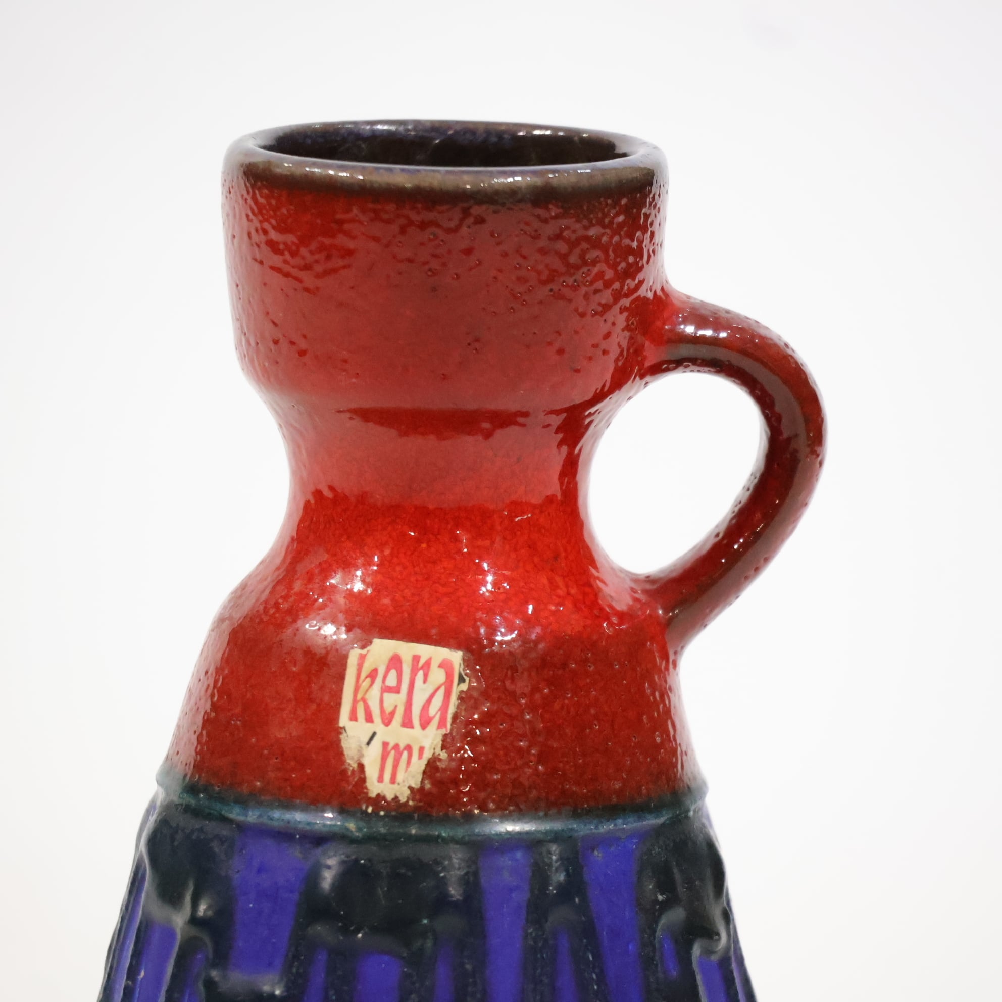 上部と下部は赤の釉でまとめられ、その間に深い青の帯が挟まれる三層構造。中央帯には縦方向のレリーフが入り、黒い釉がその凹凸に沿って流れ込み、濃淡と線の密度をつくっています。均一ではない縦のリズムが、視線を上下に引き伸ばすように働きます。
