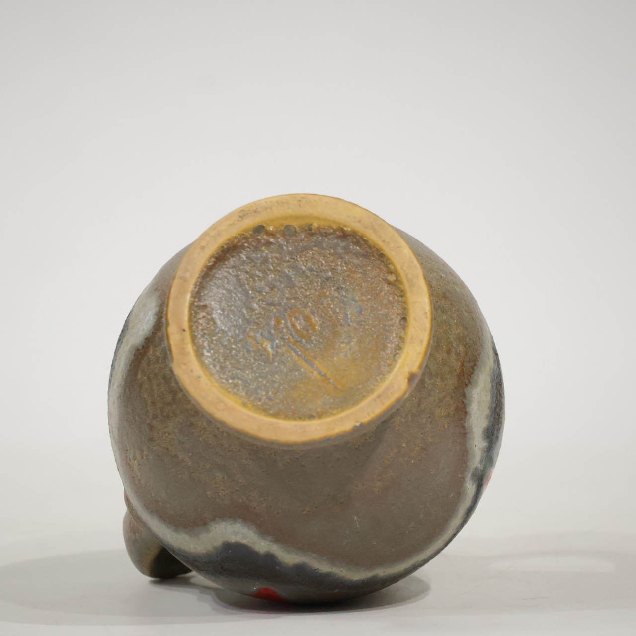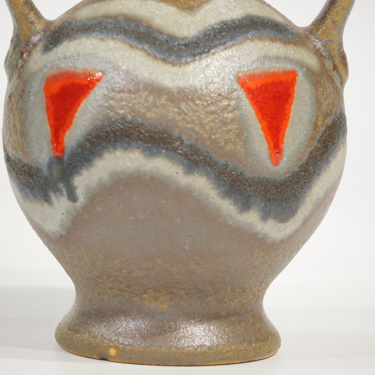 素地に近いブラウンを基調に、グレー〜オフホワイトの波状ラインが胴中央を横断し、その上に赤の三角形モチーフが配置されています。