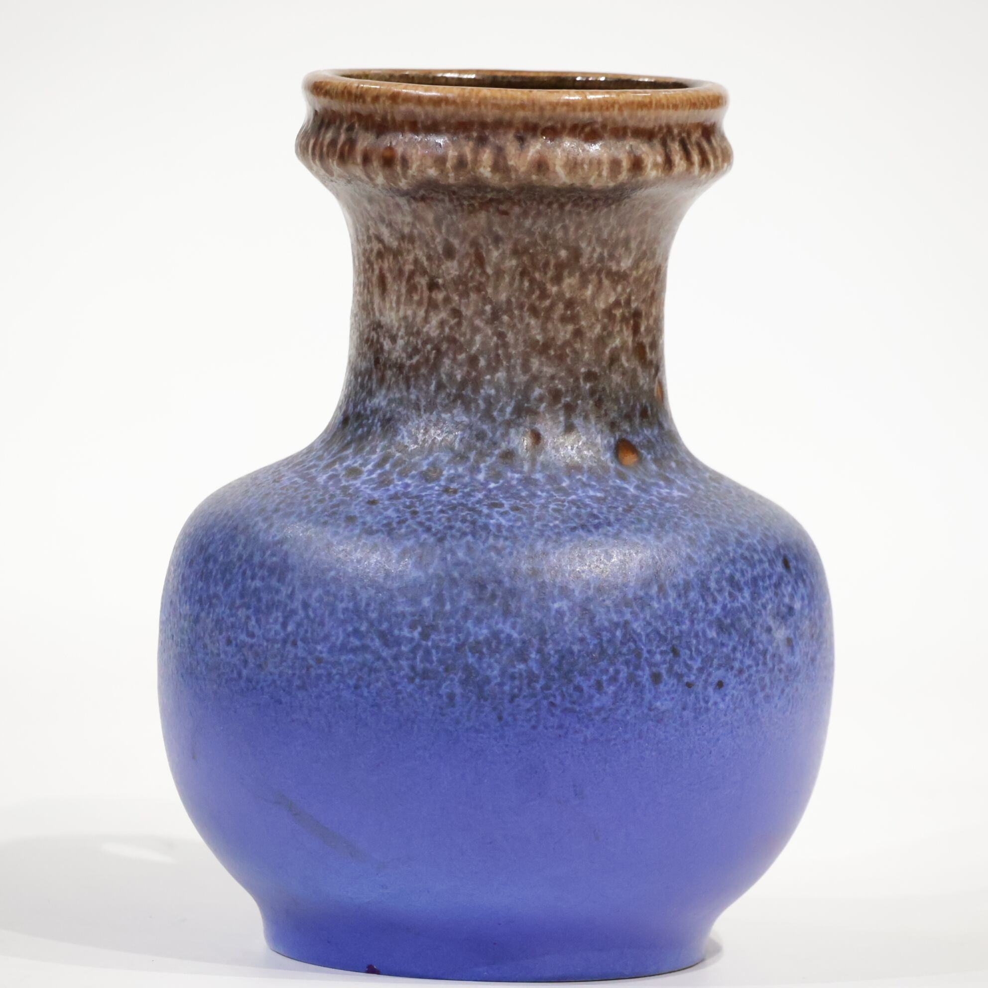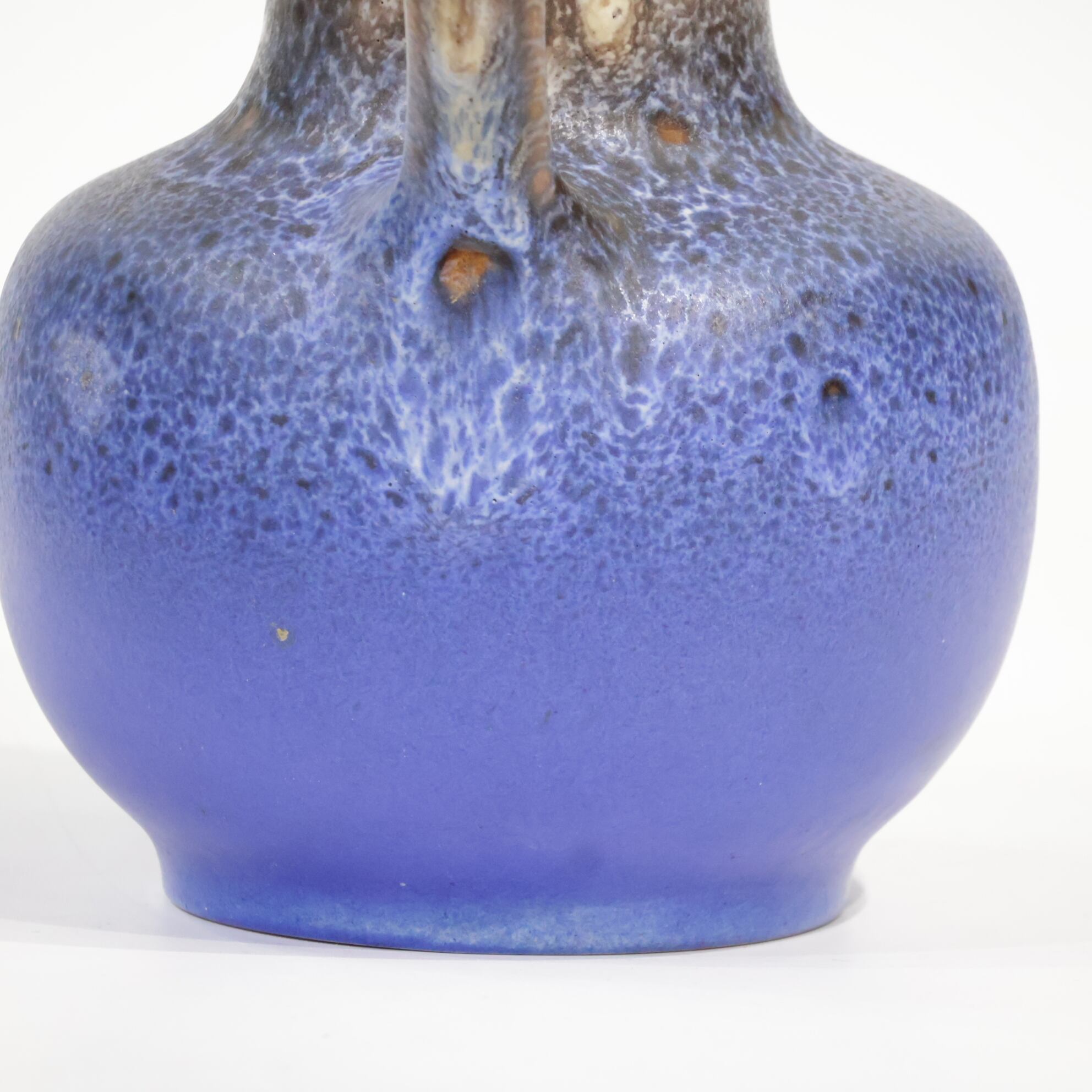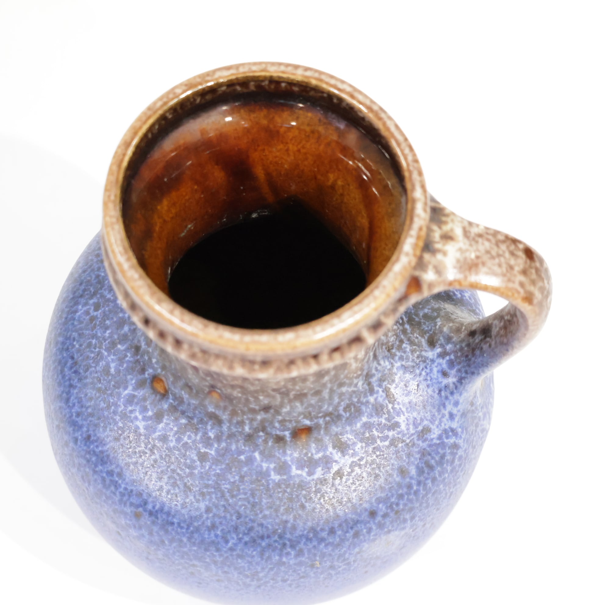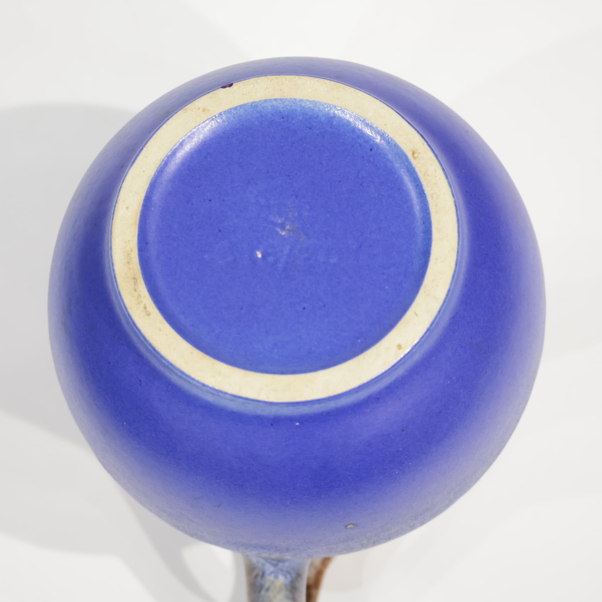 下部は均一に発色したブルーのマット寄り釉。上部に向かうにつれ、粒子状の白〜グレーが混ざり、さらに首元ではブラウンへ移行しています。境界は滲みながら連続し、焼成時の流動と分離がそのまま表面に現れています。