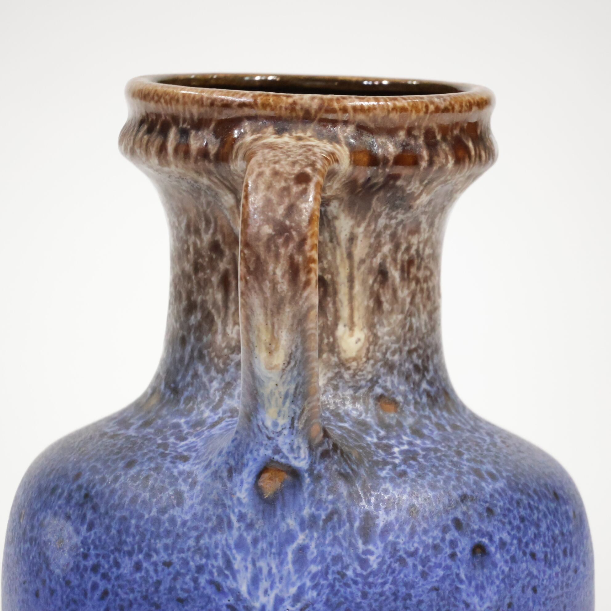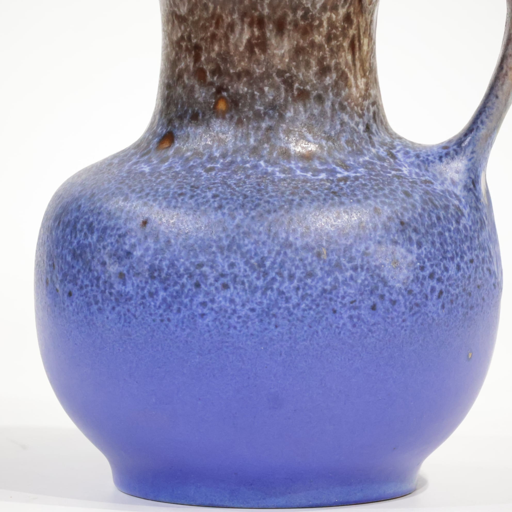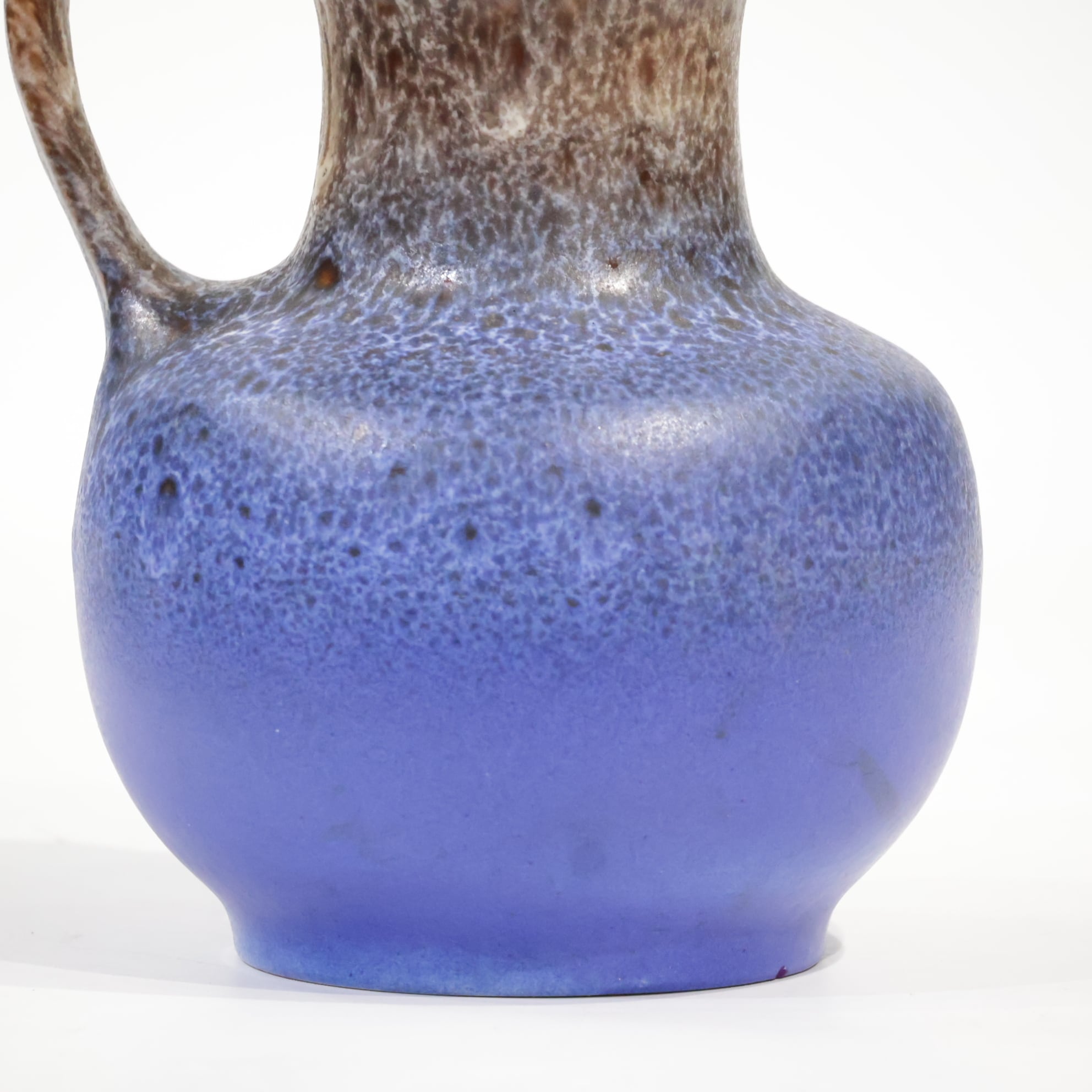 下部は均一に発色したブルーのマット寄り釉。上部に向かうにつれ、粒子状の白〜グレーが混ざり、さらに首元ではブラウンへ移行しています。境界は滲みながら連続し、焼成時の流動と分離がそのまま表面に現れています。