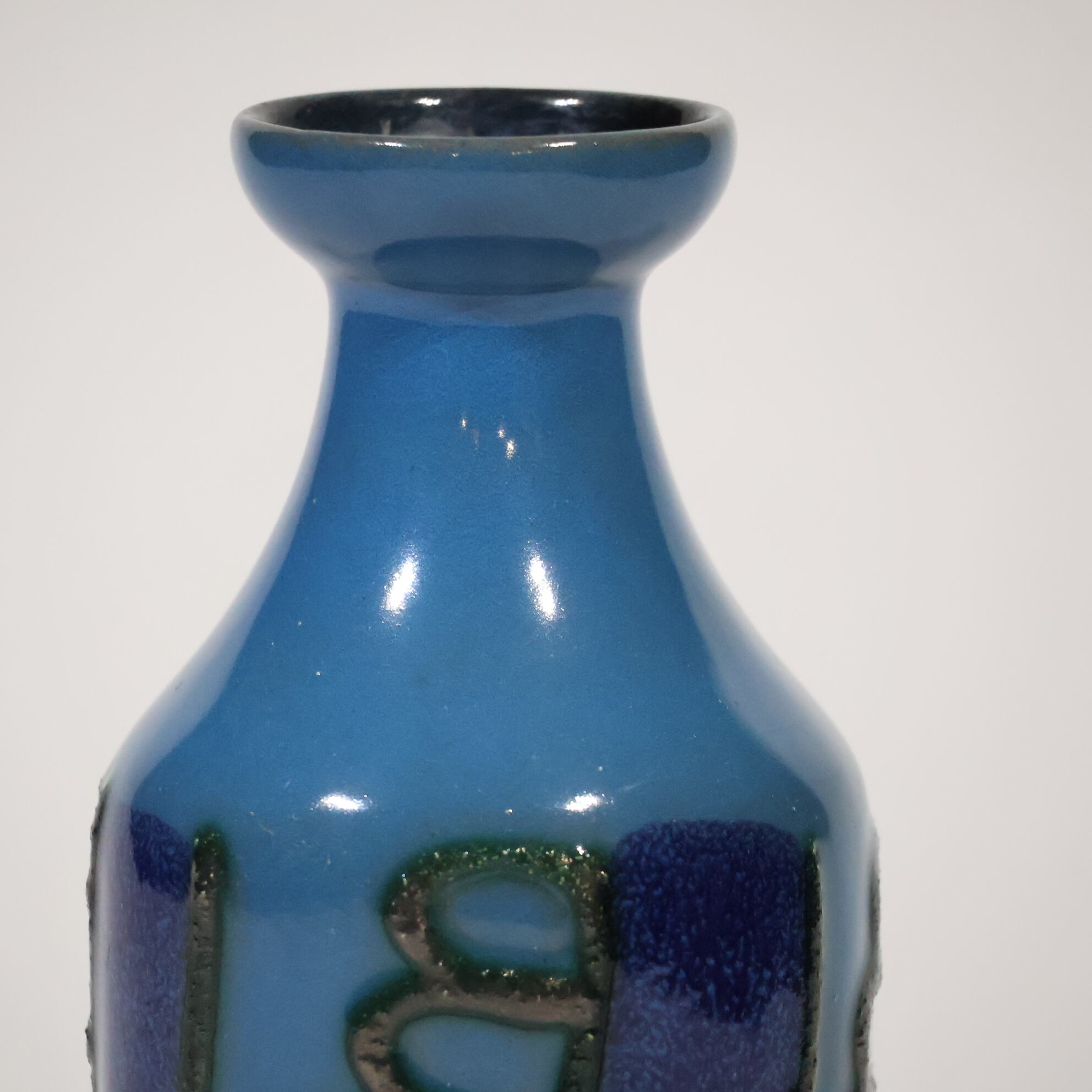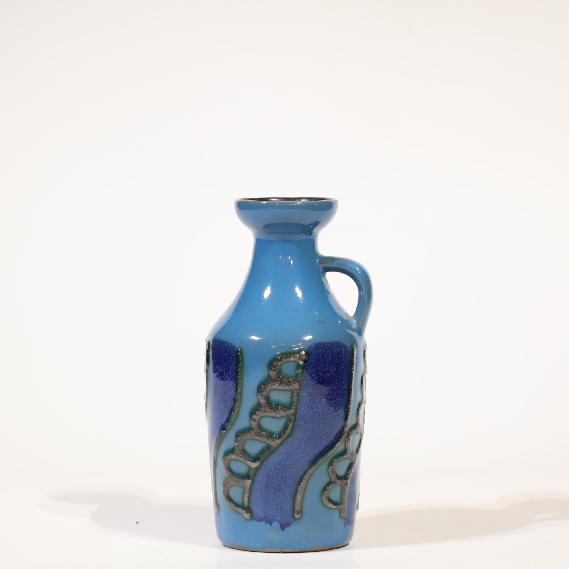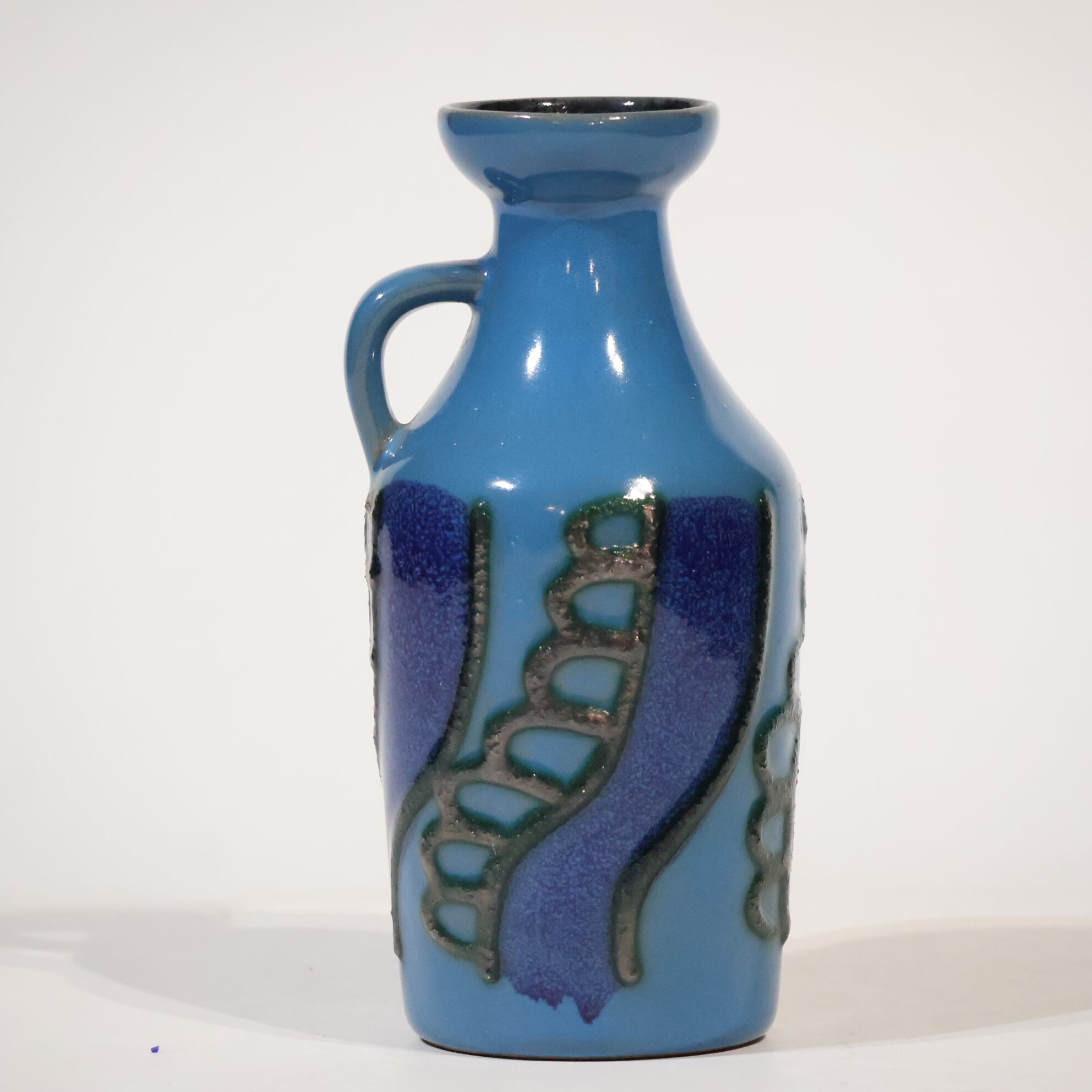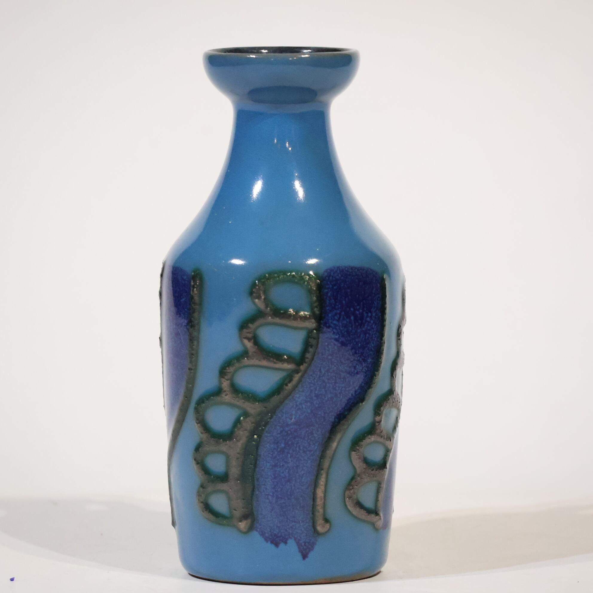 明るいブルーのベース釉に、胴部へ有機的な曲線装飾が配置された一点。