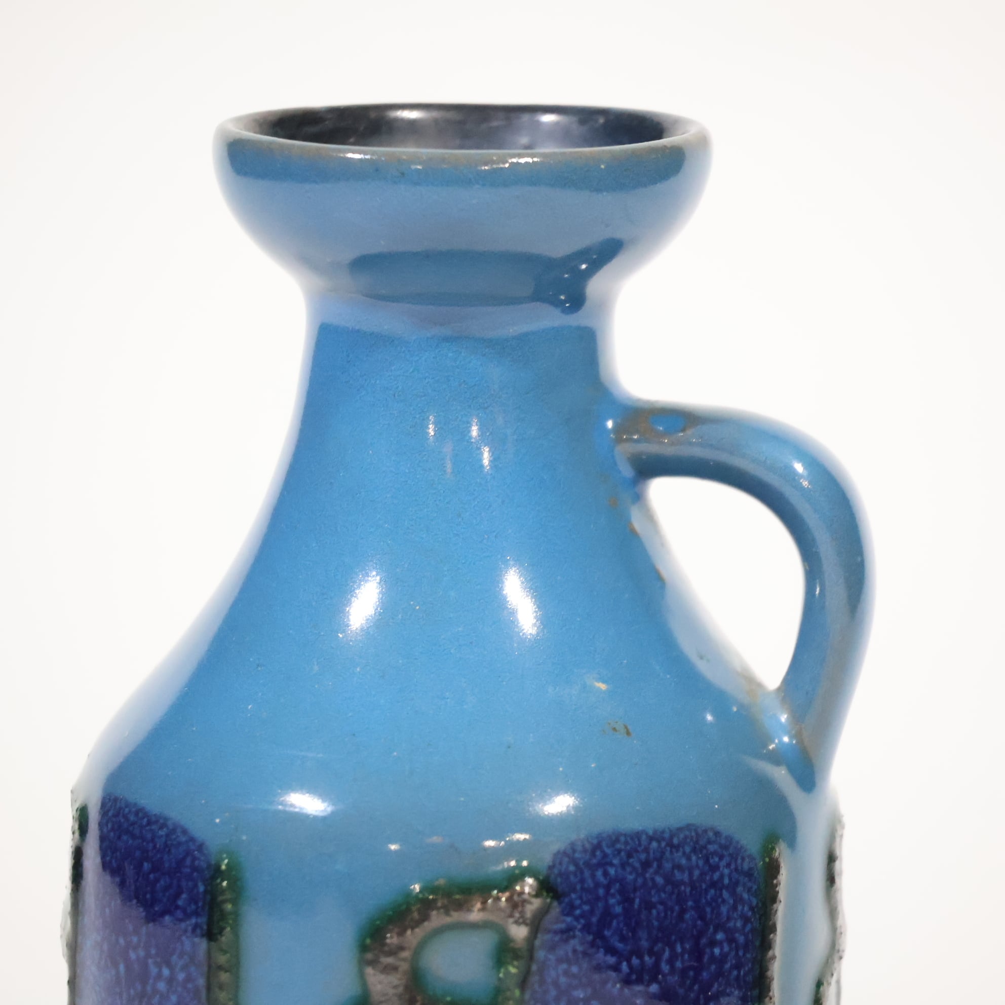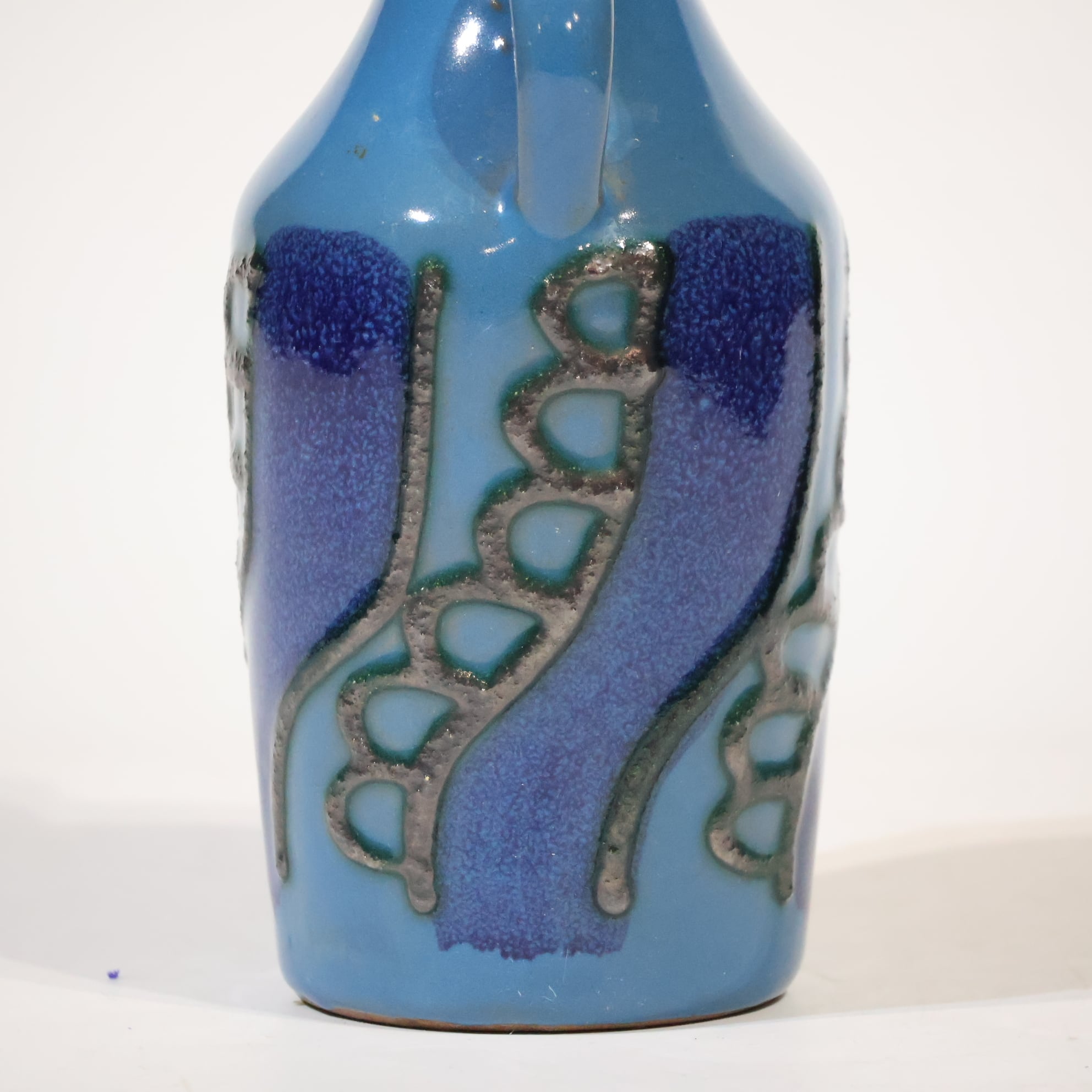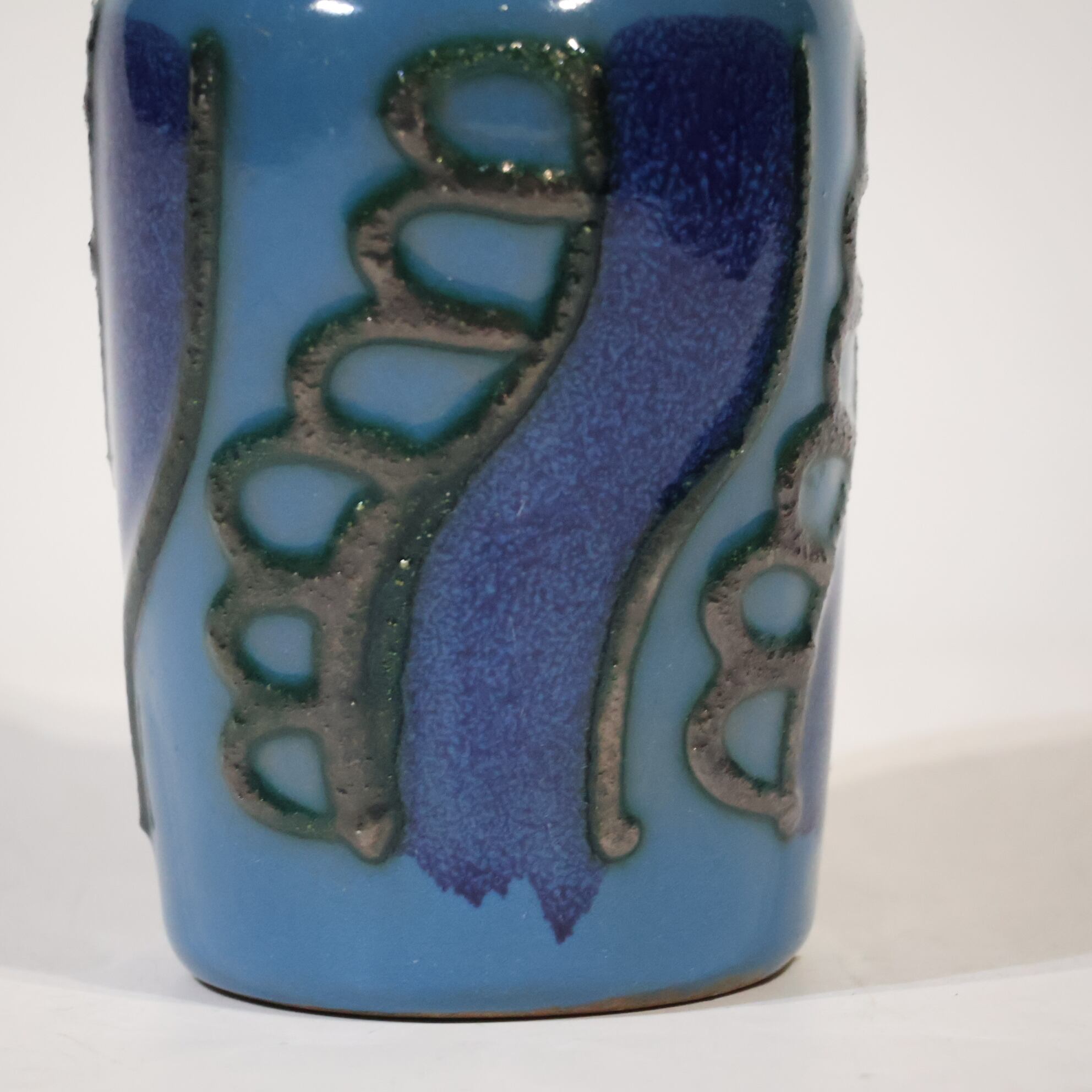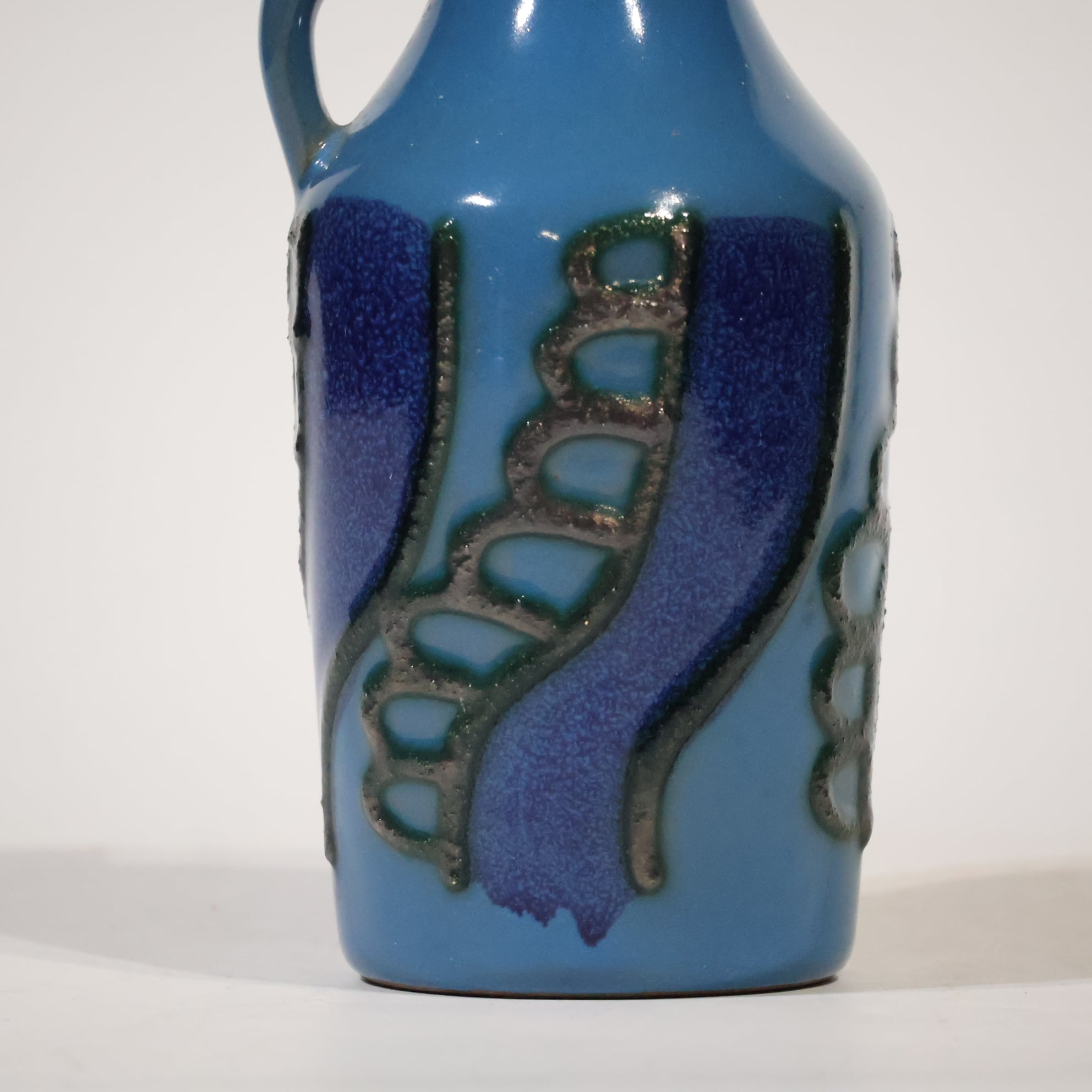 明るいブルーのベース釉に、胴部へ有機的な曲線装飾が配置された一点。