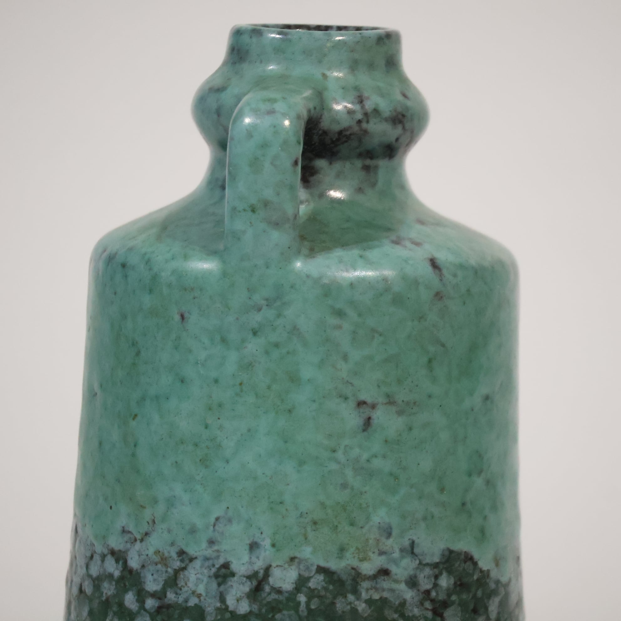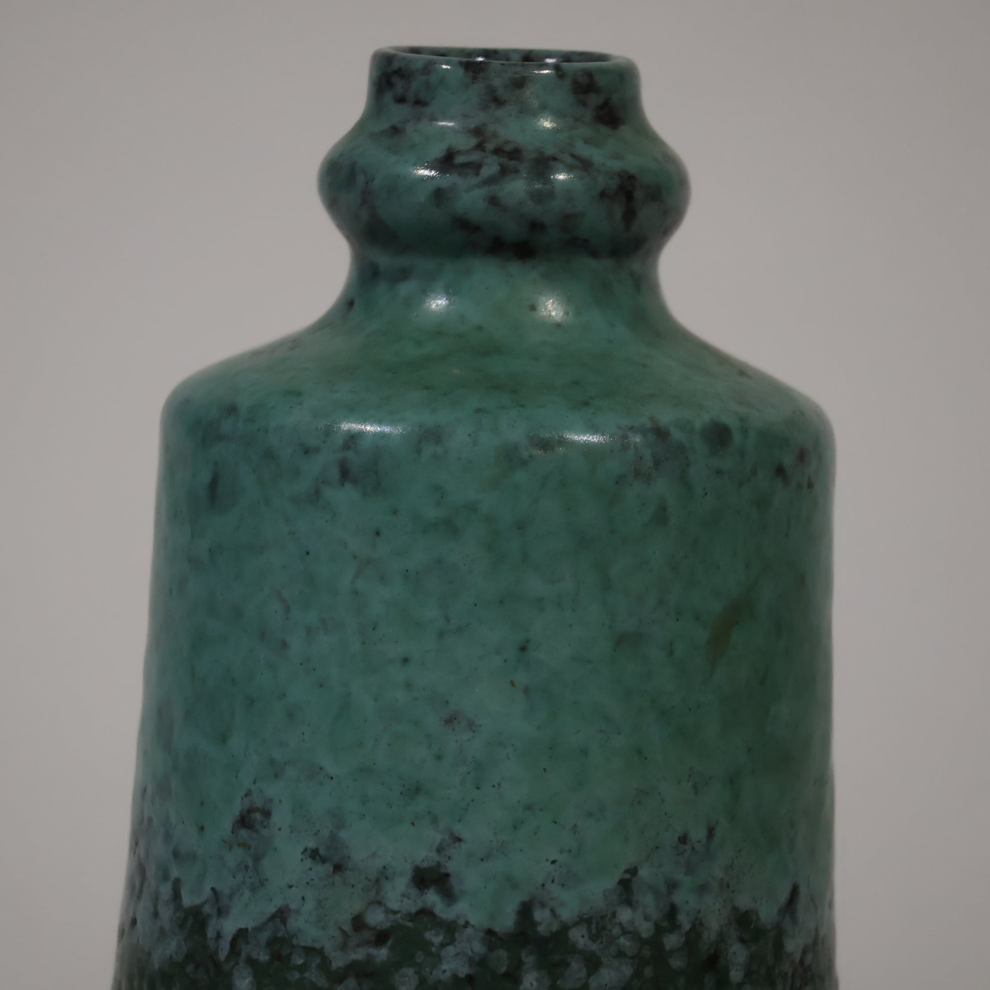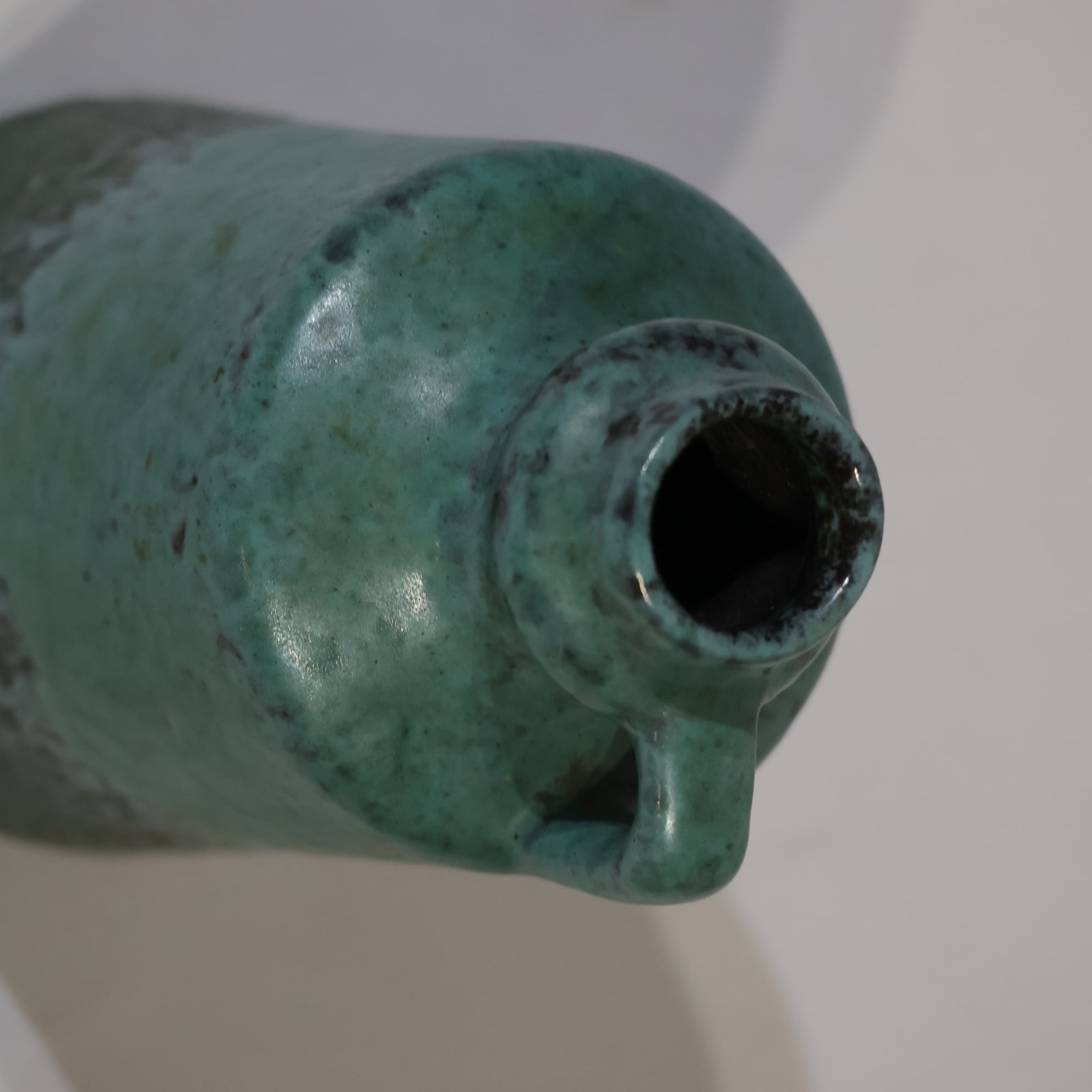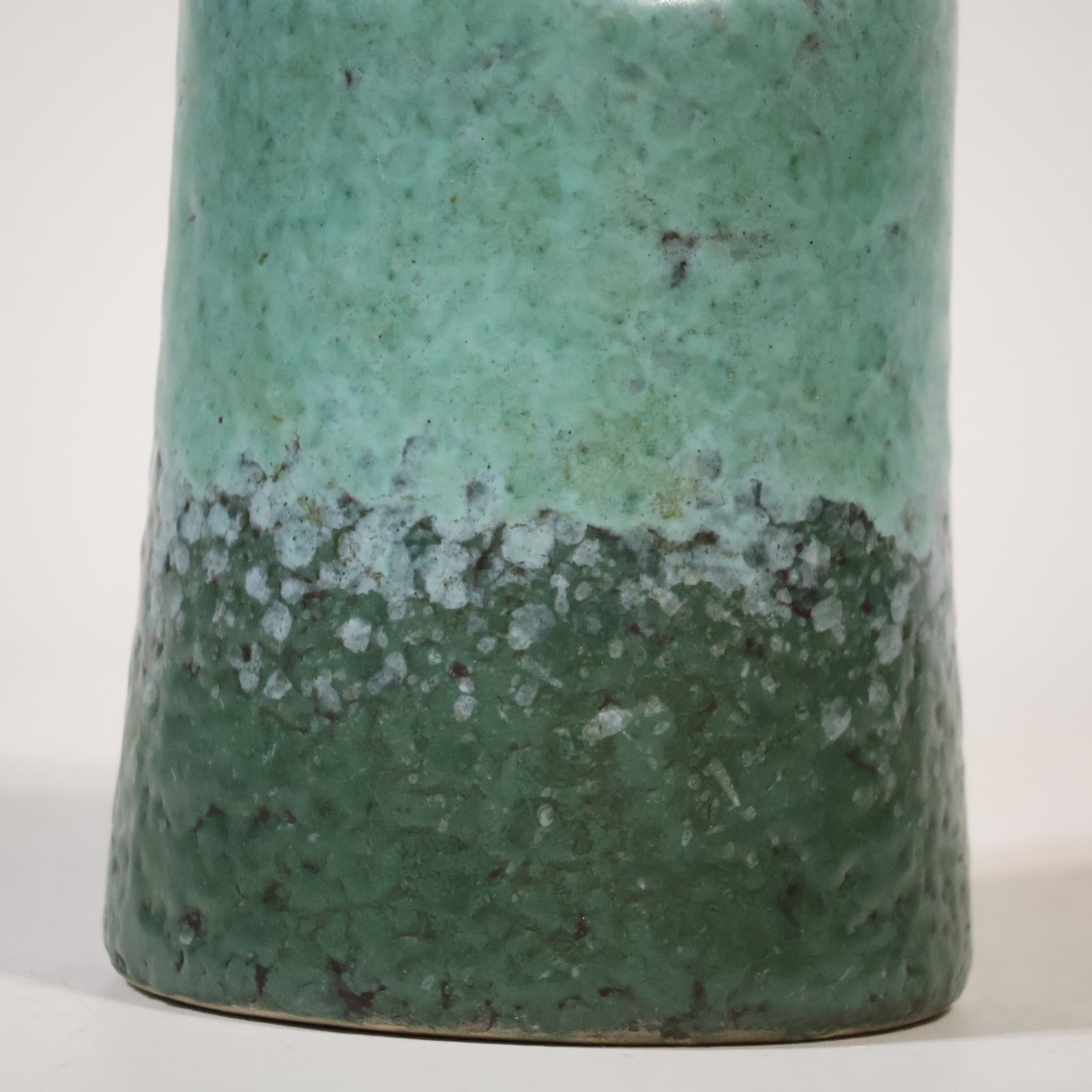 上部は均一に近い滑らかな光沢釉で覆われる一方、胴の下部にかけては白く結晶化したような粒状の層が現れ、その下に濃いグリーンが沈む構成です。