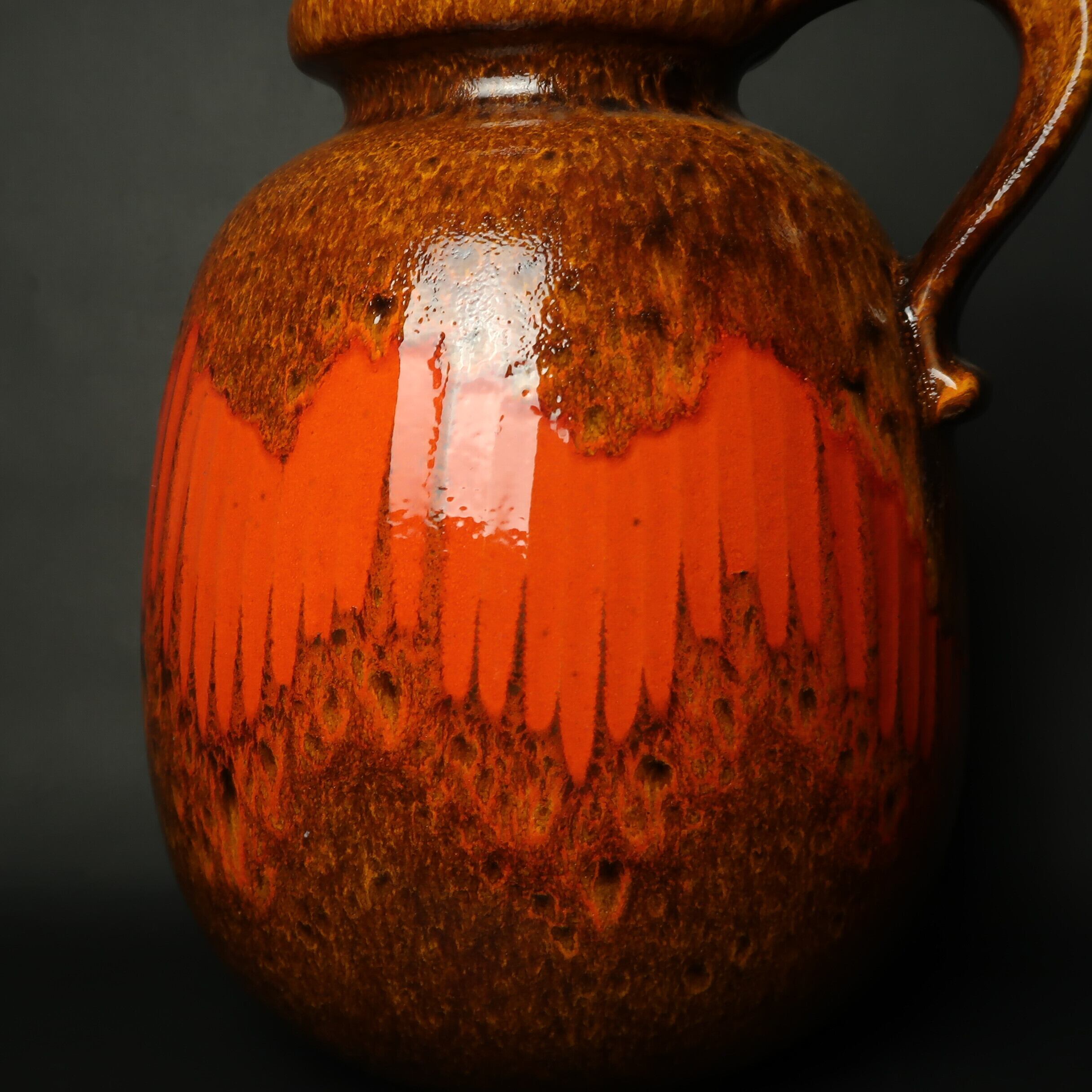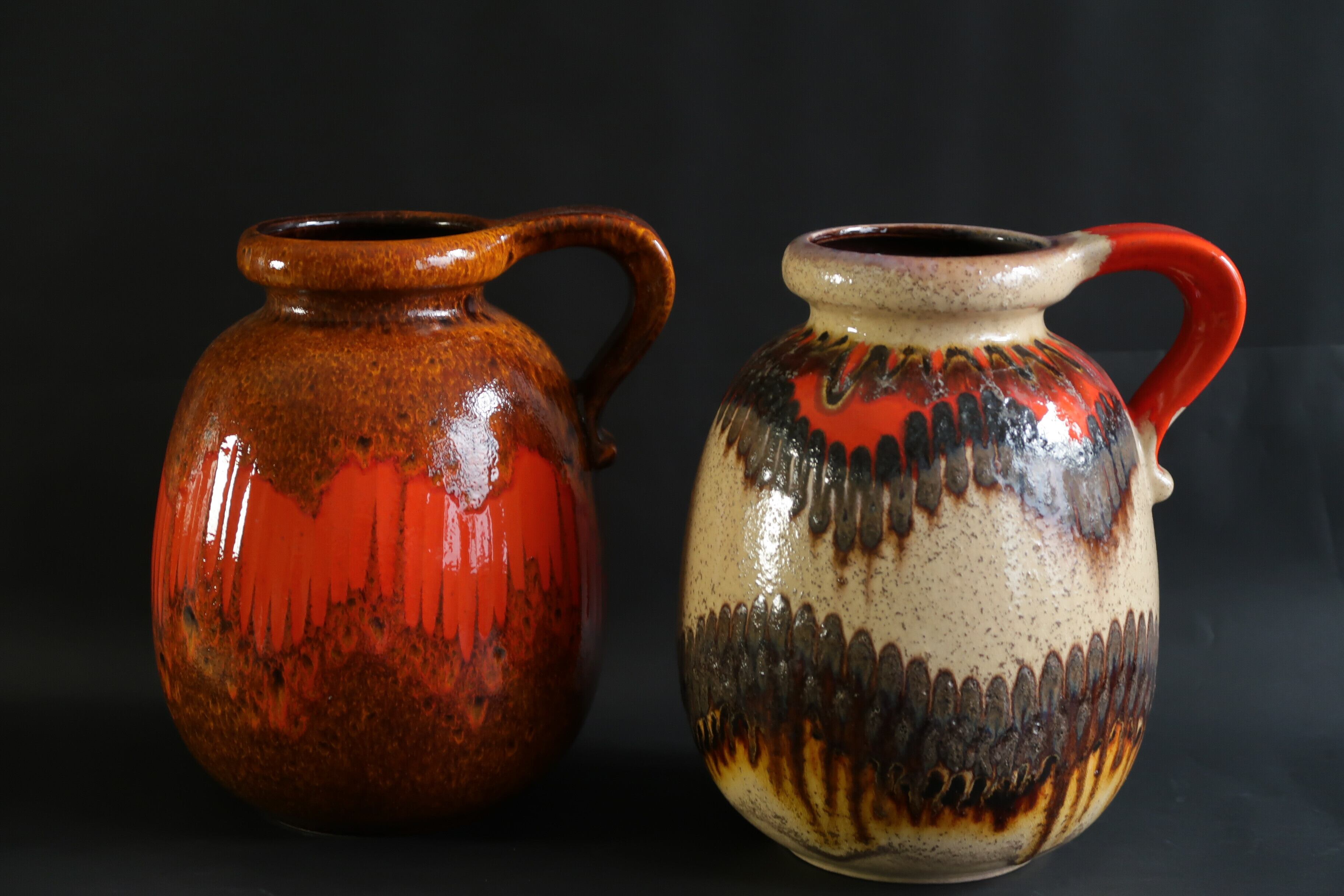 同社は急速に成長し、1950~80年代には陶 器製造の分野でドイツ最大のメーカーとなり、今日も確固たる地位を維持しています。形状に加えて釉薬でも、当時は最も幅広い品揃えを誇った他、輸出量も最大だったため、現在でも同社の製品はよく見られます。特に円筒形を基調にし たシンプルな形状で、型押し模様のある床置き 花瓶が代表的。色彩については当時主流だっ た赤やオレンジから、クリーム、ベージュ、茶色 などが多くを占めています。