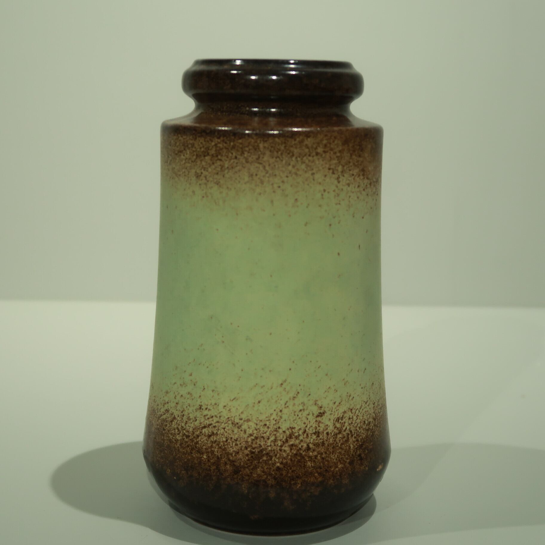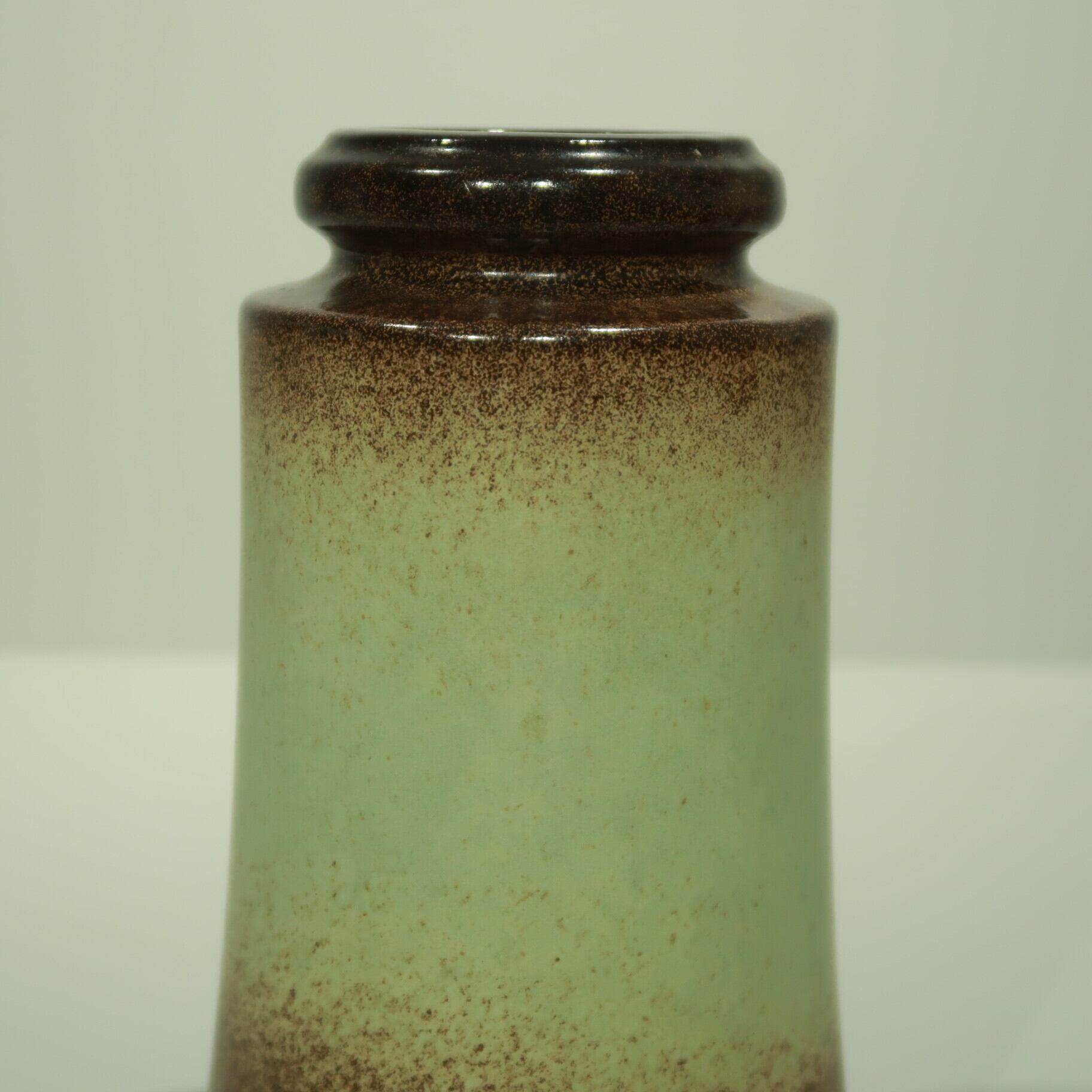 同社は急速に成長し、1950~80年代には陶 器製造の分野でドイツ最大のメーカーとなり、今日も確固たる地位を維持しています。形状に加えて釉薬でも、当時は最も幅広い品揃えを誇った他、輸出量も最大だったため、現在でも同社の製品はよく見られます。特に円筒形を基調にし たシンプルな形状で、型押し模様のある床置き 花瓶が代表的。色彩については当時主流だっ た赤やオレンジから、クリーム、ベージュ、茶色 などが多くを占めています。