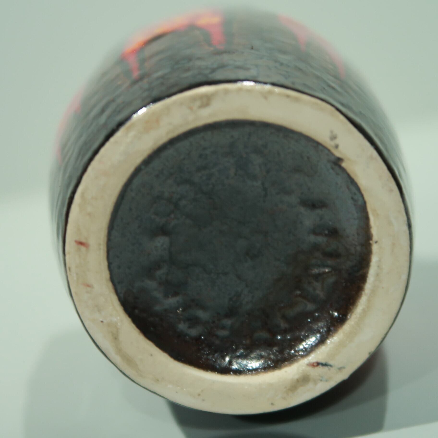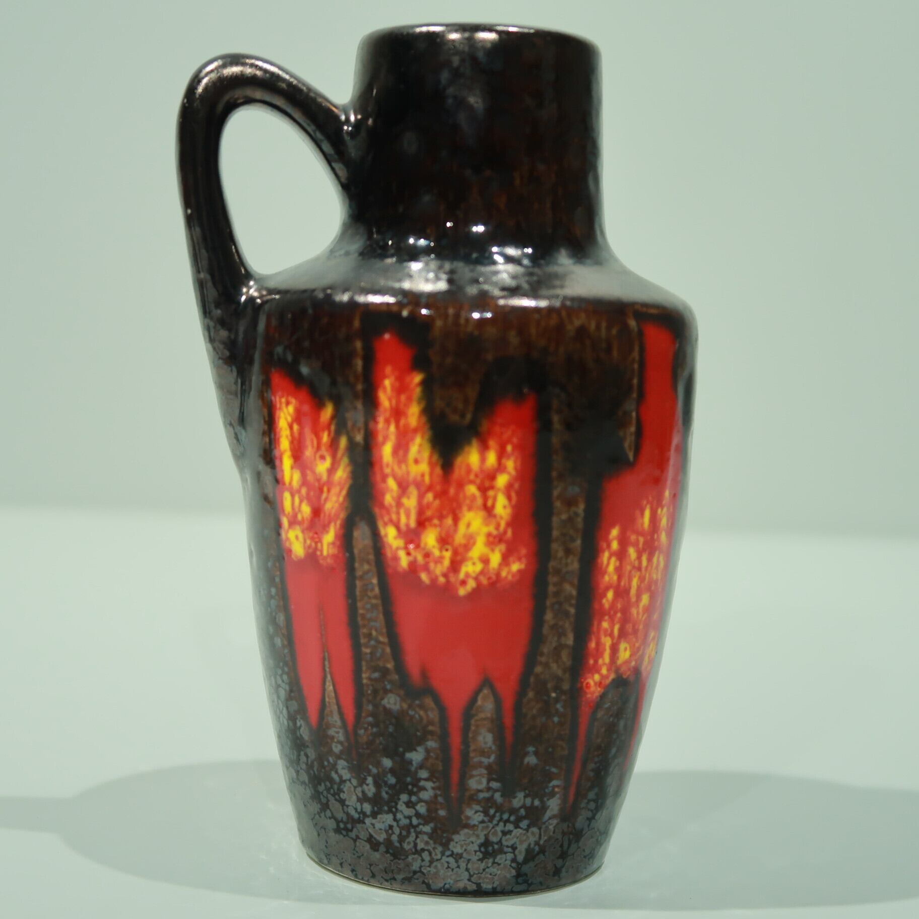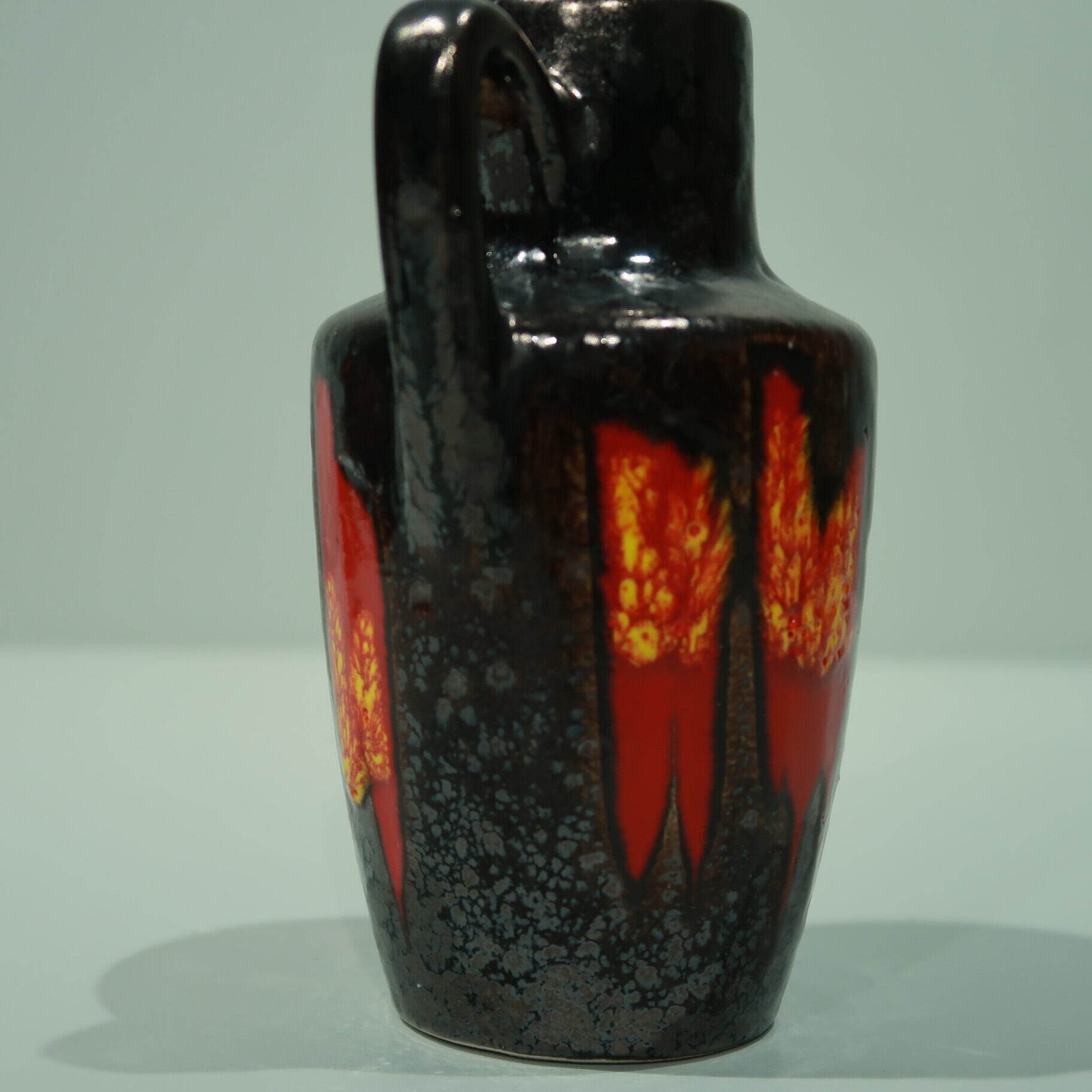 同社は急速に成長し、1950~80年代には陶 器製造の分野でドイツ最大のメーカーとなり、今日も確固たる地位を維持しています。形状に加えて釉薬でも、当時は最も幅広い品揃えを誇った他、輸出量も最大だったため、現在でも同社の製品はよく見られます。特に円筒形を基調にし たシンプルな形状で、型押し模様のある床置き 花瓶が代表的。色彩については当時主流だっ た赤やオレンジから、クリーム、ベージュ、茶色 などが多くを占めています。