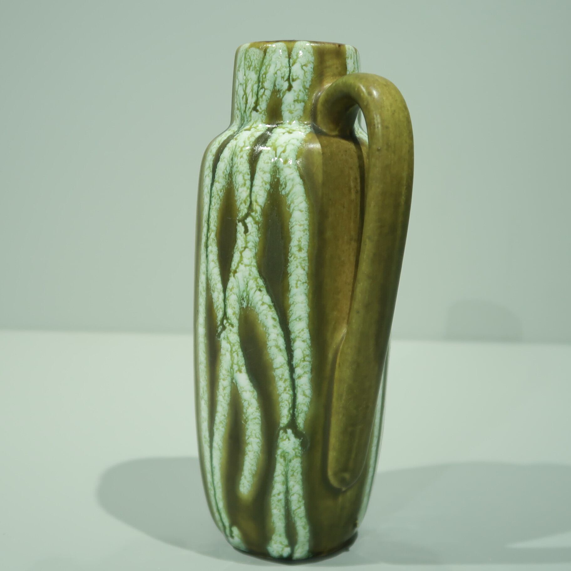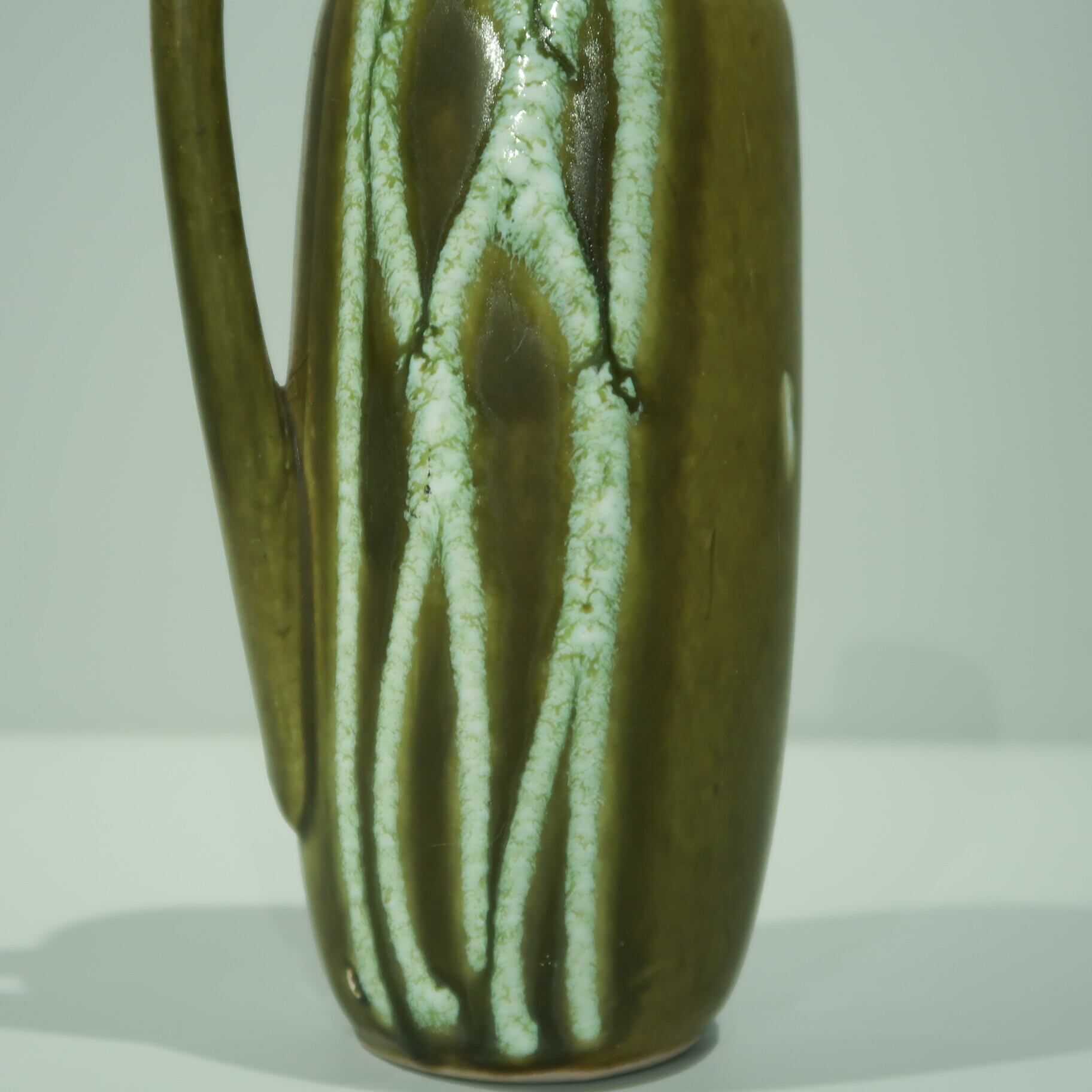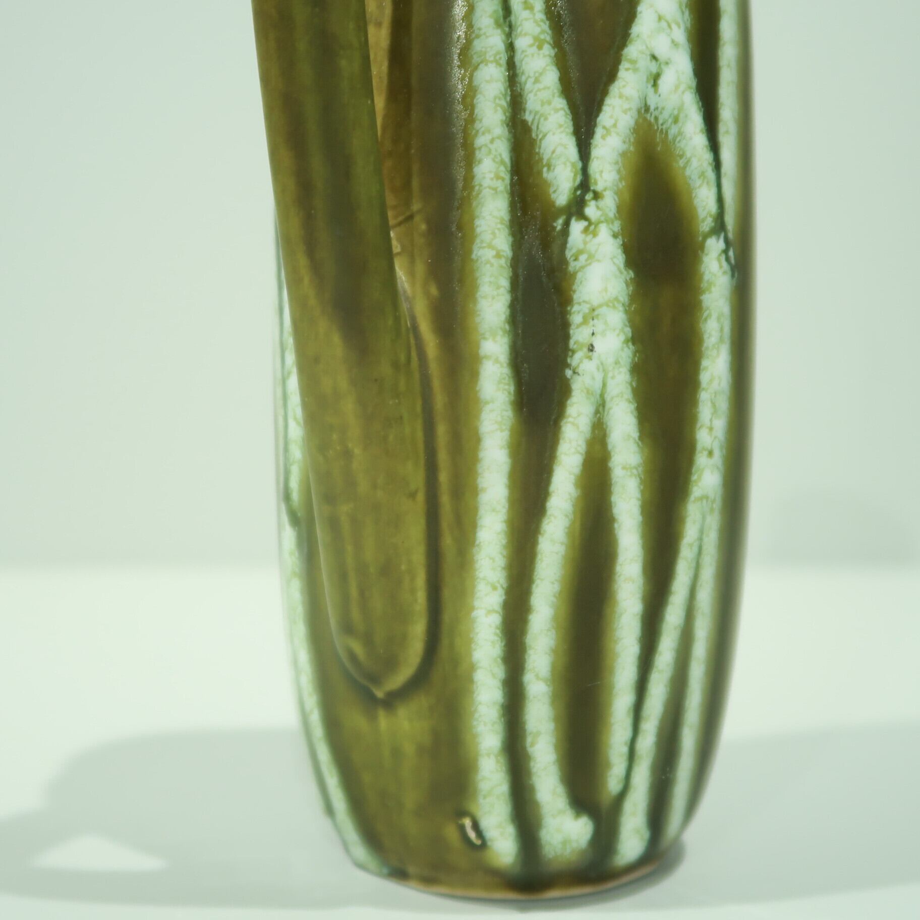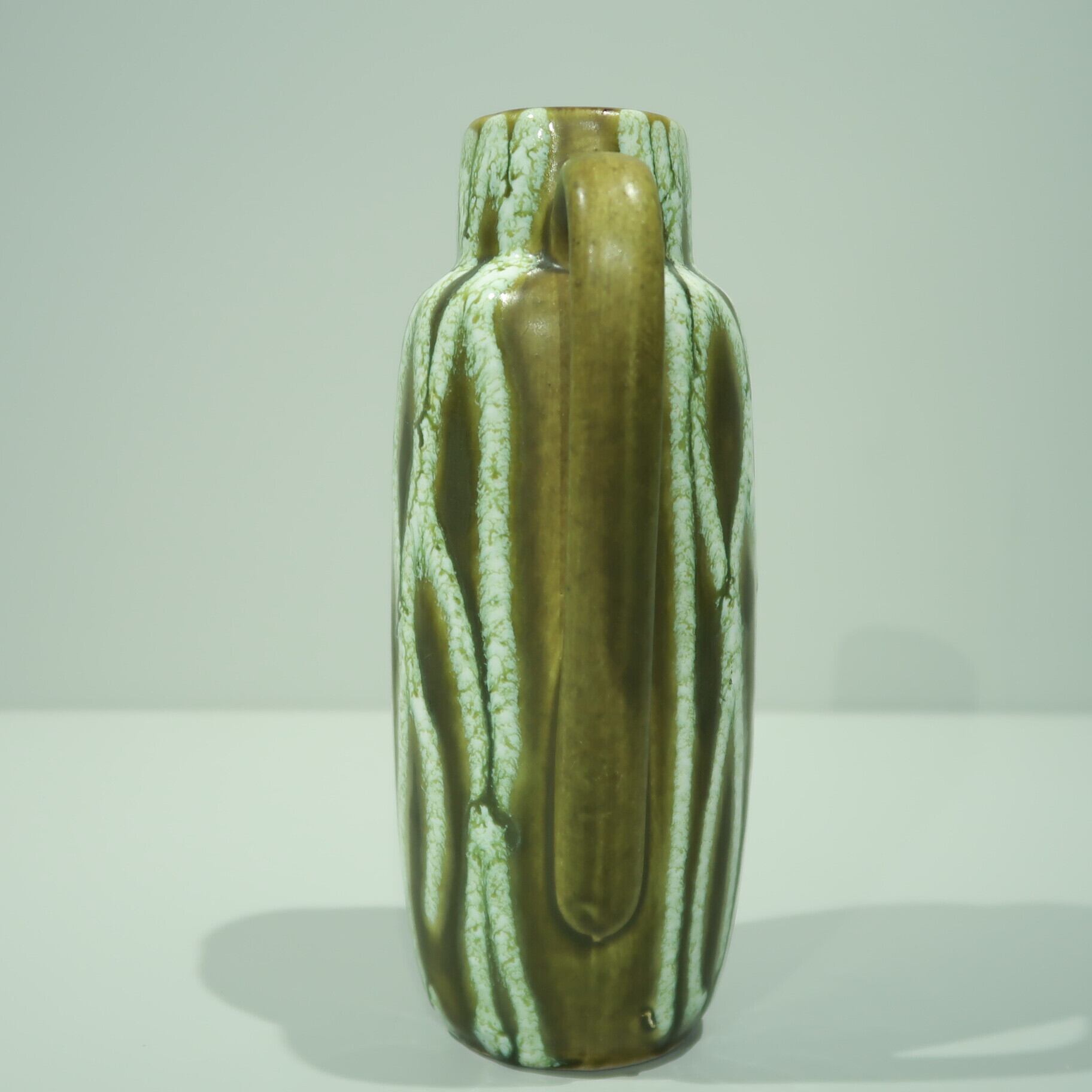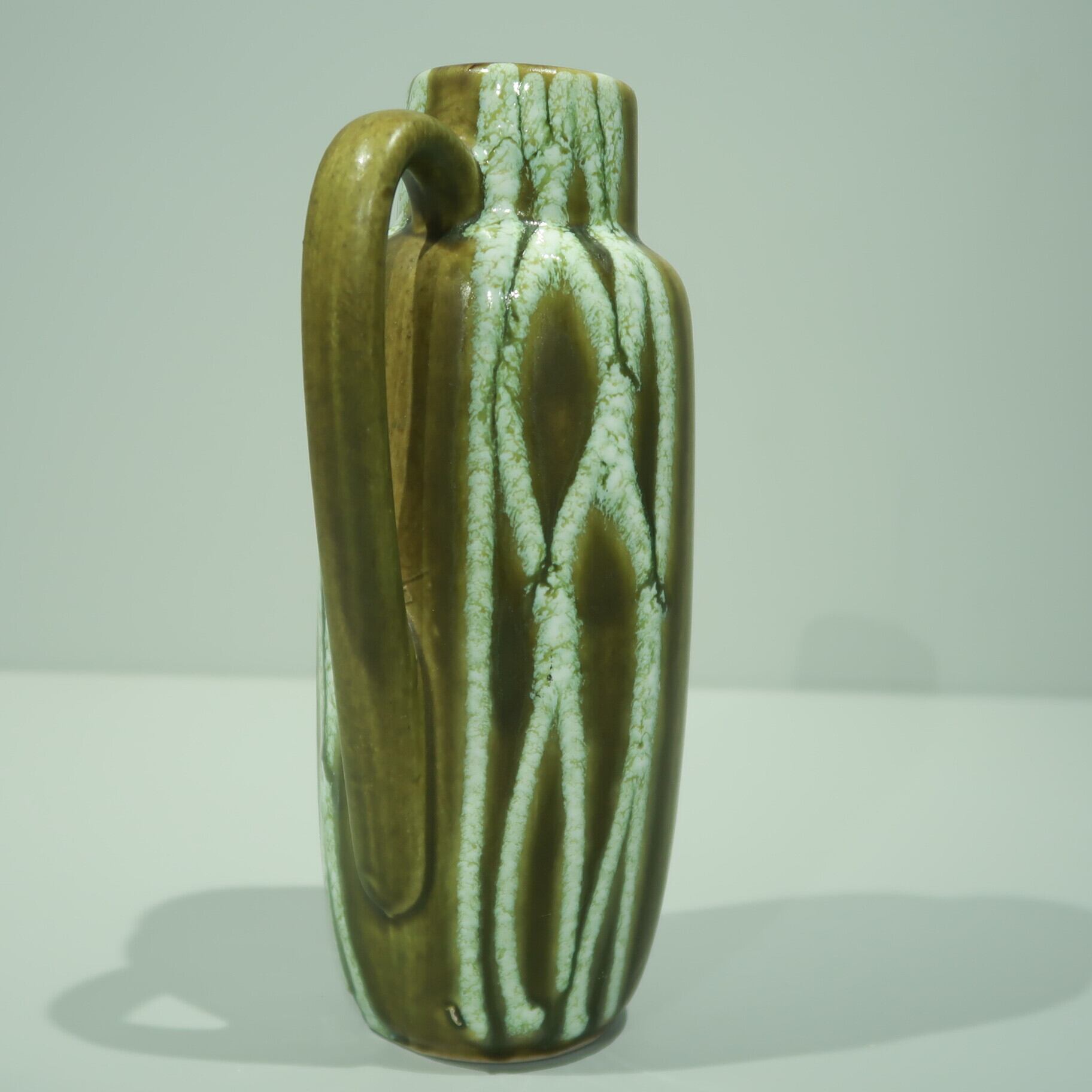 同社は急速に成長し、1950~80年代には陶 器製造の分野でドイツ最大のメーカーとなり、今日も確固たる地位を維持しています。形状に加えて釉薬でも、当時は最も幅広い品揃えを誇った他、輸出量も最大だったため、現在でも同社の製品はよく見られます。特に円筒形を基調にし たシンプルな形状で、型押し模様のある床置き 花瓶が代表的。色彩については当時主流だっ た赤やオレンジから、クリーム、ベージュ、茶色 などが多くを占めています。