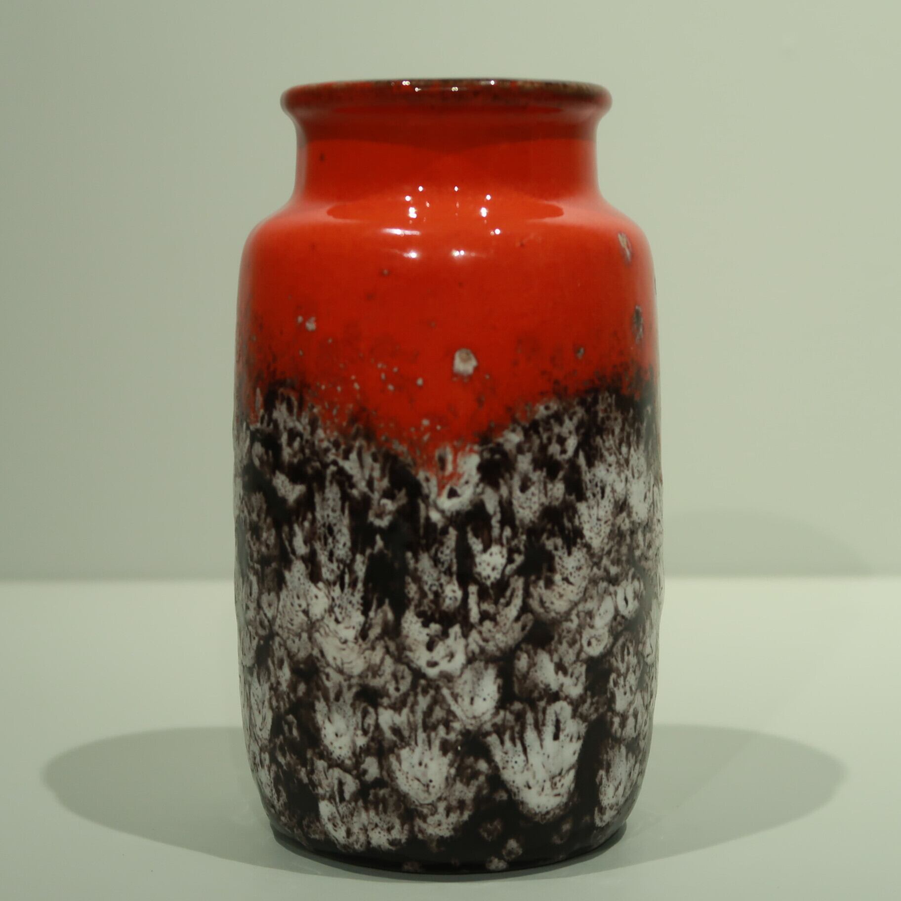 同社は急速に成長し、1950~80年代には陶 器製造の分野でドイツ最大のメーカーとなり、今日も確固たる地位を維持しています。形状に加えて釉薬でも、当時は最も幅広い品揃えを誇った他、輸出量も最大だったため、現在でも同社の製品はよく見られます。特に円筒形を基調にし たシンプルな形状で、型押し模様のある床置き 花瓶が代表的。色彩については当時主流だっ た赤やオレンジから、クリーム、ベージュ、茶色 などが多くを占めています。