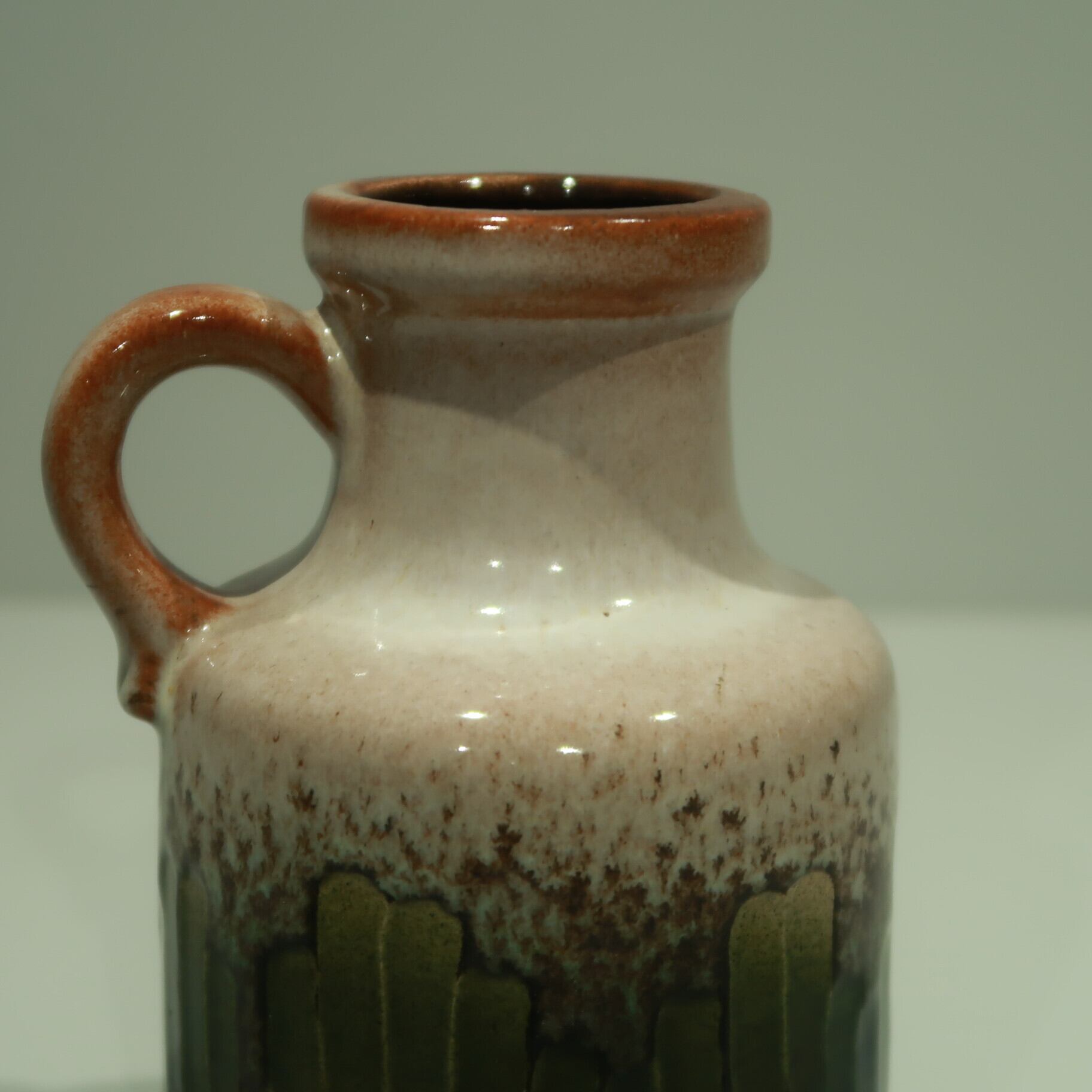 同社は急速に成長し、1950~80年代には陶 器製造の分野でドイツ最大のメーカーとなり、今日も確固たる地位を維持しています。形状に加えて釉薬でも、当時は最も幅広い品揃えを誇った他、輸出量も最大だったため、現在でも同社の製品はよく見られます。特に円筒形を基調にし たシンプルな形状で、型押し模様のある床置き 花瓶が代表的。色彩については当時主流だっ た赤やオレンジから、クリーム、ベージュ、茶色 などが多くを占めています。