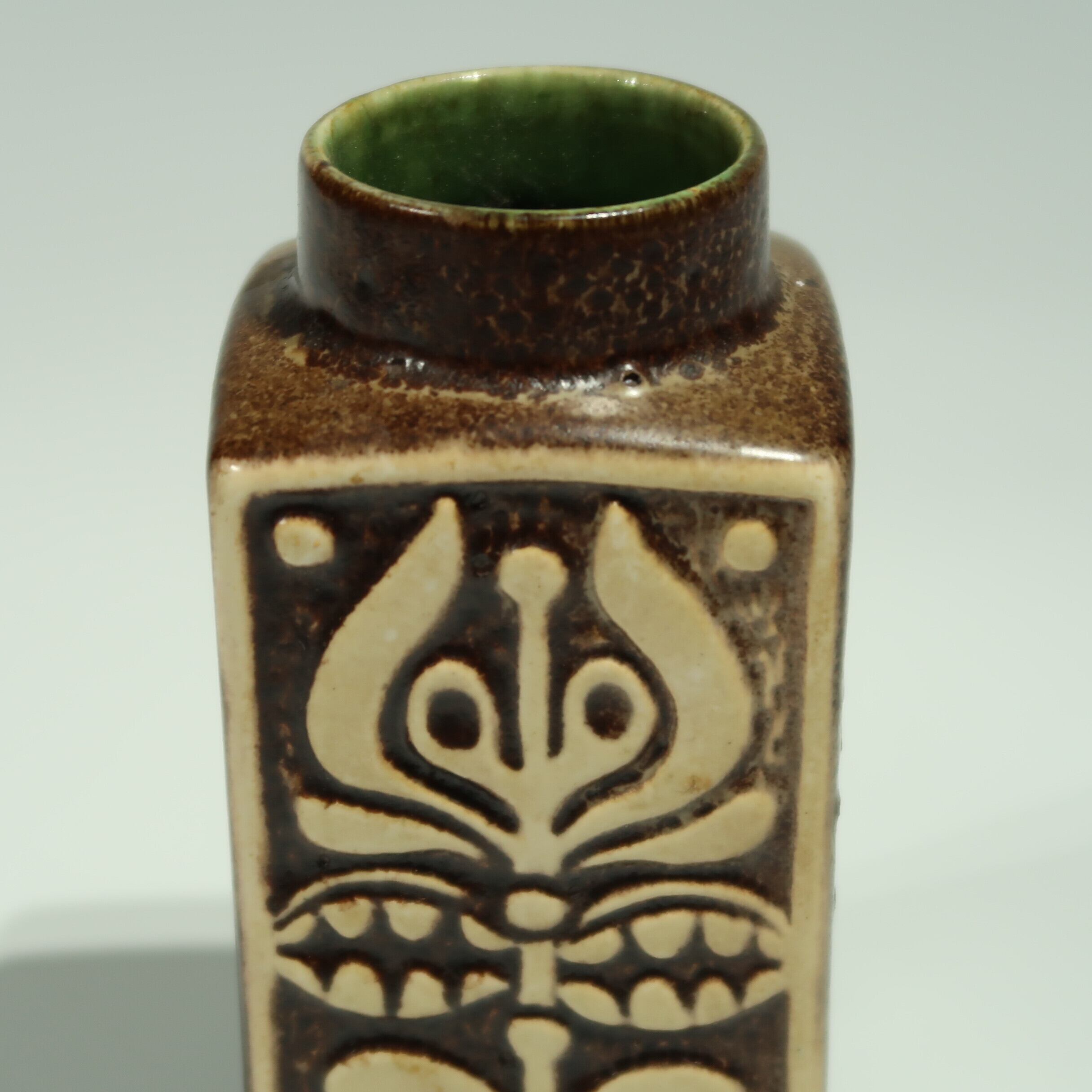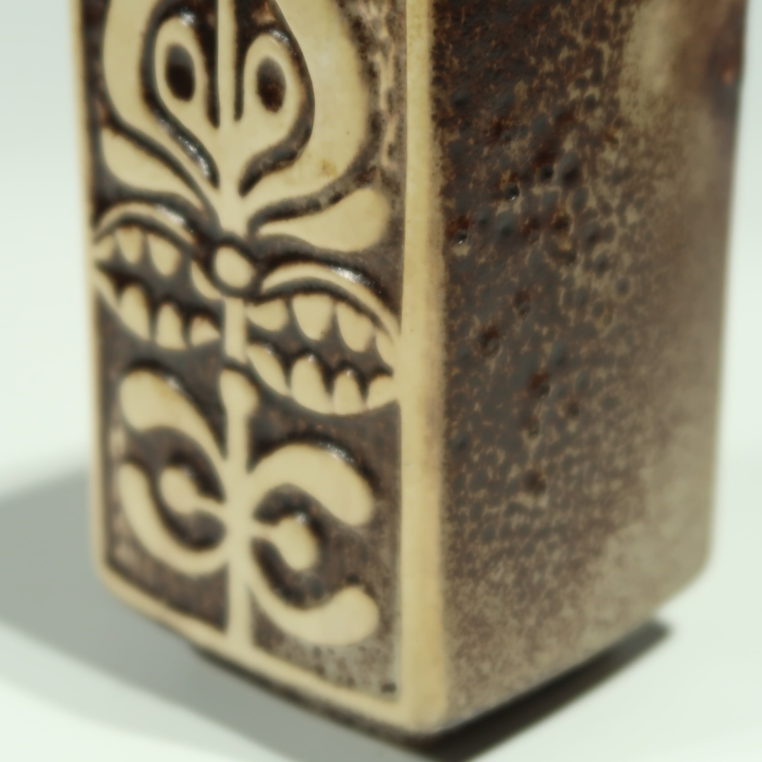 1960年代からのスタイルとしては、 当時広く流行していた色彩の釉薬(マットまたは 光沢あり)を使用し、シンプルなフォルムの上に様 式化した花の図柄の型押しや幾何学模様をあし らったものが多く、Scheurichのも のと混同されがちです。