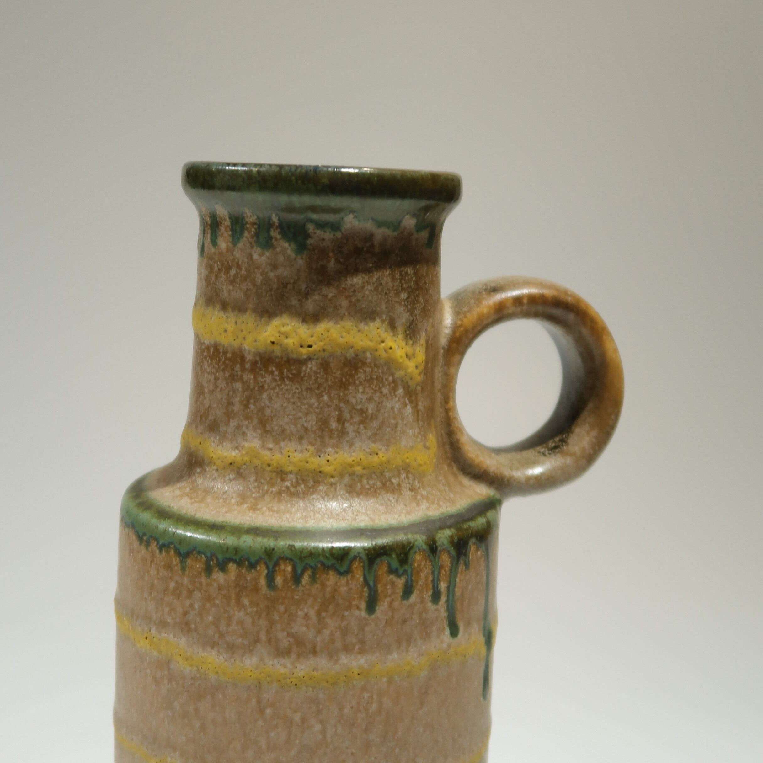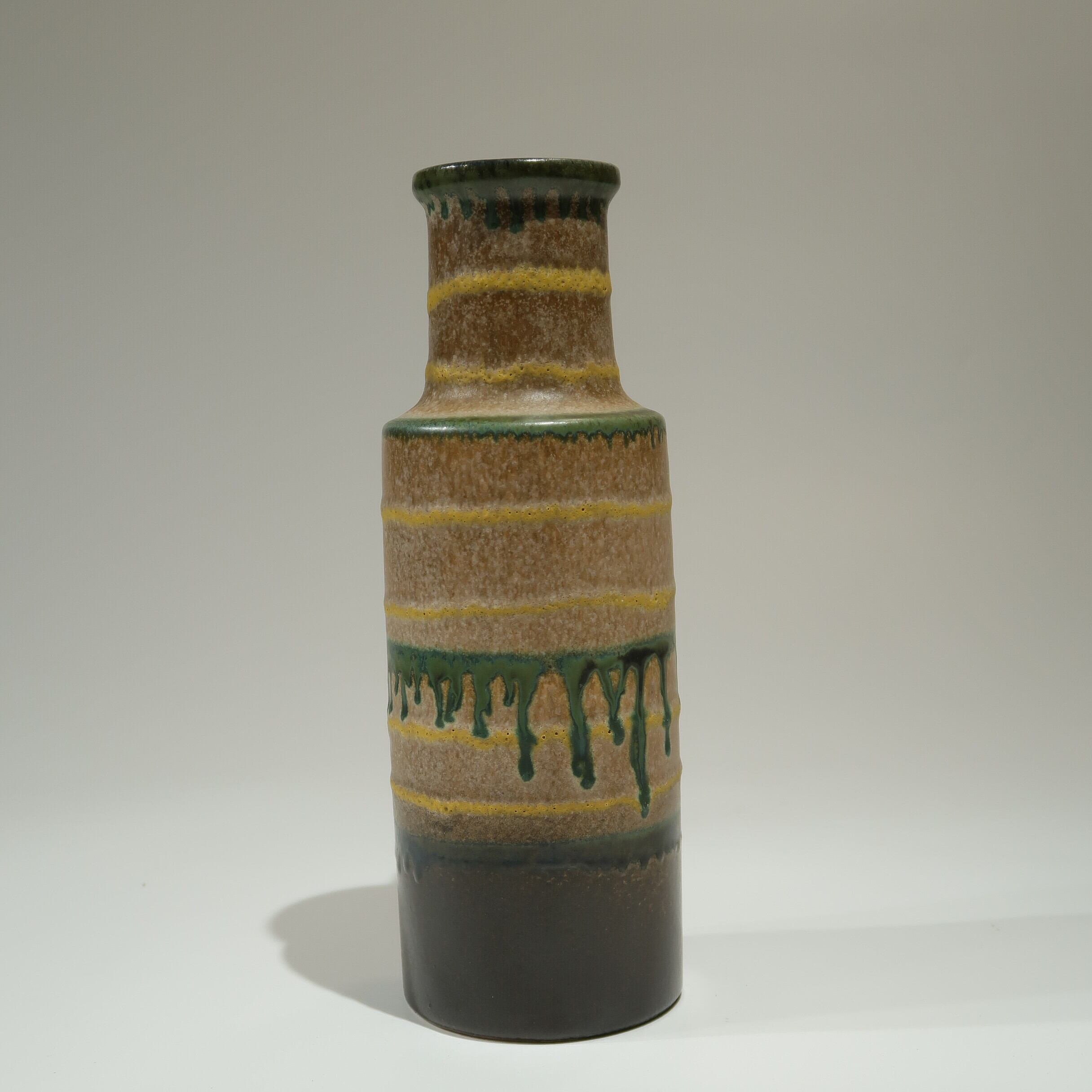 同社は急速に成長し、1950~80年代には陶 器製造の分野でドイツ最大のメーカーとなり、今日も確固たる地位を維持しています。形状に加えて釉薬でも、当時は最も幅広い品揃えを誇った他、輸出量も最大だったため、現在でも同社の製品はよく見られます。特に円筒形を基調にし たシンプルな形状で、型押し模様のある床置き 花瓶が代表的。色彩については当時主流だっ た赤やオレンジから、クリーム、ベージュ、茶色 などが多くを占めています。
