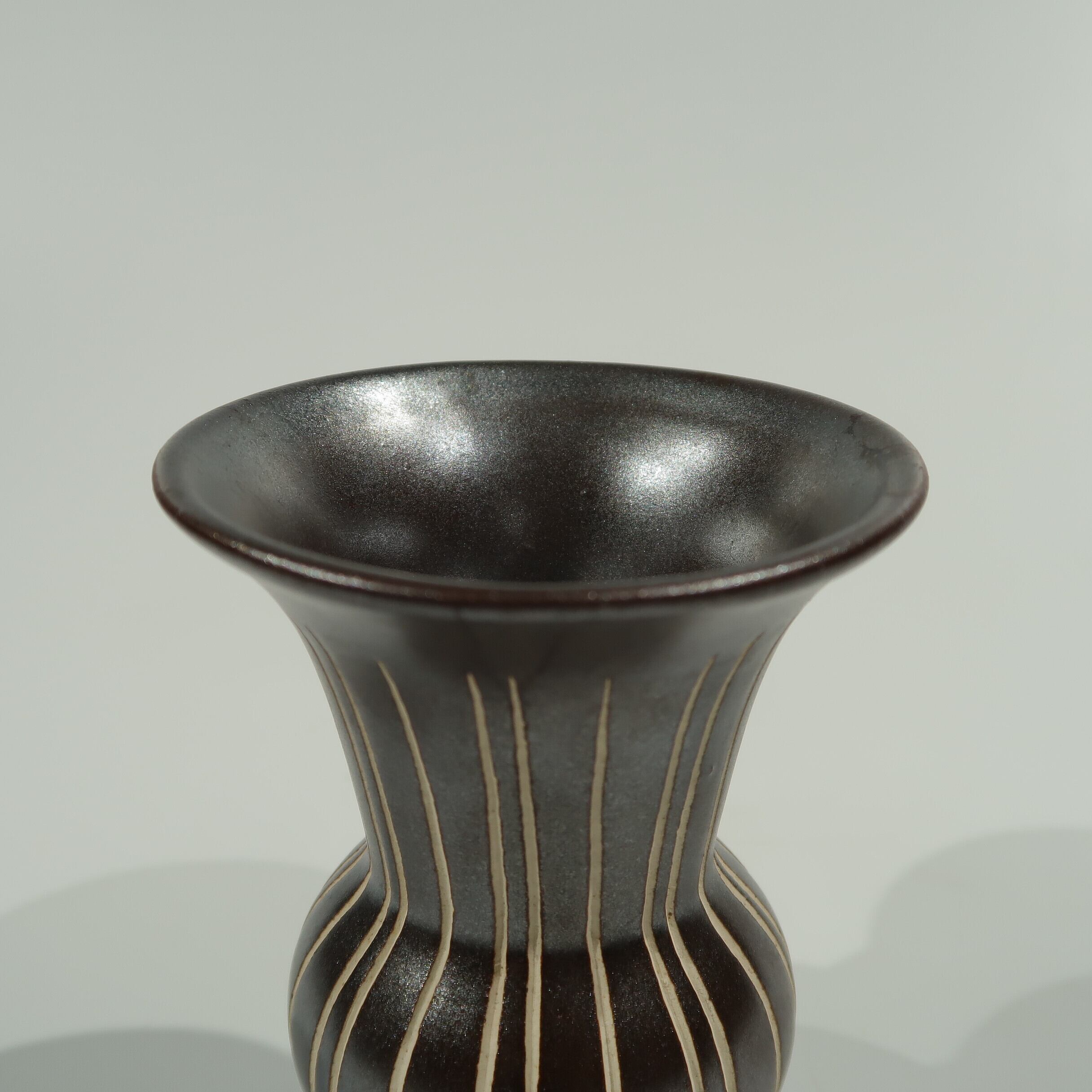 ブラックに近い深いダークブラウン釉薬をかけた陶器にストライプのようなパターンを刻んでいます。