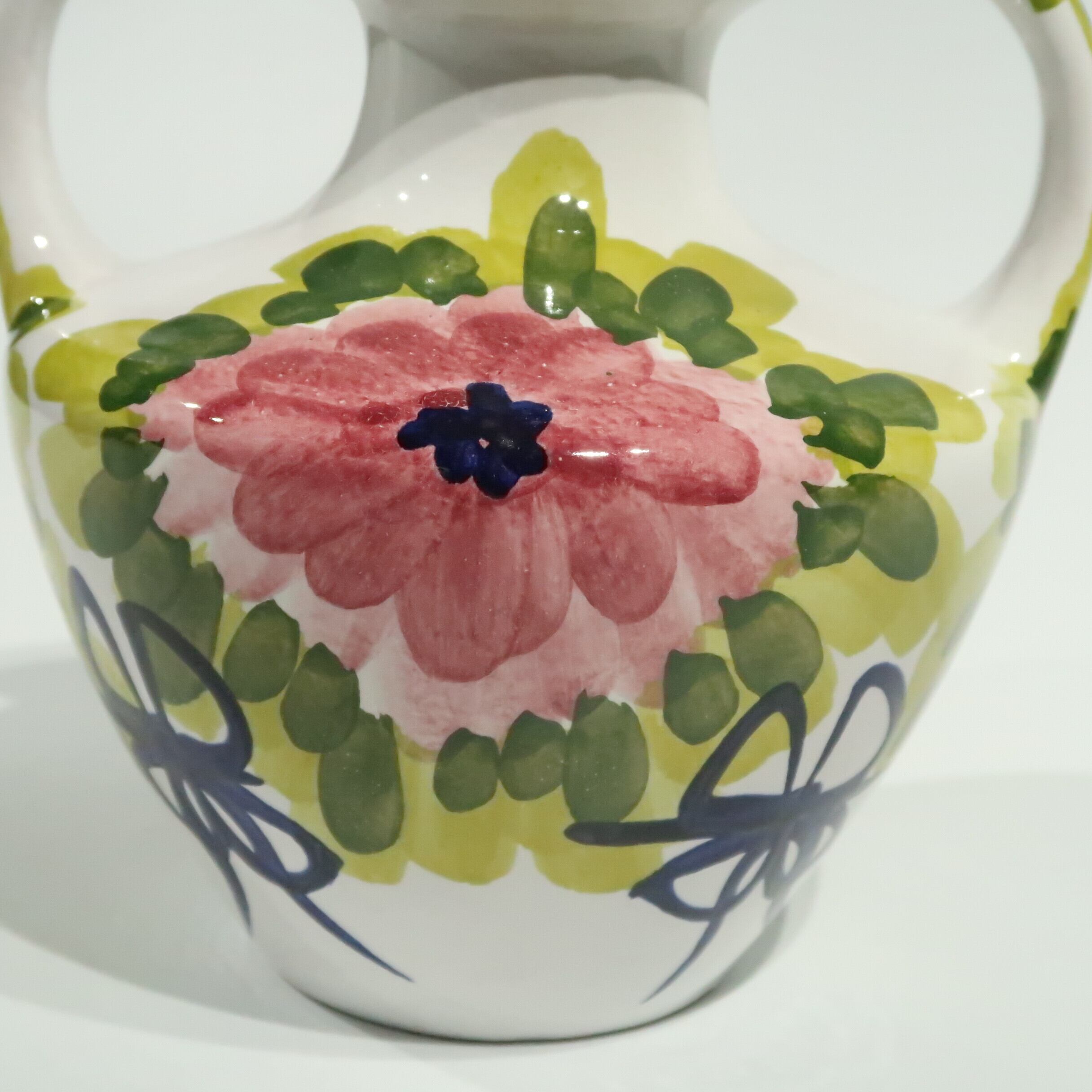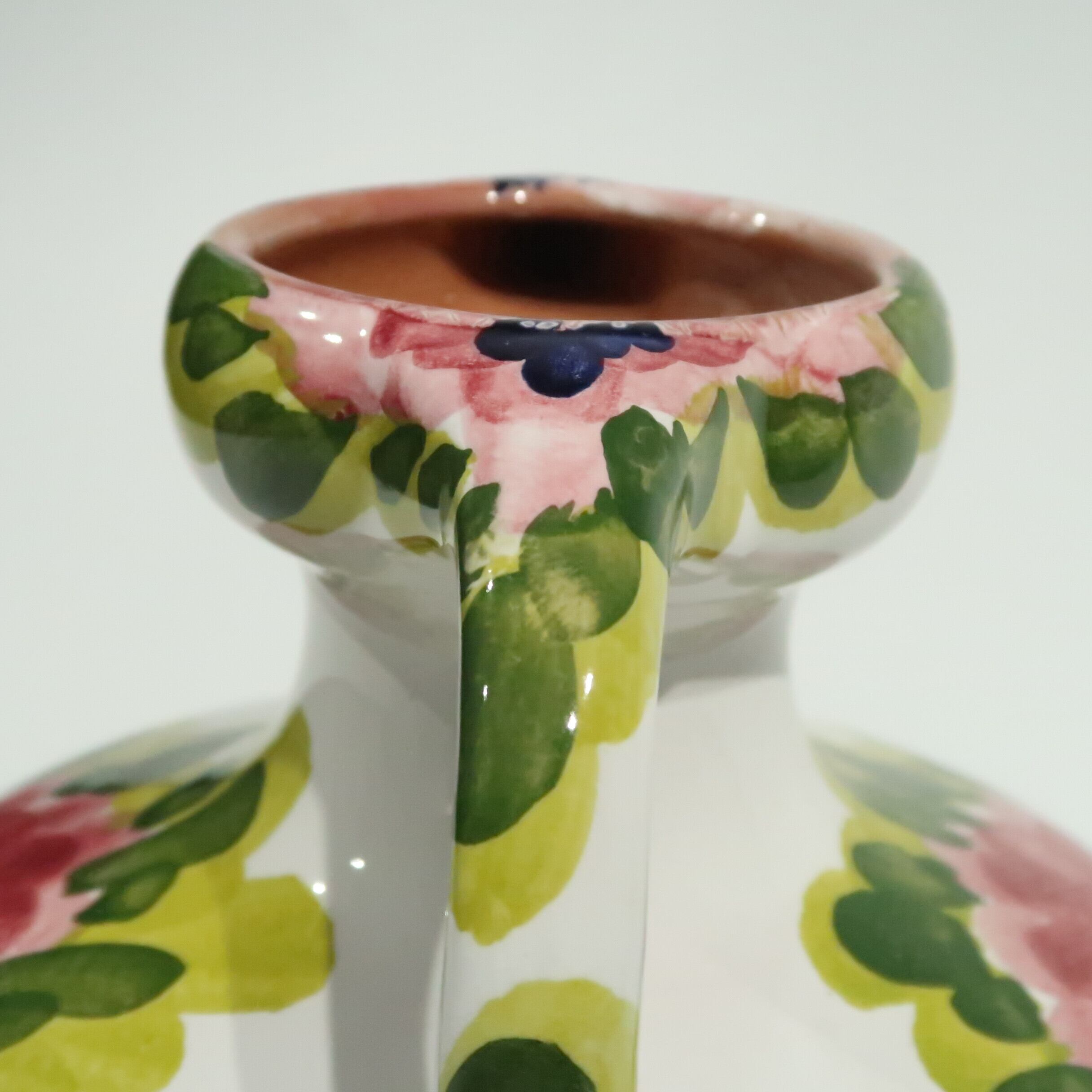 特徴的なハンドルがあしらわれ、キャンバスに描かれたような大胆で華やかなパターンが美しい花器が到着しました。