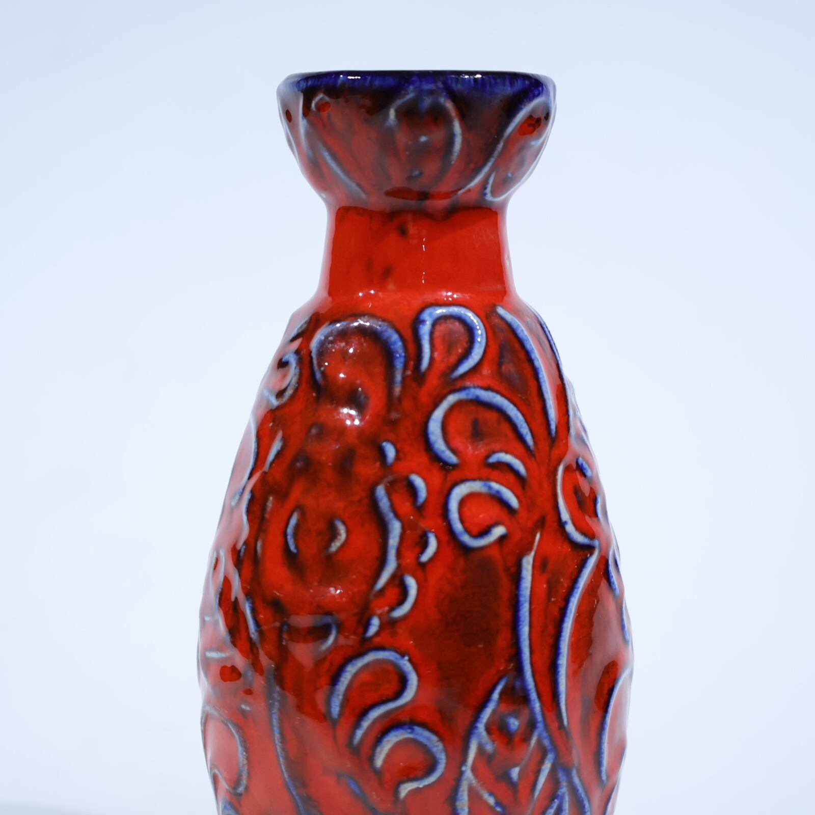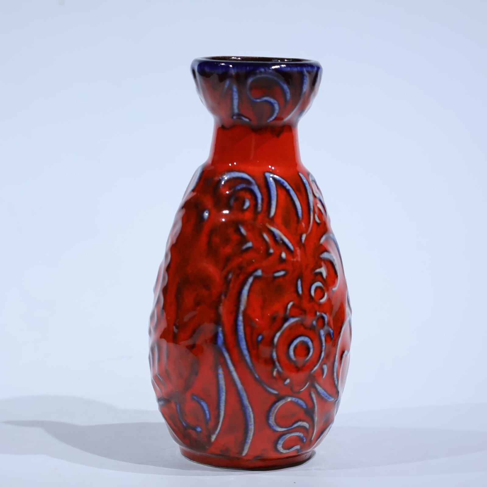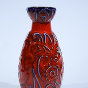 1960年代からのスタイルとしては、 当時広く流行していた色彩の釉薬(マットまたは 光沢あり)を使用し、シンプルなフォルムの上に様 式化した花の図柄の型押しや幾何学模様をあし らったものが多く、Scheurichのも のと混同されがちです。