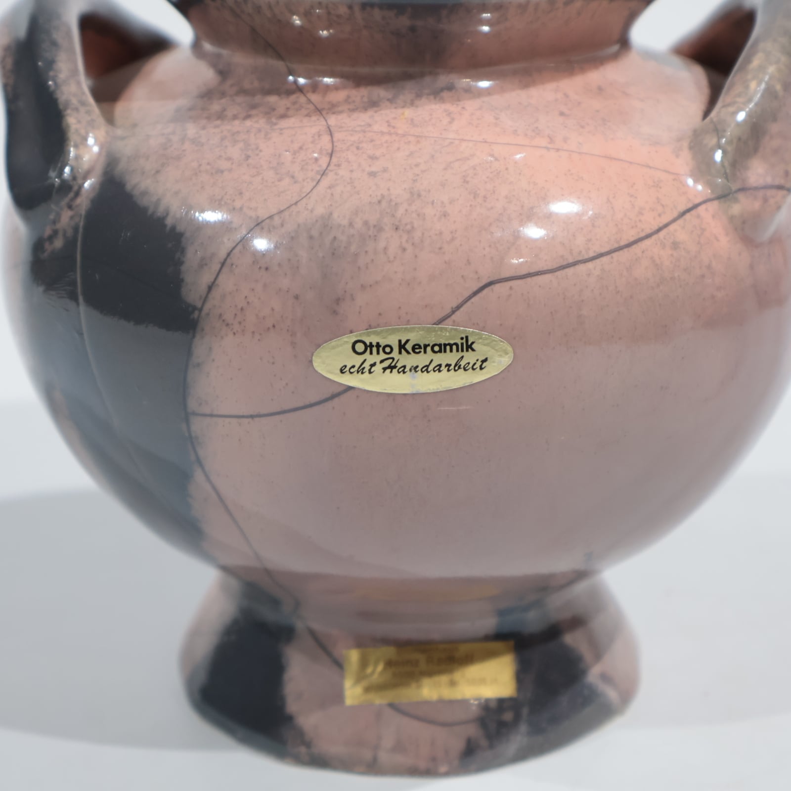 還元焼成で生成された花瓶で、内側から金属色がにじみ出る独特の風合いが特徴です。ピンクとブラックの釉薬が絶妙に混ざり合い、表面には二層の釉薬の伸縮率の違いによって生じた繊細な線が走っています。この工程によって、花瓶に一層の深みと個性が加わっています。