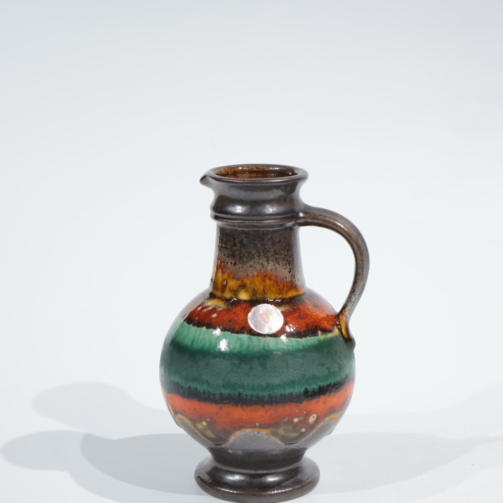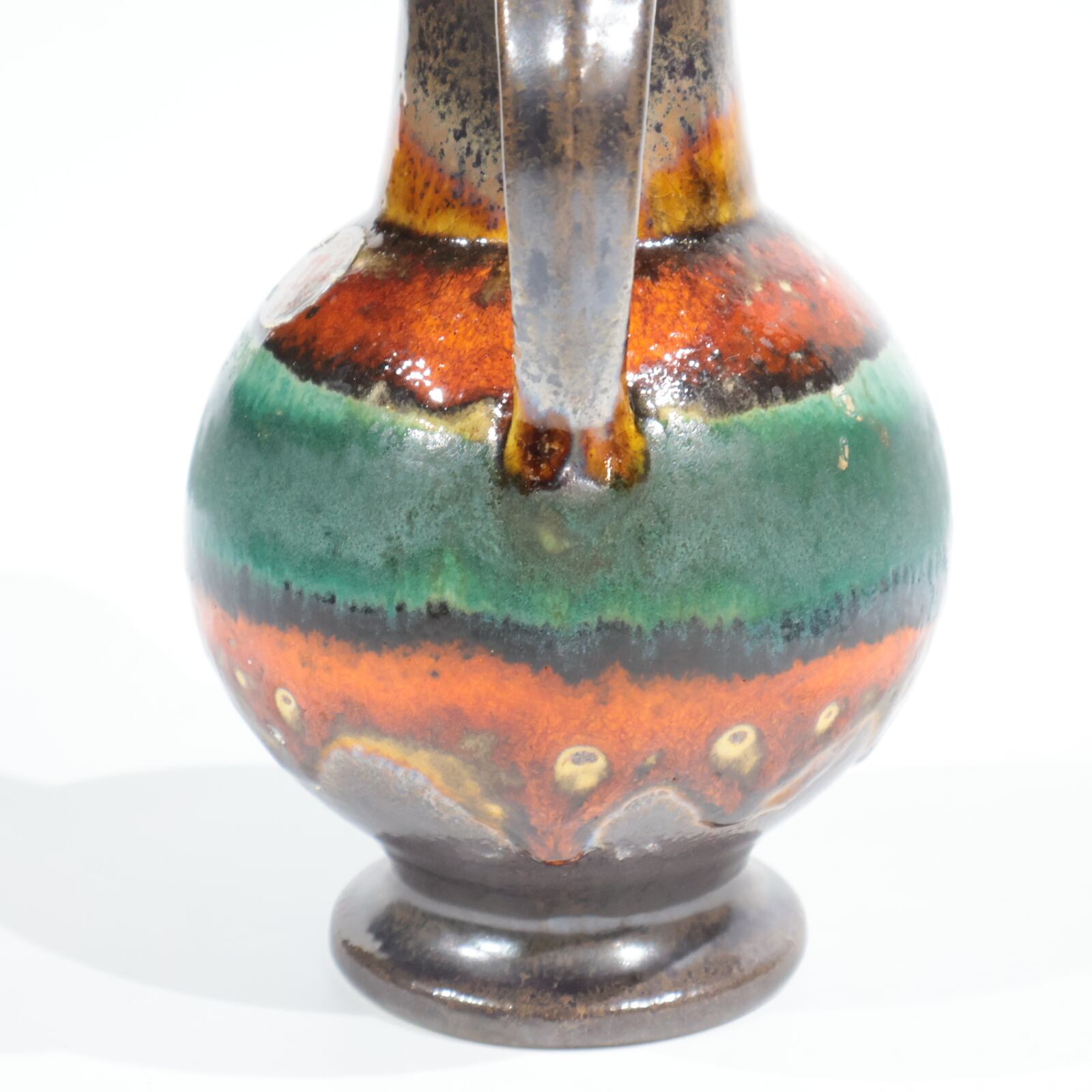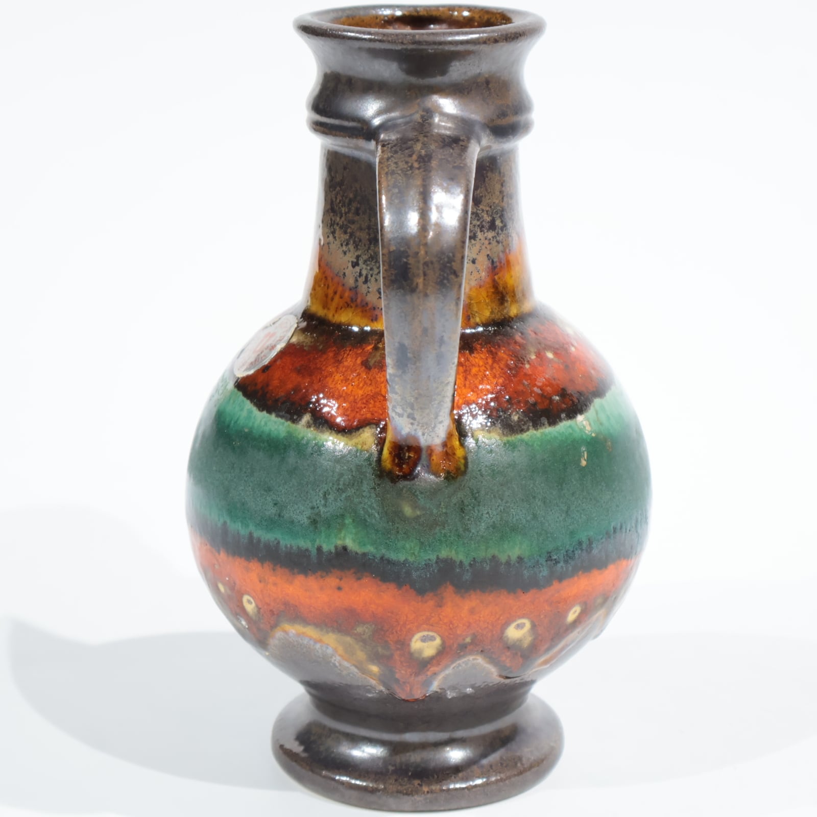 暖かみのあるブラウン、深いグリーン、そして鮮やかなオレンジの釉薬が美しく層をなしており、クラシックなフォルムと相まって視覚的に非常に魅力的です。