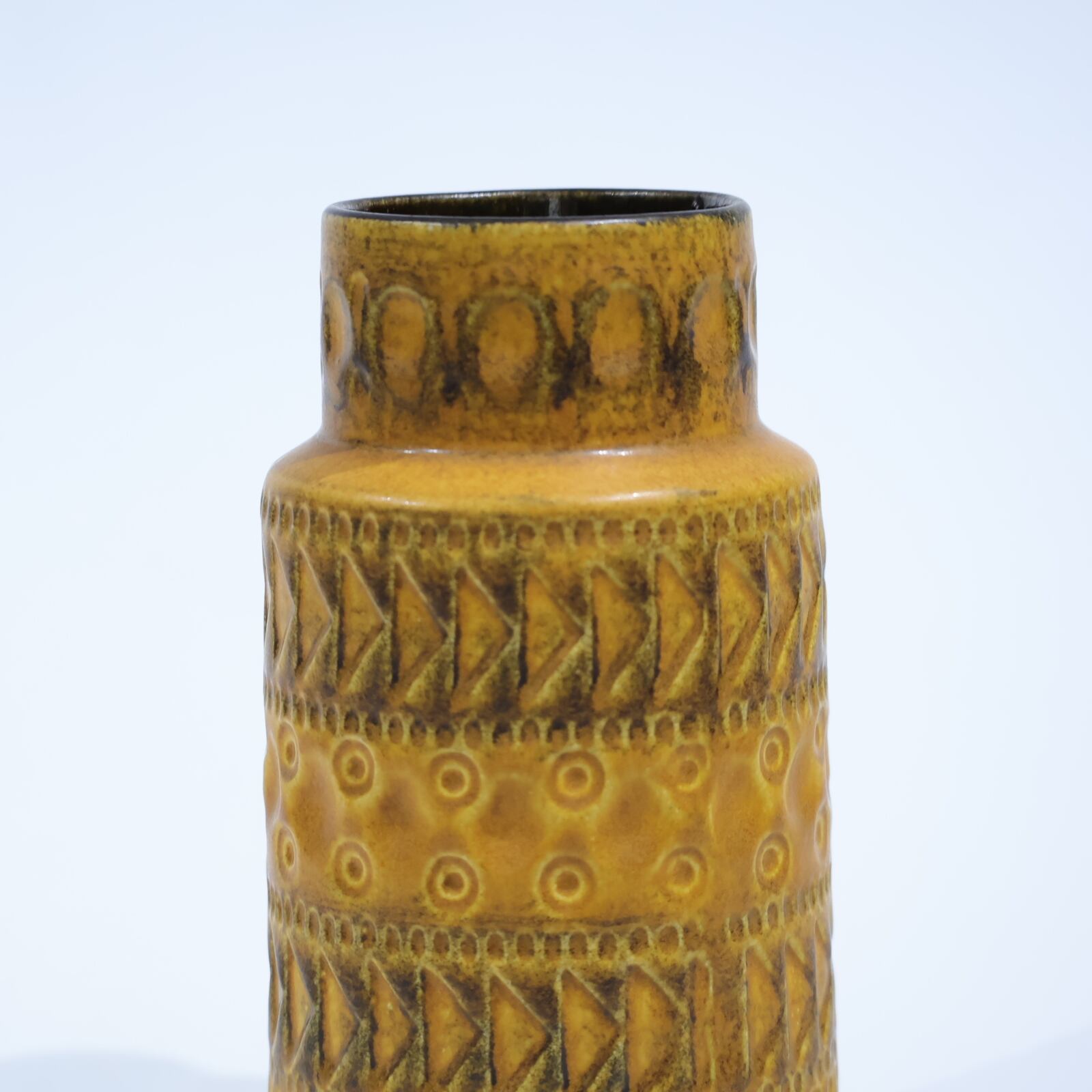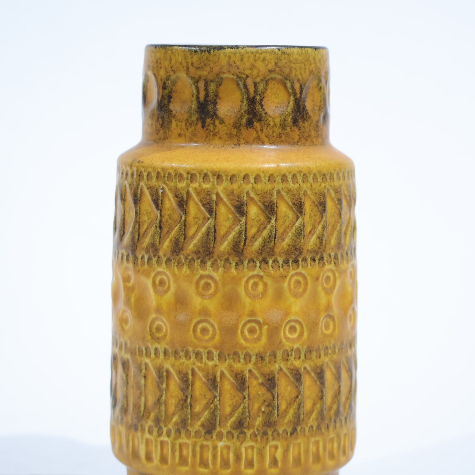 1960年代からのスタイルとしては、 当時広く流行していた色彩の釉薬(マットまたは 光沢あり)を使用し、シンプルなフォルムの上に様 式化した花の図柄の型押しや幾何学模様をあし らったものが多く、Scheurichのも のと混同されがちです。